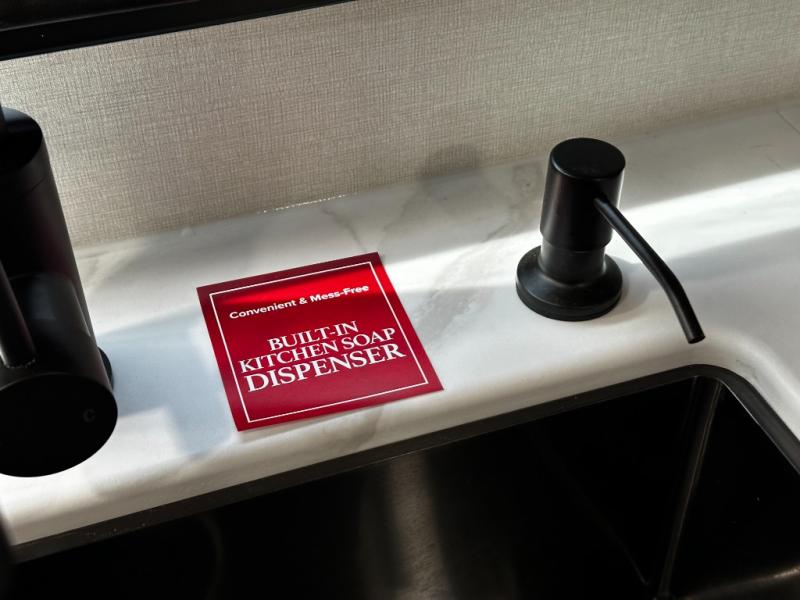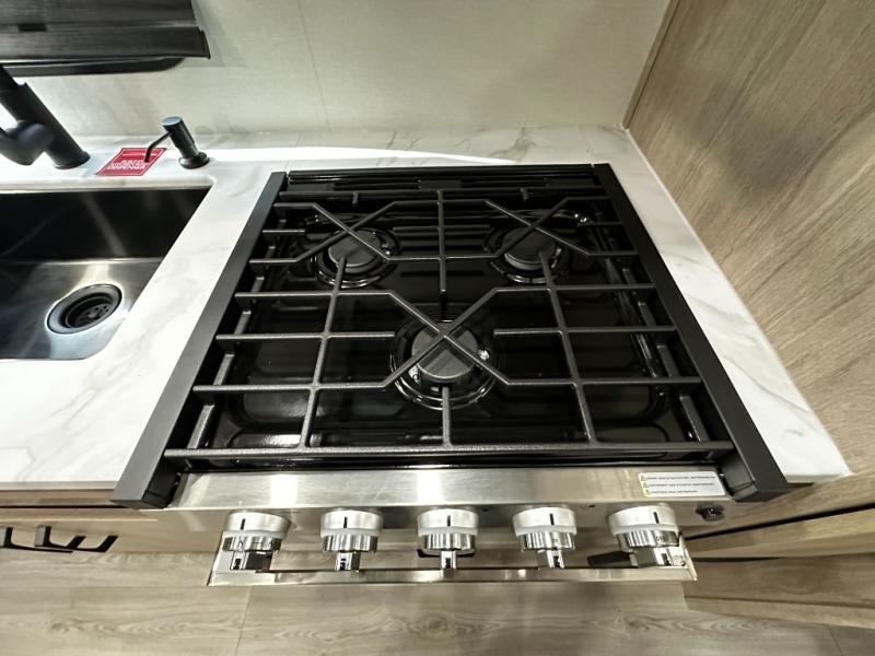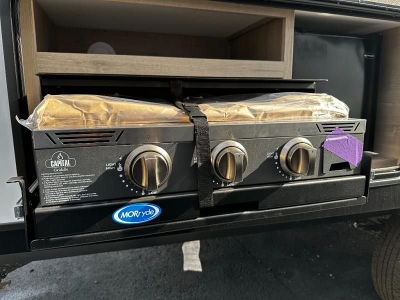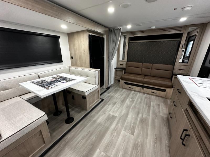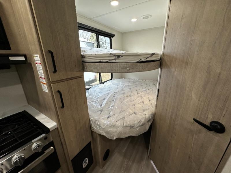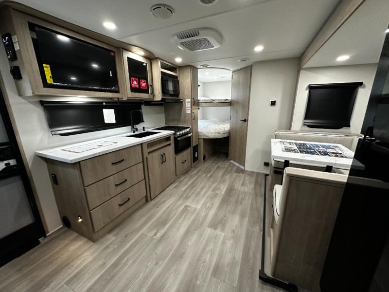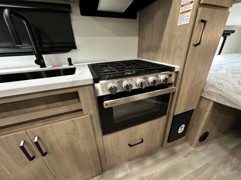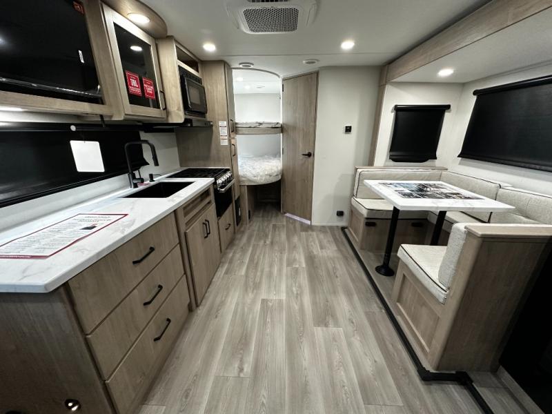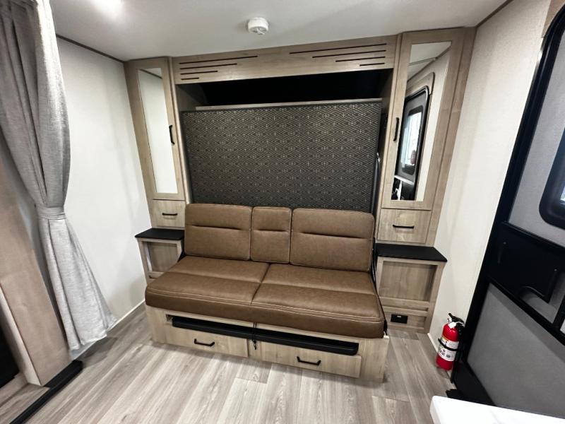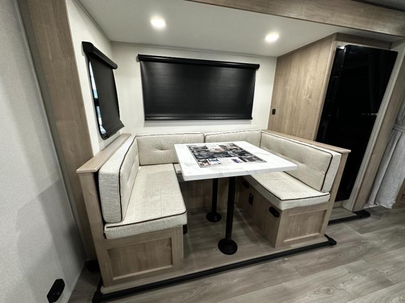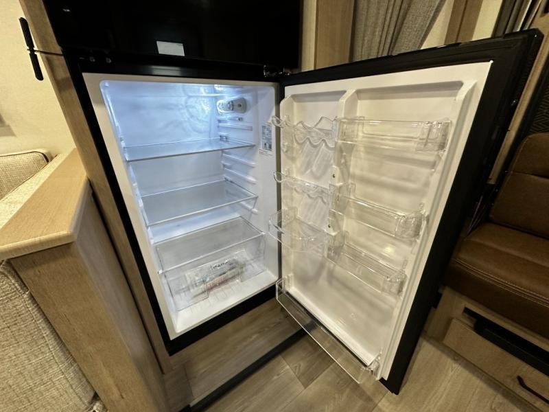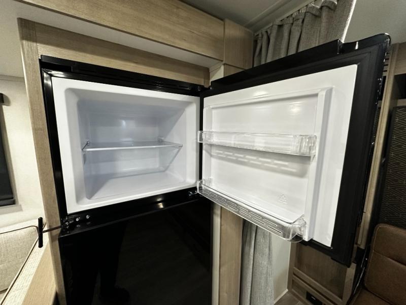 Step inside to discover a bright, open living space that feels larger than its footprint. The main common area features a dinette that doubles as a sleeping space, paired with a comfortable sofa — both ideal for relaxing, dining, or hosting friends. Large windows let in natural light while offering panoramic views of the great outdoors. The well-designed kitchen includes everything you need for meal prep on the road, with a functional countertop, storage cabinets, cooktop, and refrigerator positioned for ease of use and flow.