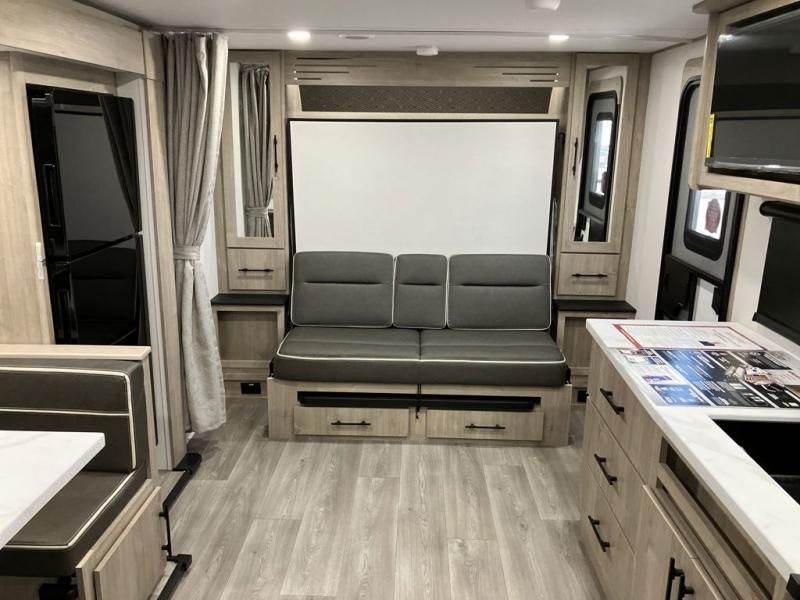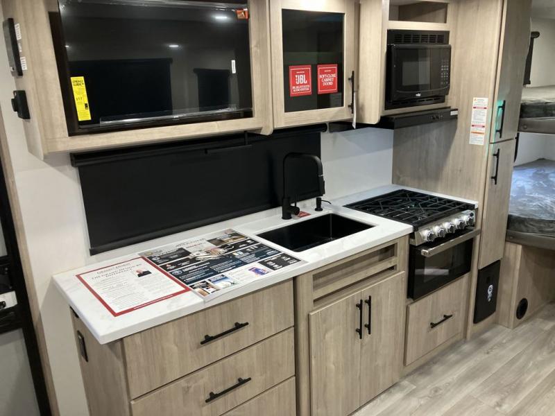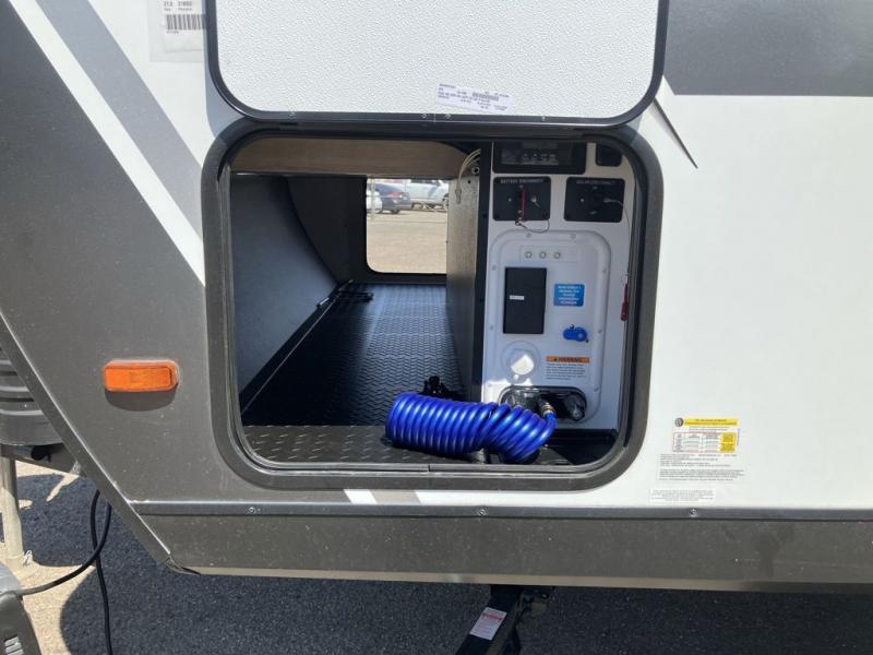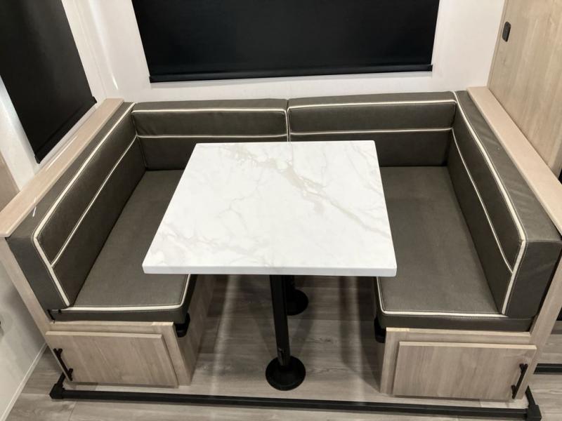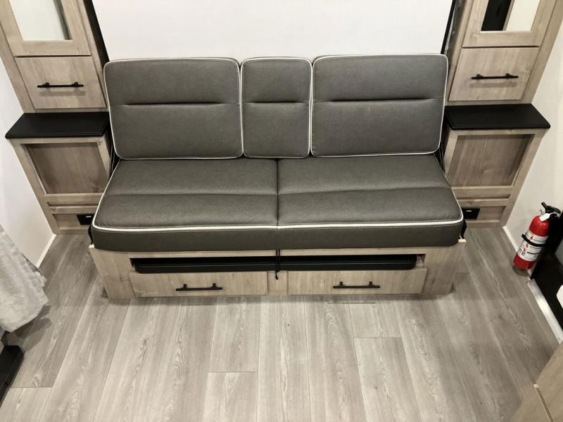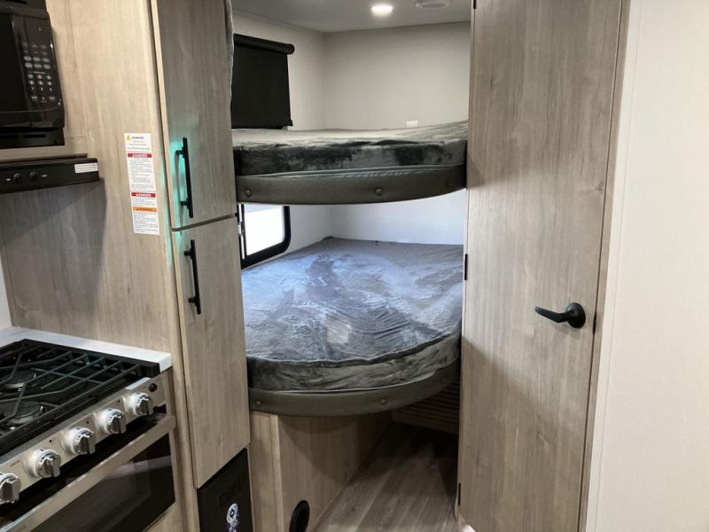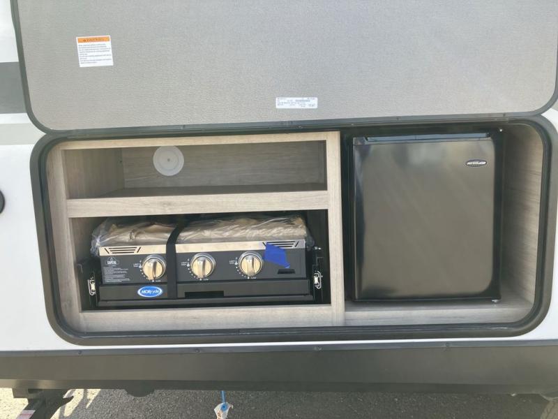 This travel trailer has everything you need for a great vacation! You will never miss home when you see all of the amenities included on this trailer. There is a full bathroom for easy morning routines, a set of 47" x 76" double over double-size bunks with privacy curtains for compact sleeping, a U-shaped dinette for meal times, and a full kitchen with all of the appliances needed for filling meals. You could even switch out the dinette for an optional theater dinette. The front Murphy bed not only provides versatility with a bed to sleep on at night, and a seating area during the day, but also a removable interior/exterior table. In addition to all of that, you'll also find an outdoor griddle and 1.6 cu. ft. refrigerator that you can use when the weather is nice. The unobstructed pass-through storage will be able to store your fishing poles and sports equipment while you travel.