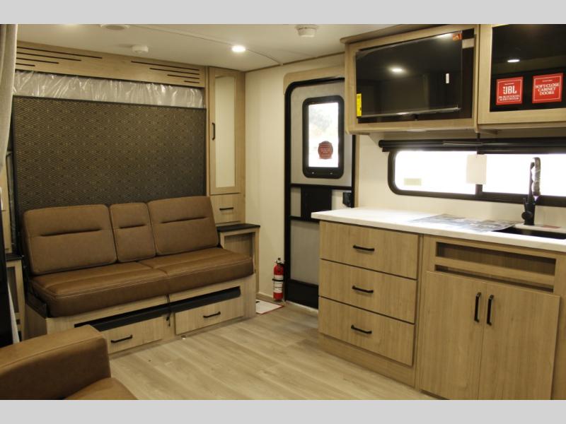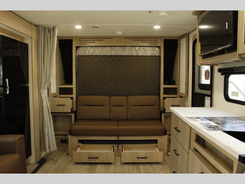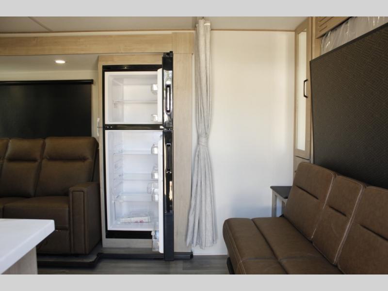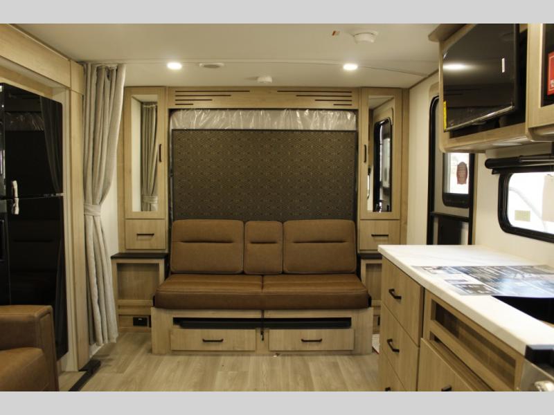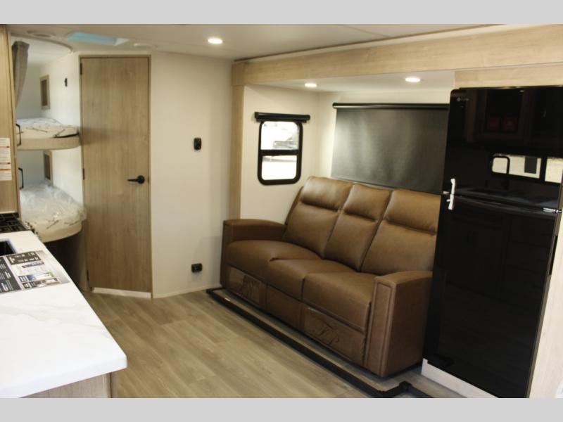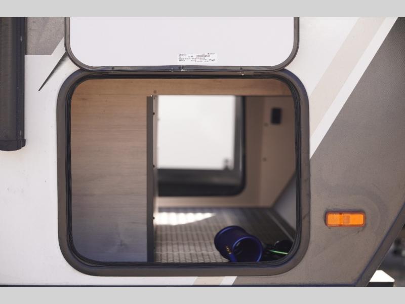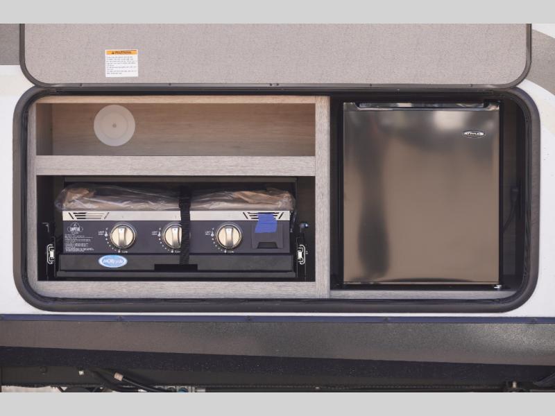 This travel trailer has everything you need for a great vacation! You will never miss home when you see all of the amenities included on this trailer. There is a full bathroom for easy morning routines, a set of 47" x 76" double over double-size bunks with privacy curtains for compact sleeping, a U-shaped dinette for meal times, and a full kitchen with all of the appliances needed for filling meals. You could even switch out the dinette for an optional theater dinette. The front Murphy bed not only provides versatility with a bed to sleep on at night, and a seating area during the day, but also a removable interior/exterior table. In addition to all of that, you'll also find an outdoor griddle and 1.6 cu. ft. refrigerator that you can use when the weather is nice. The unobstructed pass-through storage will be able to store your fishing poles and sports equipment while you travel.