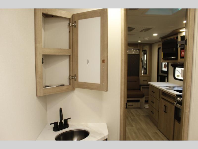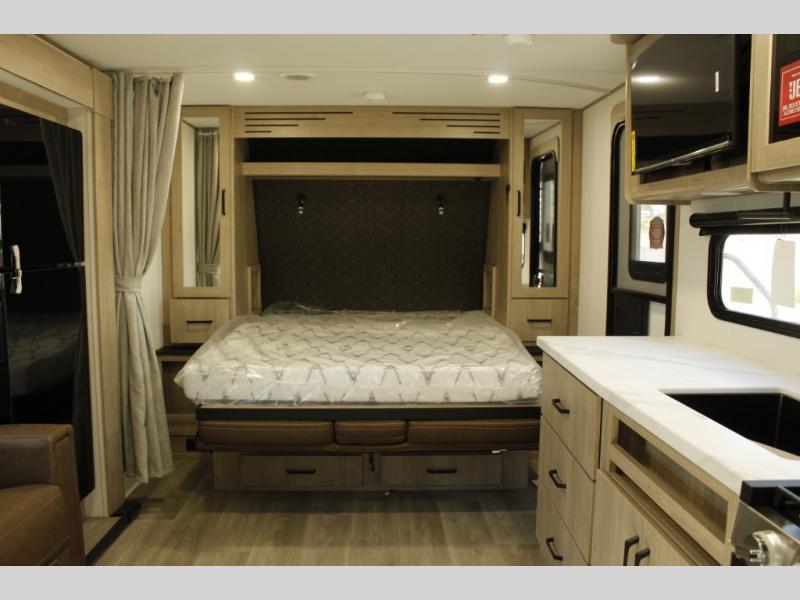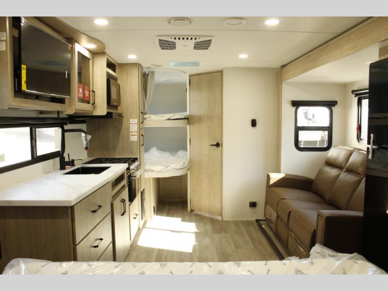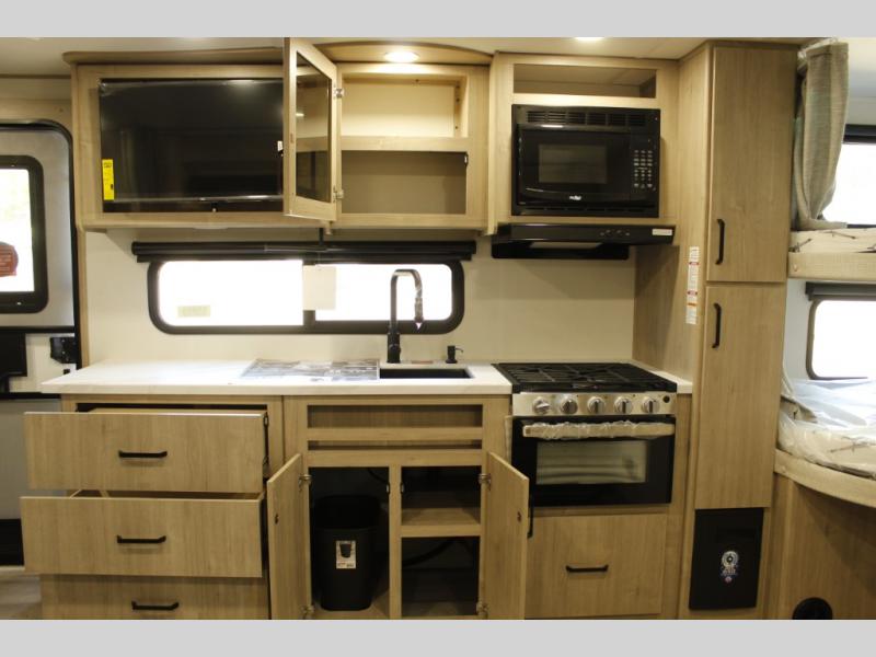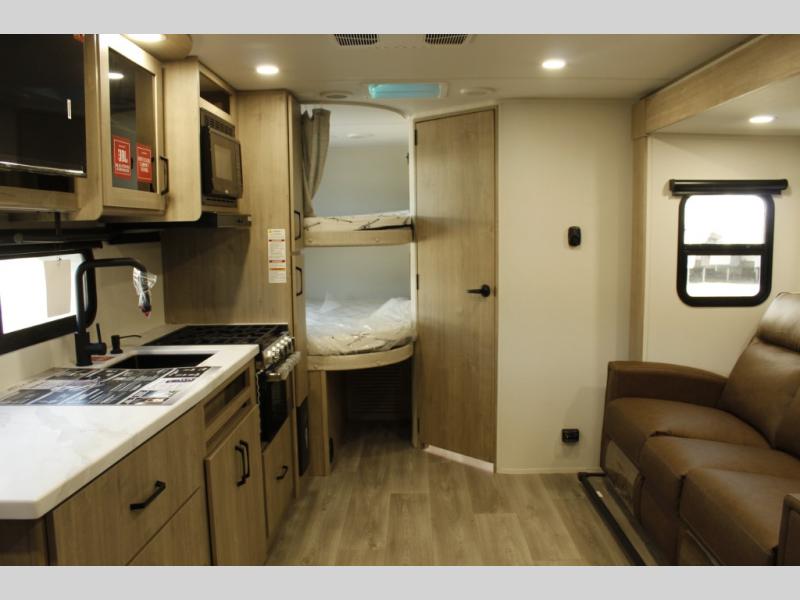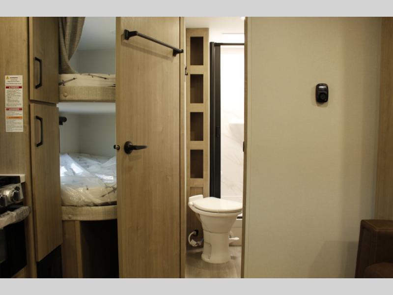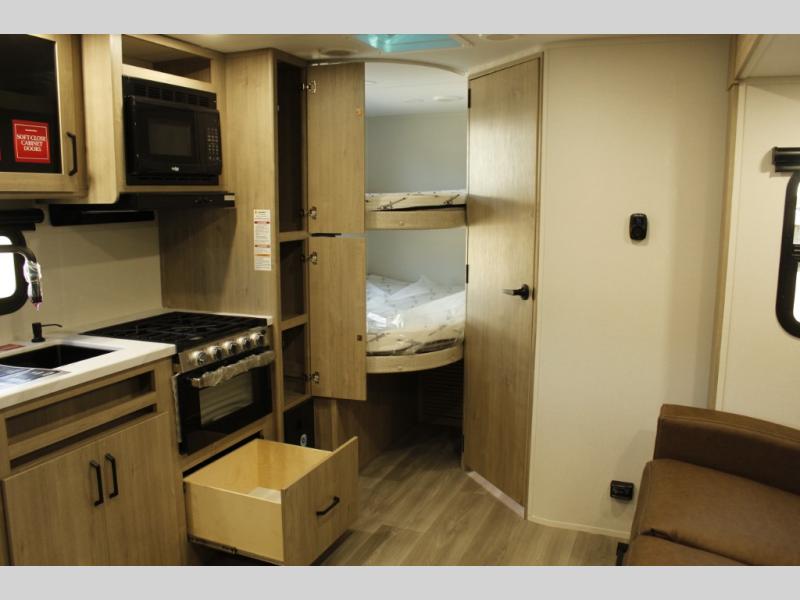 This travel trailer has everything you need for a great vacation! You will never miss home when you see all of the amenities included on this trailer. There is a full bathroom for easy morning routines, a set of 47" x 76" double over double-size bunks with privacy curtains for compact sleeping, a U-shaped dinette for meal times, and a full kitchen with all of the appliances needed for filling meals. You could even switch out the dinette for an optional theater dinette. The front Murphy bed not only provides versatility with a bed to sleep on at night, and a seating area during the day, but also a removable interior/exterior table. In addition to all of that, you'll also find an outdoor griddle and 1.6 cu. ft. refrigerator that you can use when the weather is nice. The unobstructed pass-through storage will be able to store your fishing poles and sports equipment while you travel.