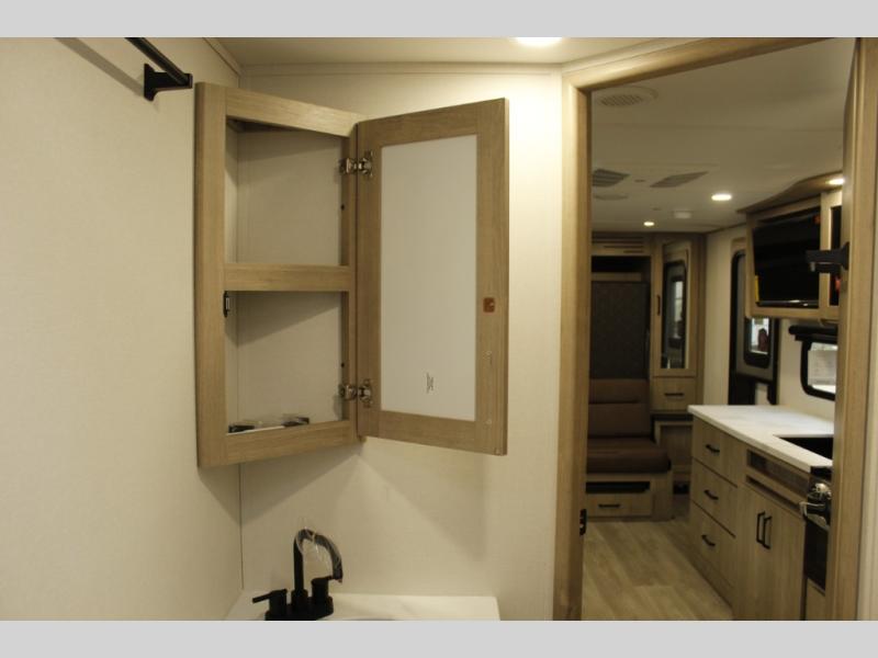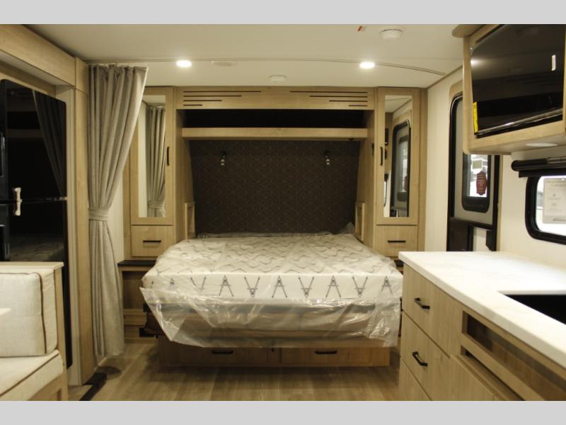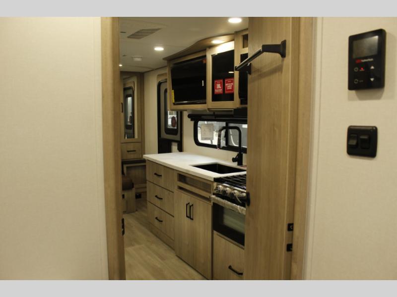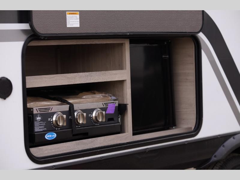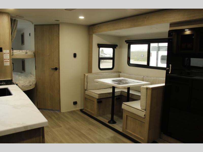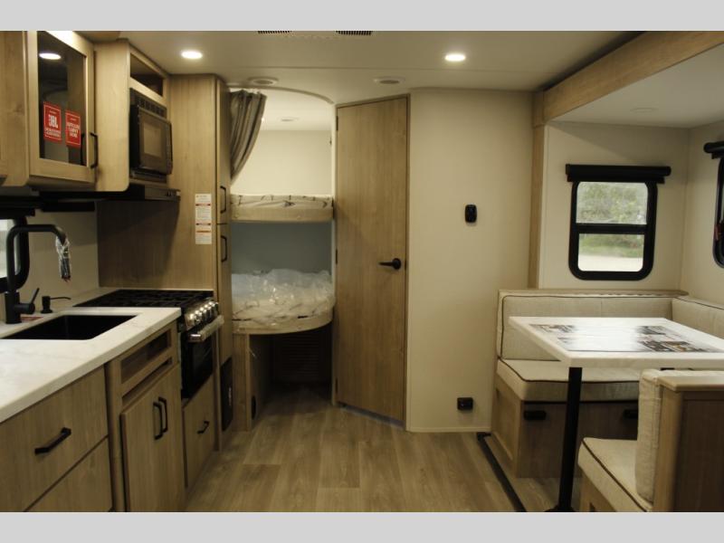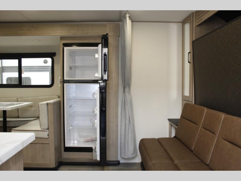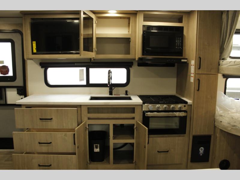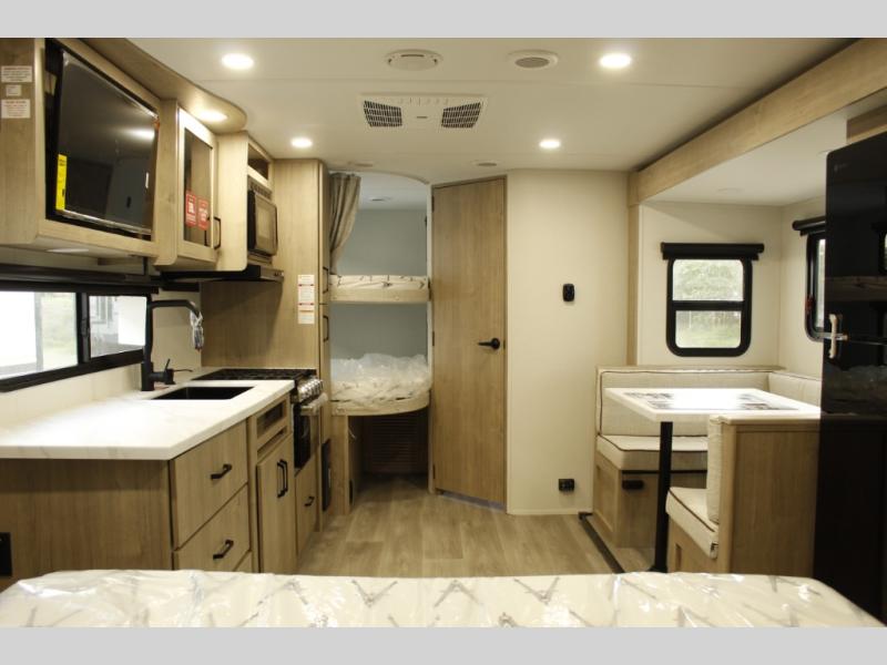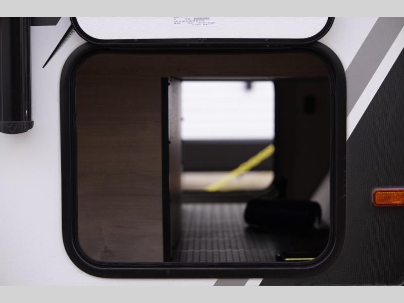 This travel trailer has everything you need for a great vacation! You will never miss home when you see all of the amenities included on this trailer. There is a full bathroom for easy morning routines, a set of 47" x 76" double over double-size bunks with privacy curtains for compact sleeping, a U-shaped dinette for meal times, and a full kitchen with all of the appliances needed for filling meals. You could even switch out the dinette for an optional theater dinette. The front Murphy bed not only provides versatility with a bed to sleep on at night, and a seating area during the day, but also a removable interior/exterior table. In addition to all of that, you'll also find an outdoor griddle and 1.6 cu. ft. refrigerator that you can use when the weather is nice. The unobstructed pass-through storage will be able to store your fishing poles and sports equipment while you travel.