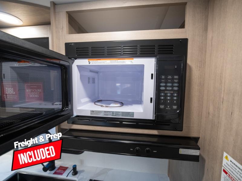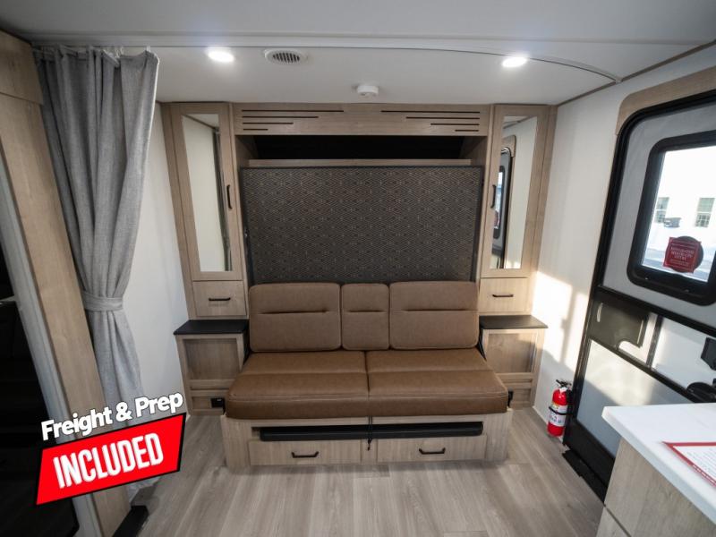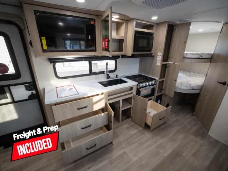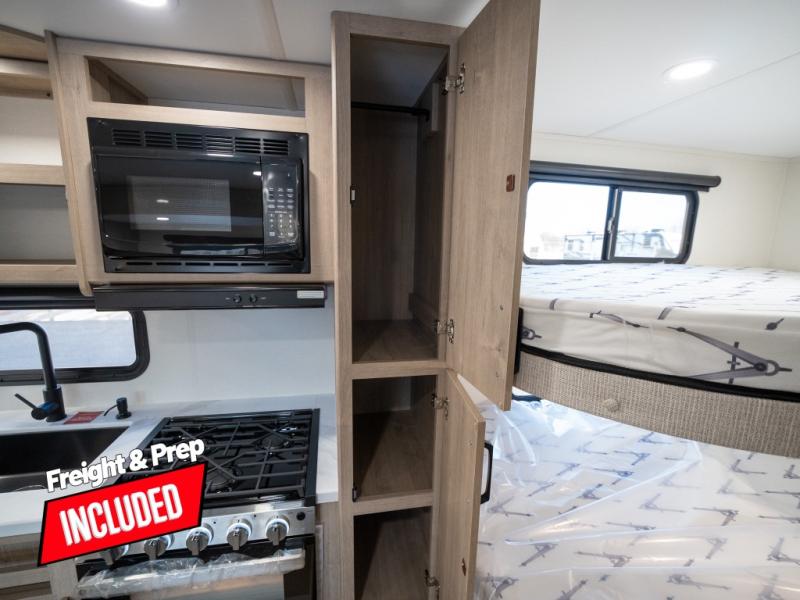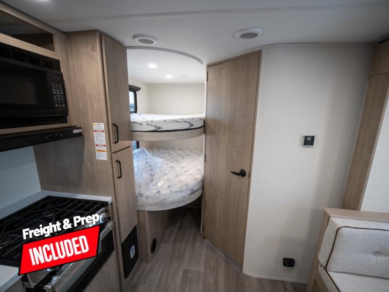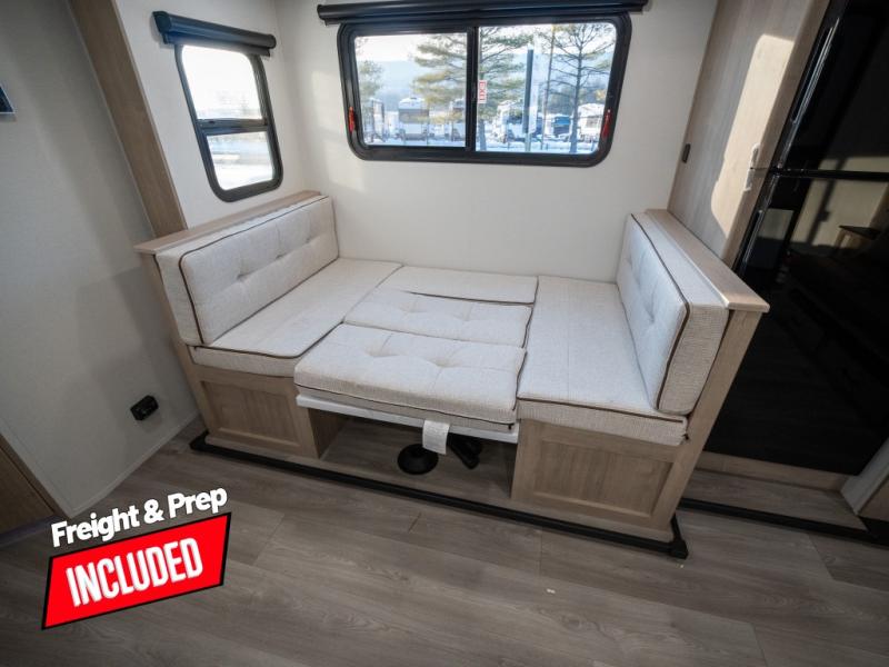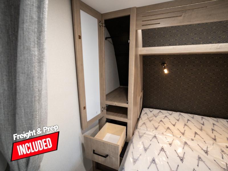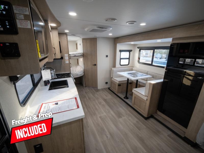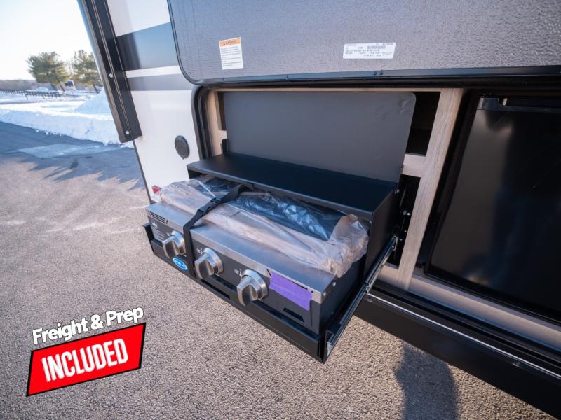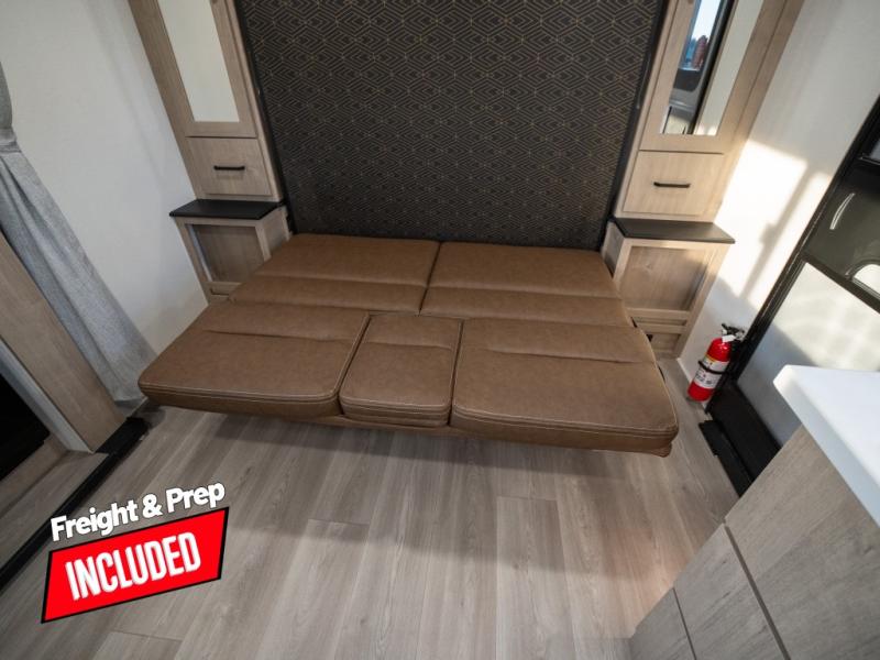 This travel trailer has everything you need for a great vacation! You will never miss home when you see all of the amenities included on this trailer. There is a full bathroom for easy morning routines, a set of 47" x 76" double over double-size bunks with privacy curtains for compact sleeping, a U-shaped dinette for meal times, and a full kitchen with all of the appliances needed for filling meals. You could even switch out the dinette for an optional theater dinette. The front Murphy bed not only provides versatility with a bed to sleep on at night, and a seating area during the day, but also a removable interior/exterior table. In addition to all of that, you'll also find an outdoor griddle and 1.6 cu. ft. refrigerator that you can use when the weather is nice. The unobstructed pass-through storage will be able to store your fishing poles and sports equipment while you travel.