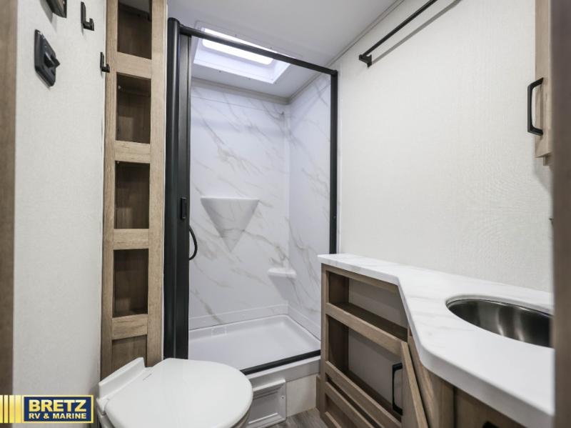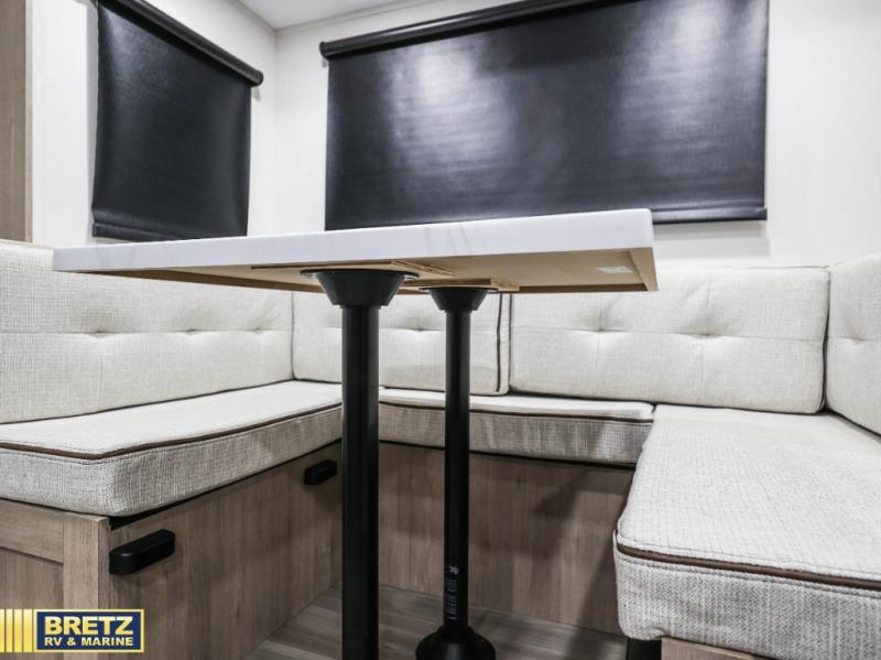 This travel trailer has everything you need for a great vacation! You will never miss home when you see all of the amenities included on this trailer. There is a full bathroom for easy morning routines, a set of 47" x 76" double over double-size bunks with privacy curtains for compact sleeping, a U-shaped dinette for meal times, and a full kitchen with all of the appliances needed for filling meals. You could even switch out the dinette for an optional theater dinette. The front Murphy bed not only provides versatility with a bed to sleep on at night, and a seating area during the day, but also a removable interior/exterior table. In addition to all of that, you'll also find an outdoor griddle and 1.6 cu. ft. refrigerator that you can use when the weather is nice. The unobstructed pass-through storage will be able to store your fishing poles and sports equipment while you travel.