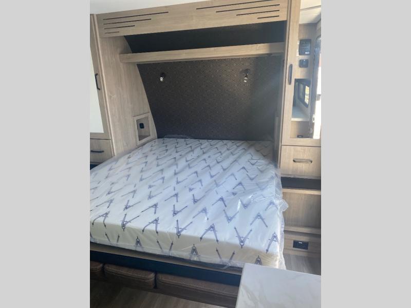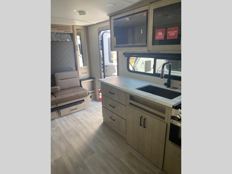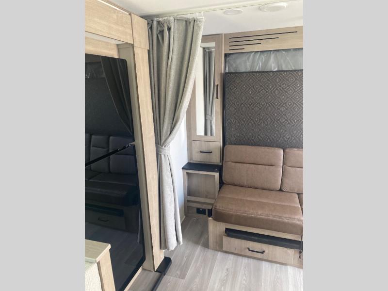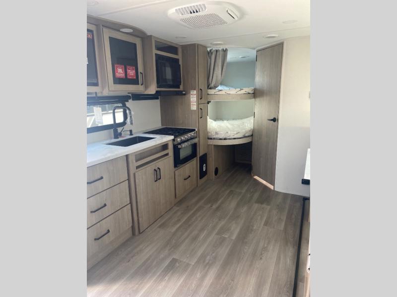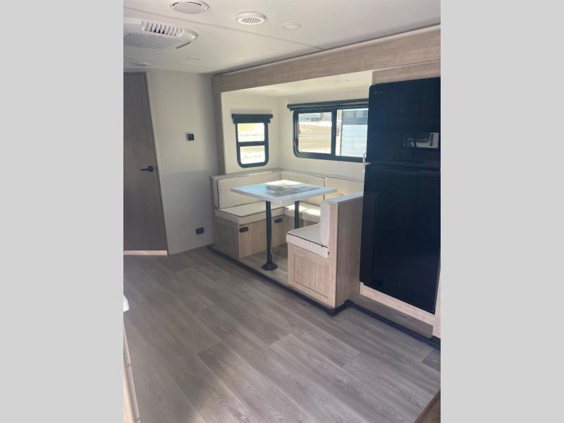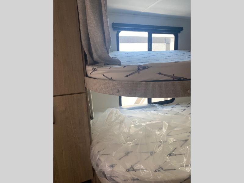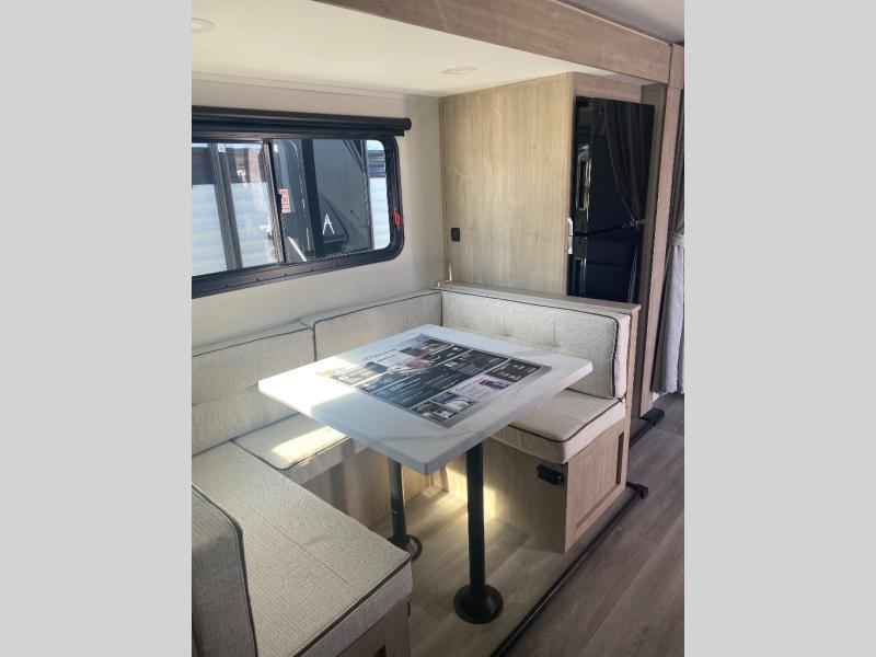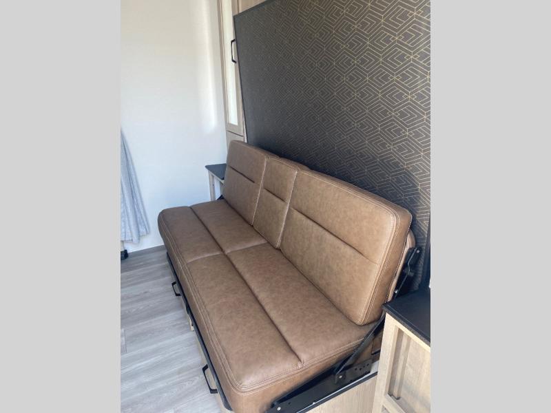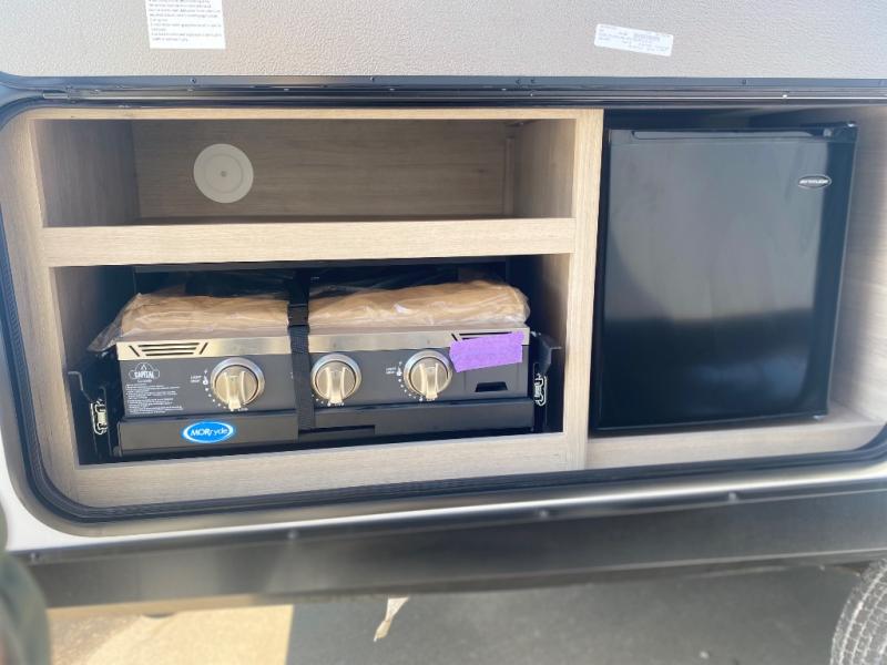 This travel trailer has everything you need for a great vacation! You will never miss home when you see all of the amenities included on this trailer. There is a full bathroom for easy morning routines, a set of 47" x 76" double over double-size bunks with privacy curtains for compact sleeping, a U-shaped dinette for meal times, and a full kitchen with all of the appliances needed for filling meals. You could even switch out the dinette for an optional theater dinette. The front Murphy bed not only provides versatility with a bed to sleep on at night, and a seating area during the day, but also a removable interior/exterior table. In addition to all of that, you'll also find an outdoor griddle and 1.6 cu. ft. refrigerator that you can use when the weather is nice. The unobstructed pass-through storage will be able to store your fishing poles and sports equipment while you travel.