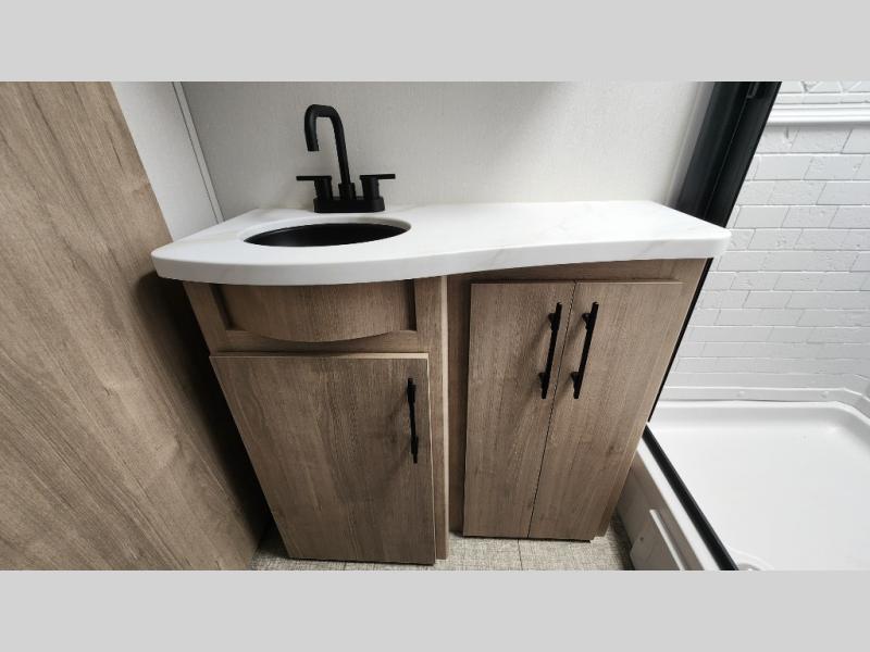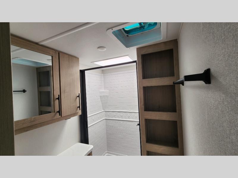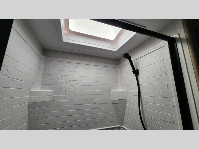 Full rear bathroom with a walk-in shower and skylight for extra headroom and natural light
