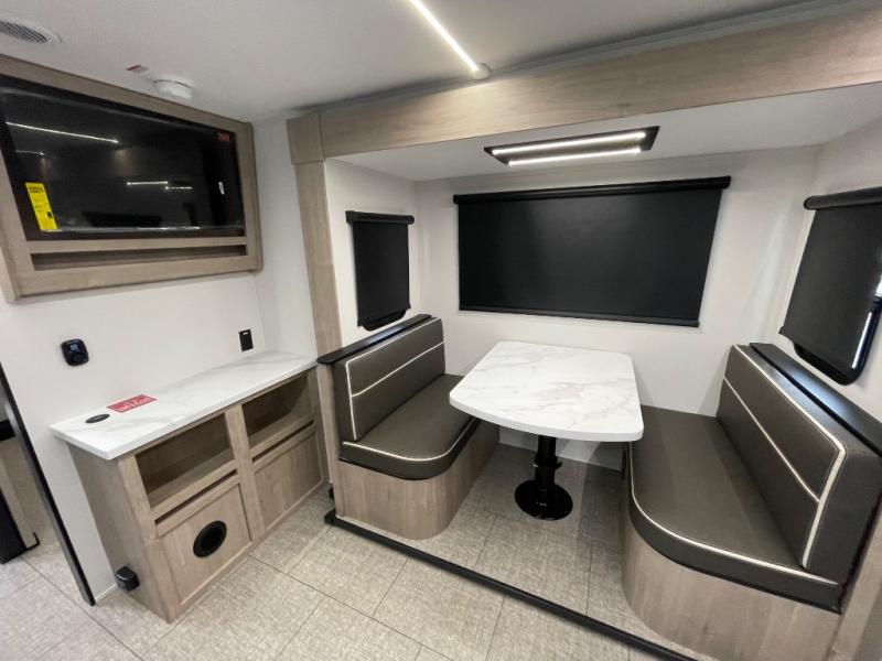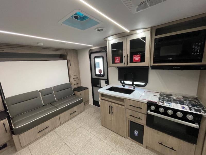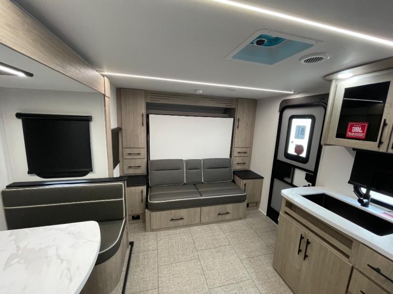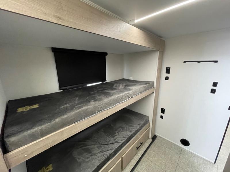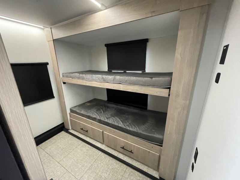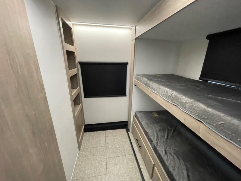 Your family will love camping in this spacious and versatile trailer thanks to the double slides and Murphy bed provided. During the day the Murphy bed is tucked away to provide more space and seating, and at night when folded down, there is a curtain for some privacy as you sleep. The booth dinette slides out to provide even more space and features windows on three sides so you can look out at your surroundings while you enjoy breakfast. The 30" flip top and bottom bunks each have some privacy with the sliding door, and the bunks are right next to the full bathroom for easy access in the middle of the night. The kitchen features everything you need to create meals and snacks as you travel, and you can have some more prep space by using the flip-up countertop extension.
