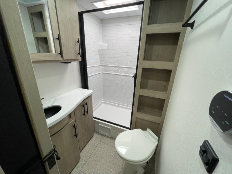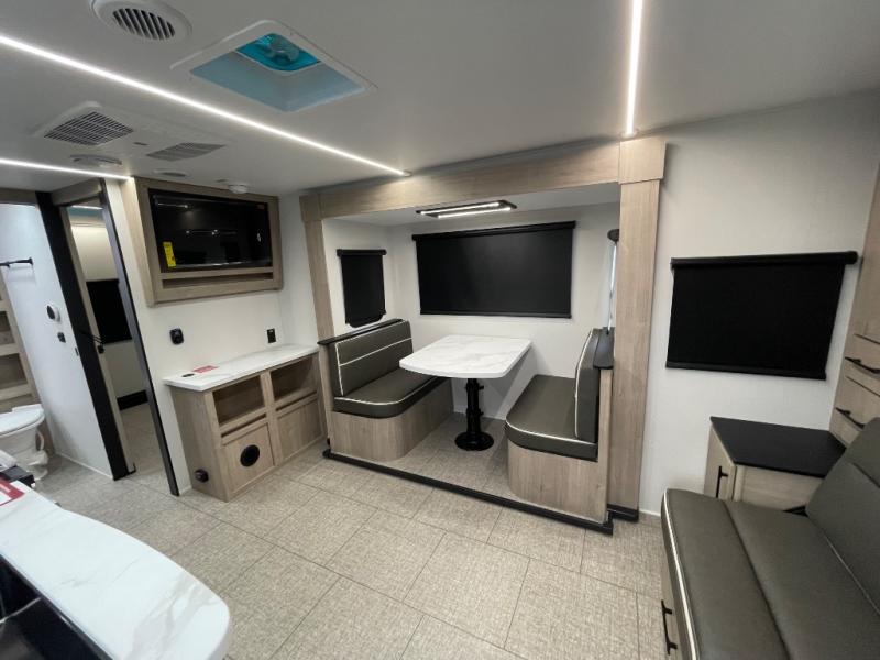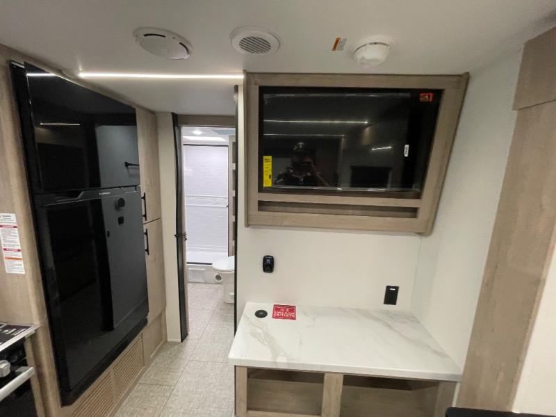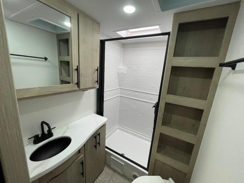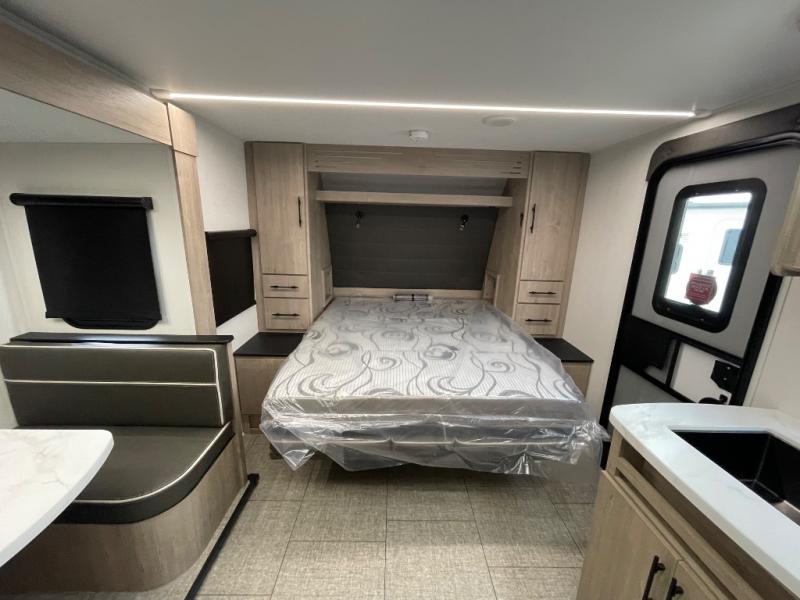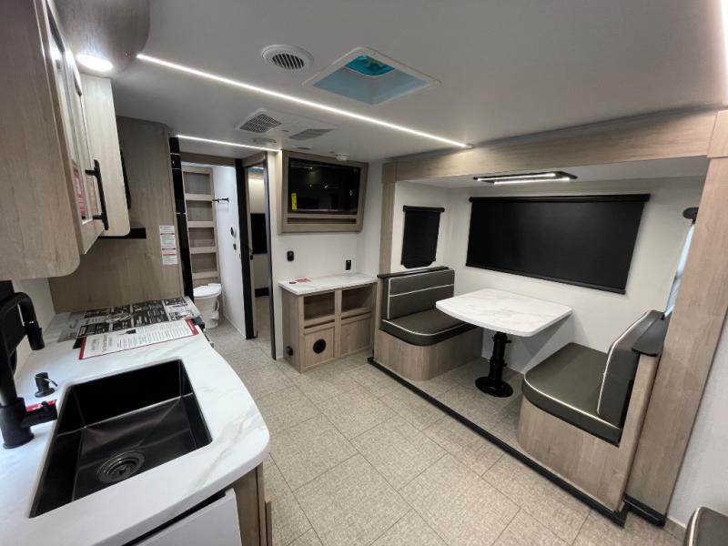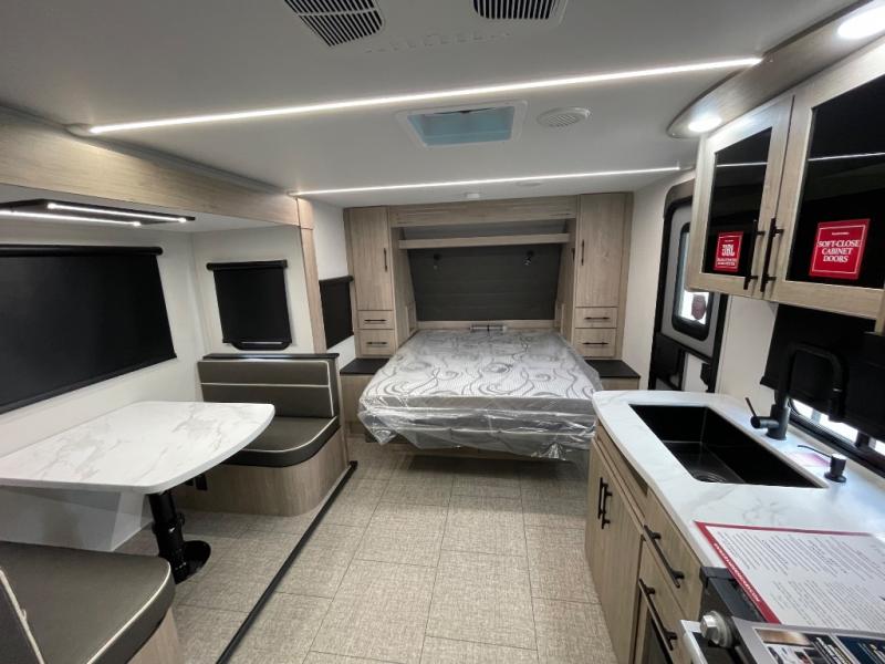 Your family will love camping in this spacious and versatile trailer thanks to the double slides and Murphy bed provided. During the day the Murphy bed is tucked away to provide more space and seating, and at night when folded down, there is a curtain for some privacy as you sleep. The booth dinette slides out to provide even more space and features windows on three sides so you can look out at your surroundings while you enjoy breakfast. The 30" flip top and bottom bunks each have some privacy with the sliding door, and the bunks are right next to the full bathroom for easy access in the middle of the night. The kitchen features everything you need to create meals and snacks as you travel, and you can have some more prep space by using the flip-up countertop extension.