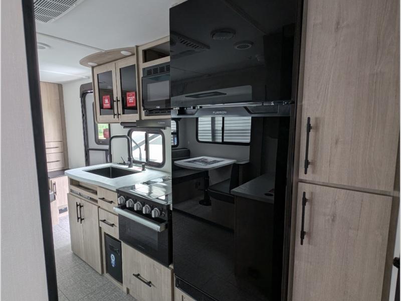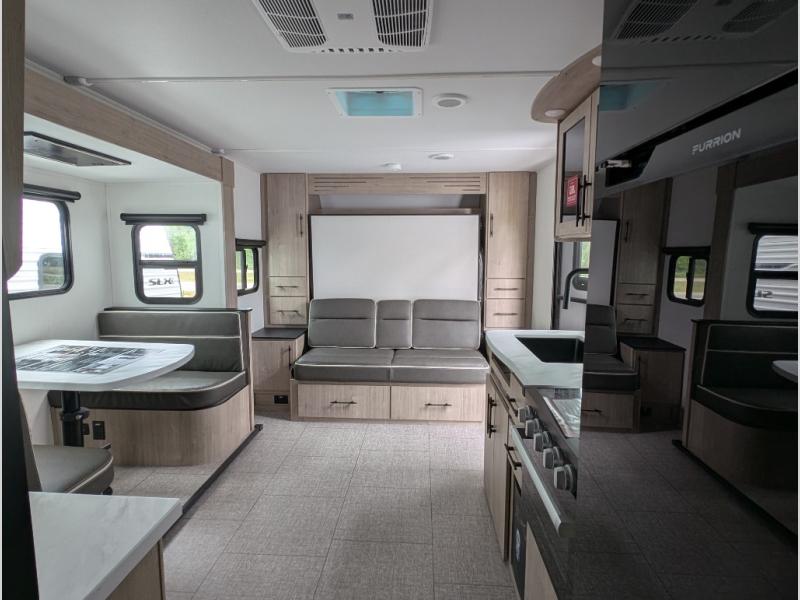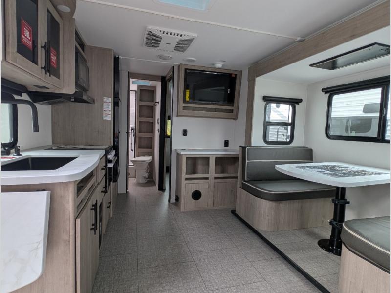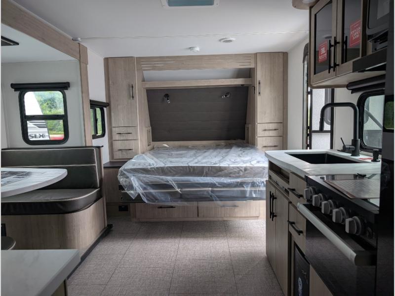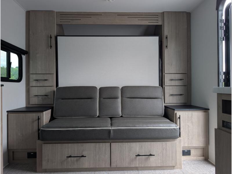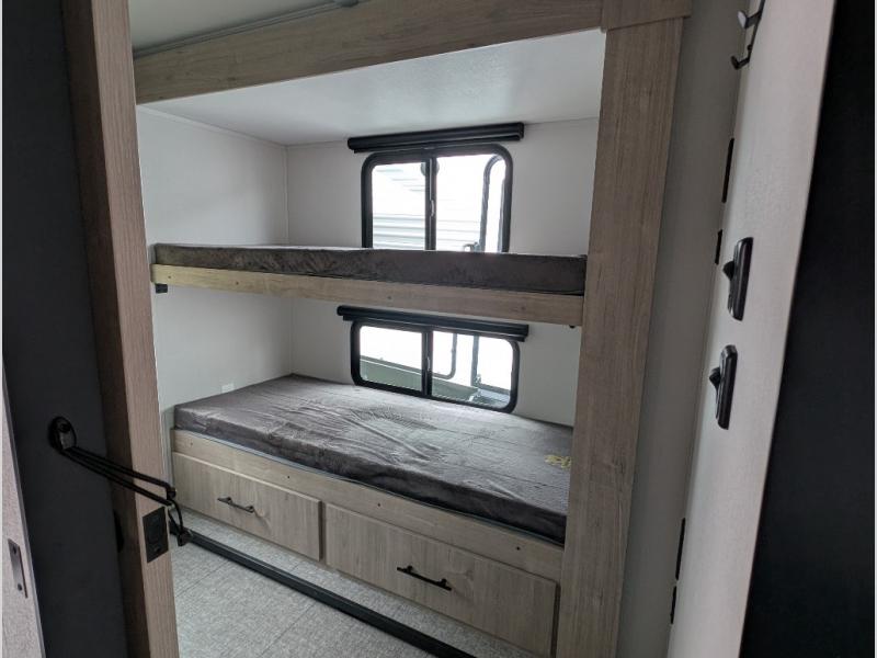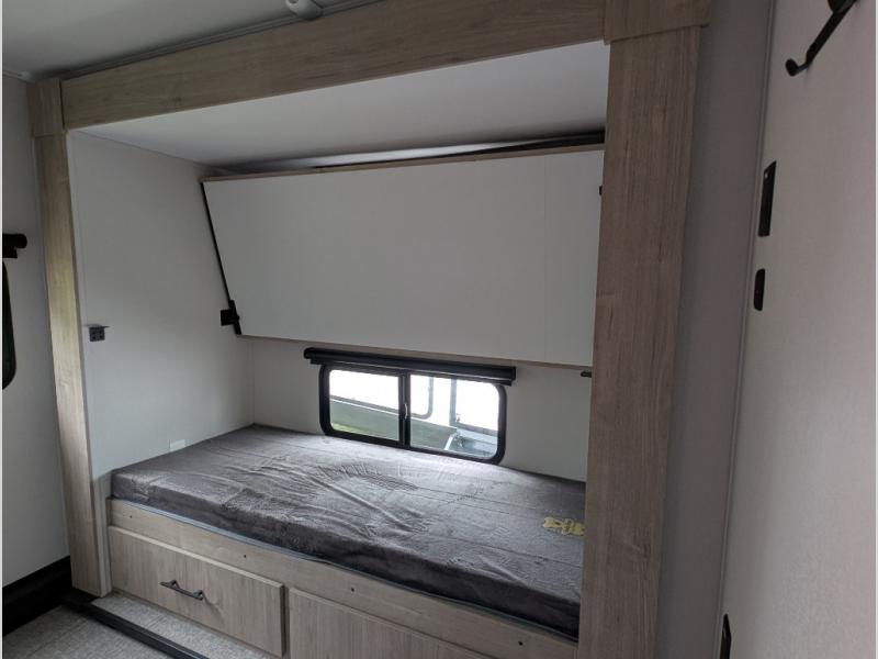 Your family will love camping in this spacious and versatile trailer thanks to the double slides and Murphy bed provided. During the day the Murphy bed is tucked away to provide more space and seating, and at night when folded down, there is a curtain for some privacy as you sleep. The booth dinette slides out to provide even more space and features windows on three sides so you can look out at your surroundings while you enjoy breakfast. The 30" flip top and bottom bunks each have some privacy with the sliding door, and the bunks are right next to the full bathroom for easy access in the middle of the night. The kitchen features everything you need to create meals and snacks as you travel, and you can have some more prep space by using the flip-up countertop extension.