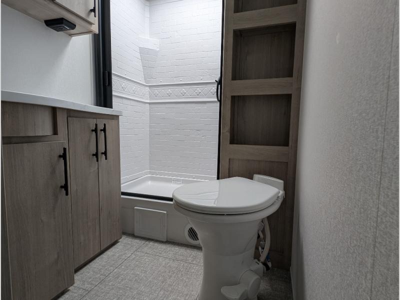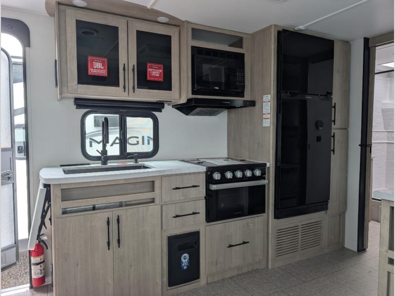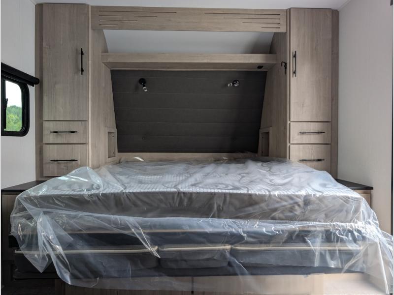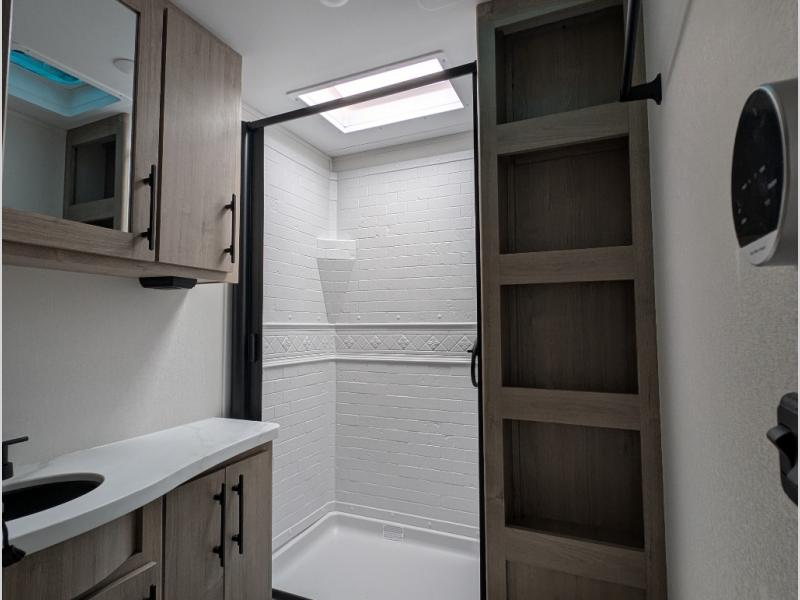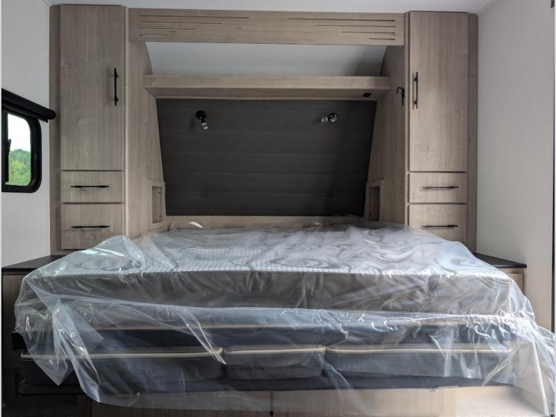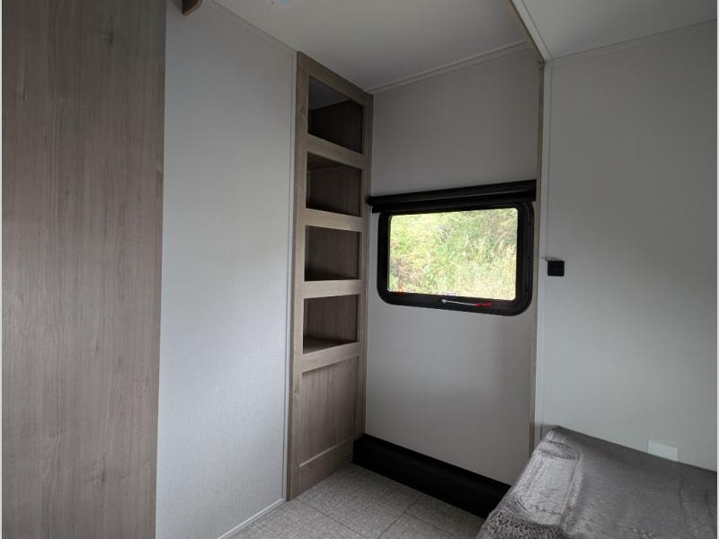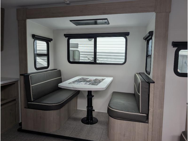 Your family will love camping in this spacious and versatile trailer thanks to the double slides and Murphy bed provided. During the day the Murphy bed is tucked away to provide more space and seating, and at night when folded down, there is a curtain for some privacy as you sleep. The booth dinette slides out to provide even more space and features windows on three sides so you can look out at your surroundings while you enjoy breakfast. The 30" flip top and bottom bunks each have some privacy with the sliding door, and the bunks are right next to the full bathroom for easy access in the middle of the night. The kitchen features everything you need to create meals and snacks as you travel, and you can have some more prep space by using the flip-up countertop extension.