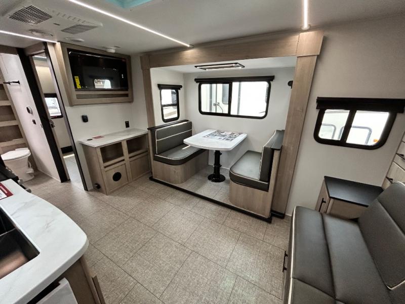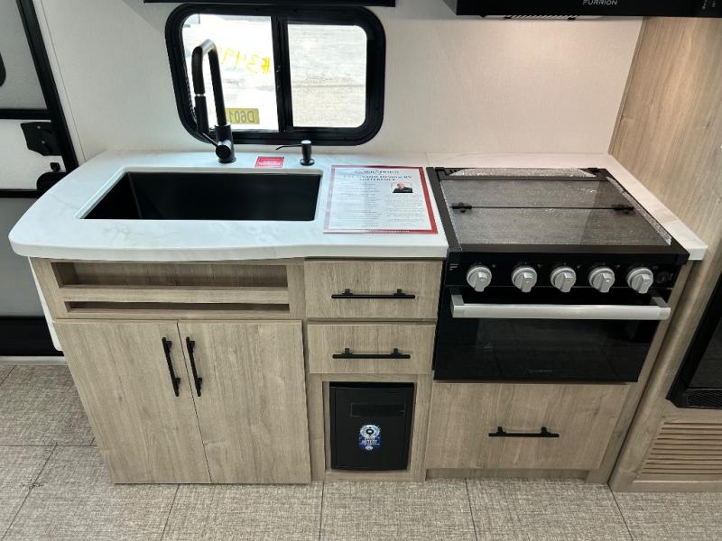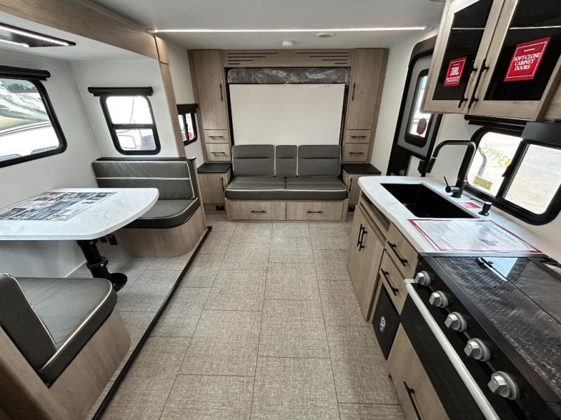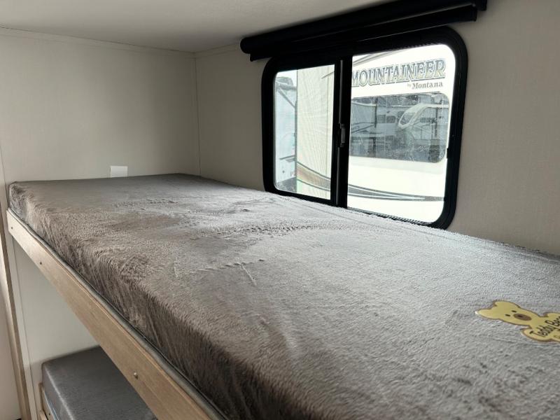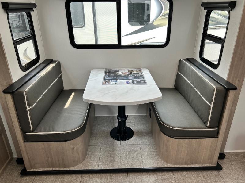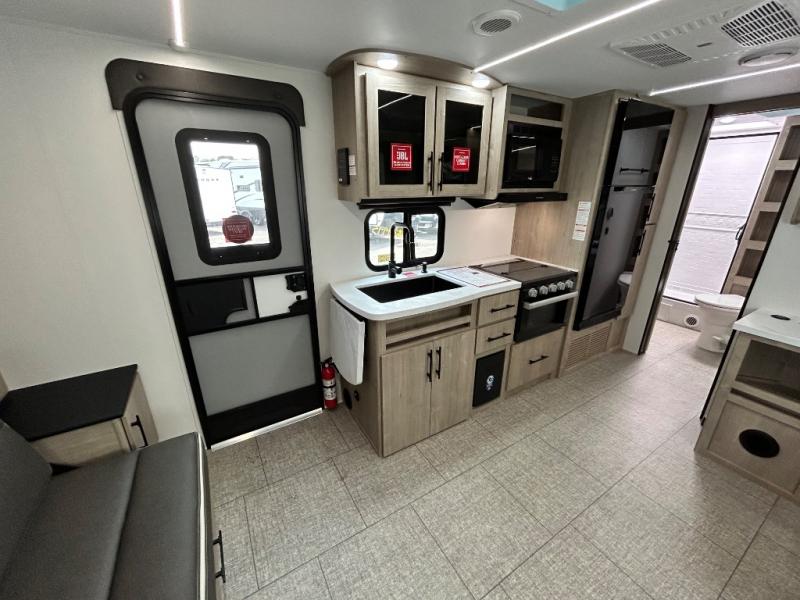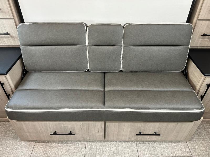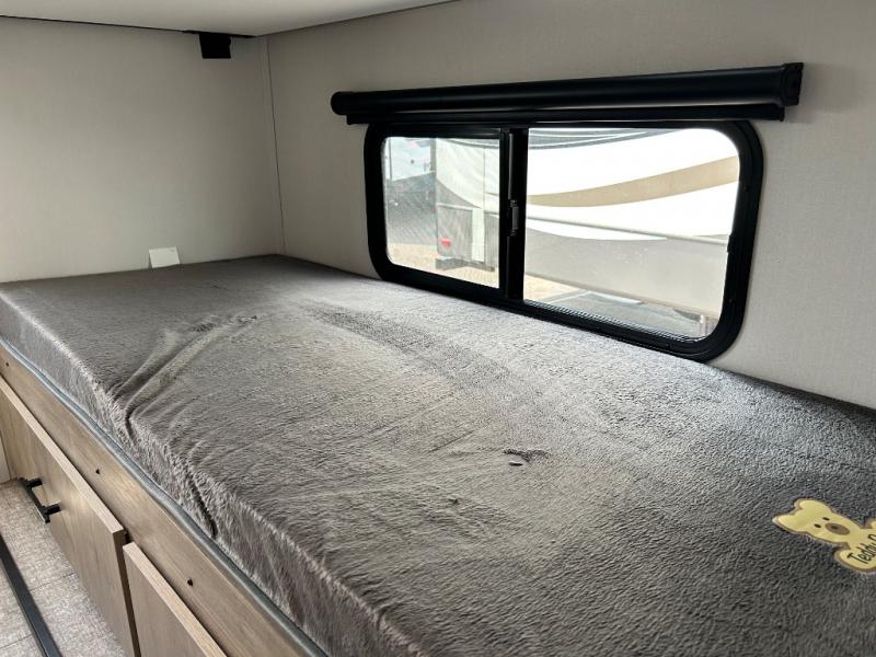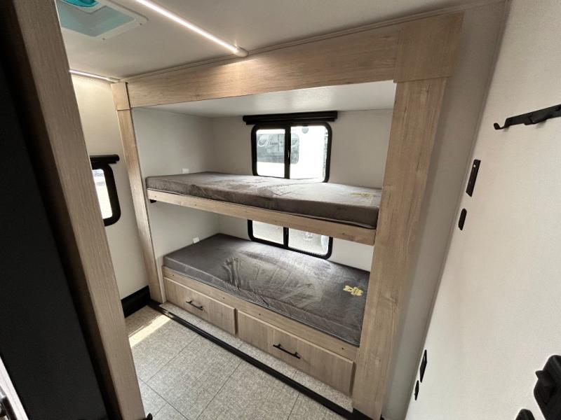 Your family will love camping in this spacious and versatile trailer thanks to the double slides and Murphy bed provided. During the day the Murphy bed is tucked away to provide more space and seating, and at night when folded down, there is a curtain for some privacy as you sleep. The booth dinette slides out to provide even more space and features windows on three sides so you can look out at your surroundings while you enjoy breakfast. The 30" flip top and bottom bunks each have some privacy with the sliding door, and the bunks are right next to the full bathroom for easy access in the middle of the night. The kitchen features everything you need to create meals and snacks as you travel, and you can have some more prep space by using the flip-up countertop extension.