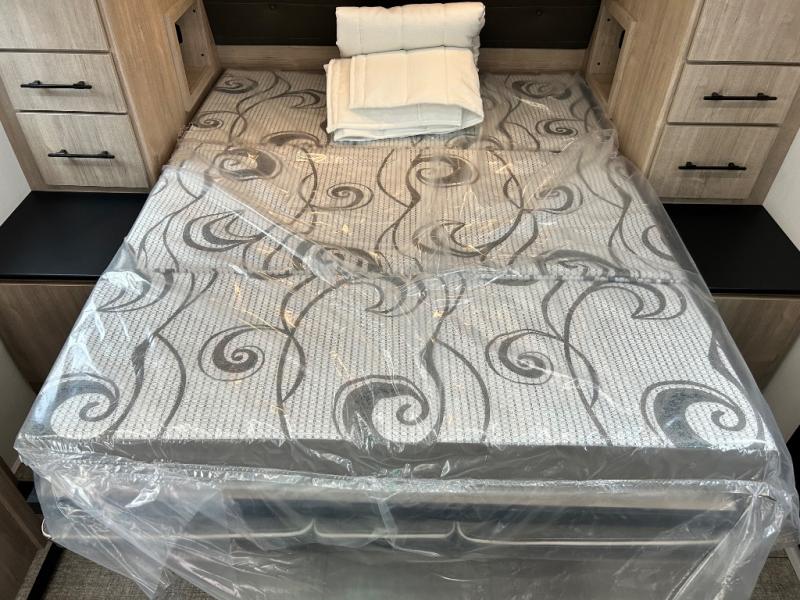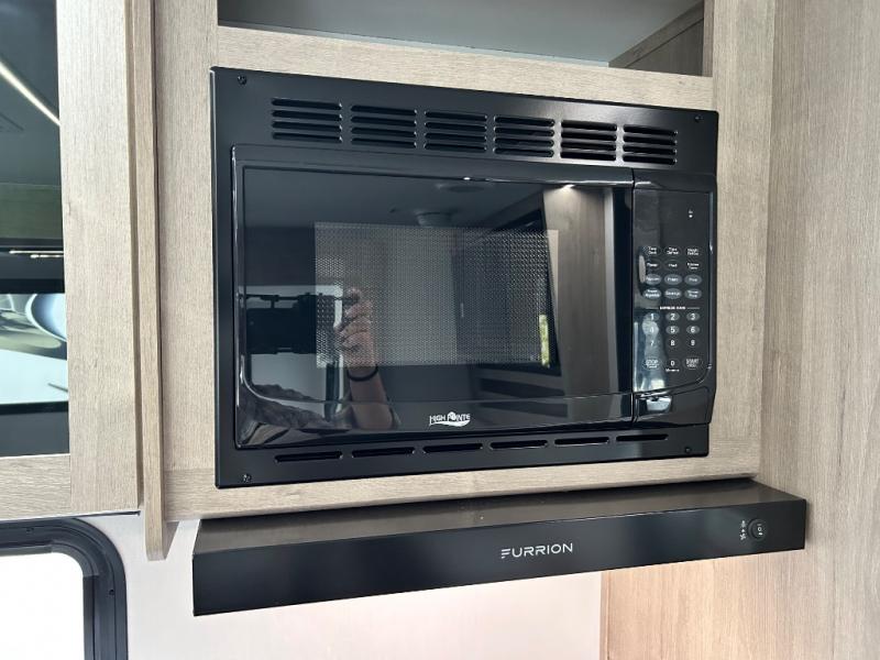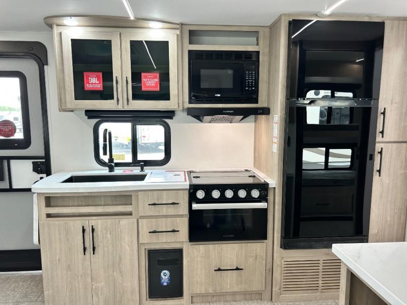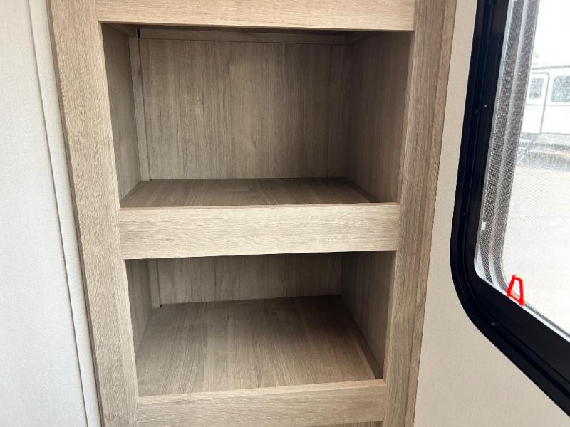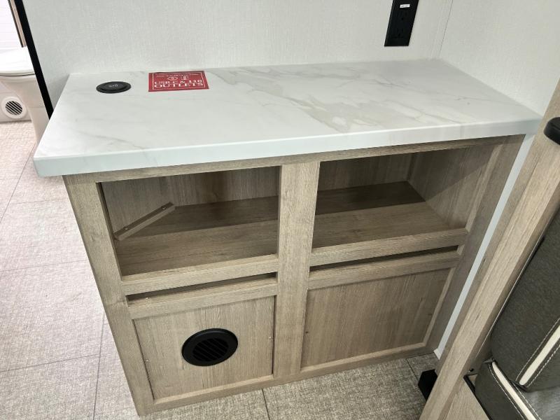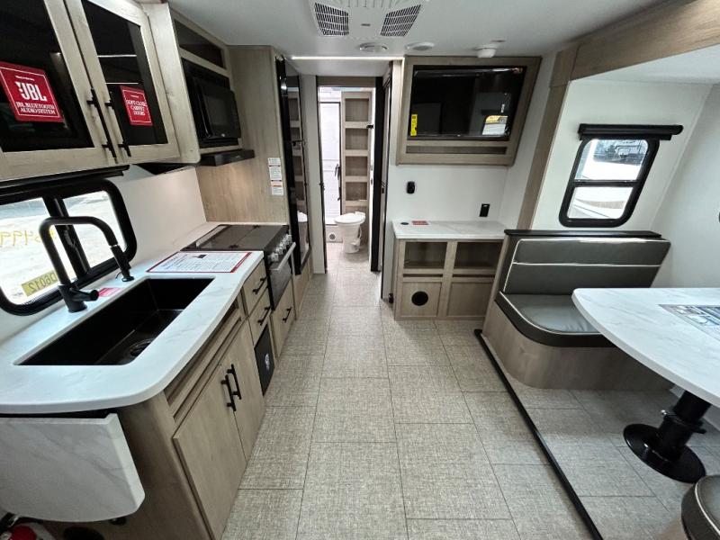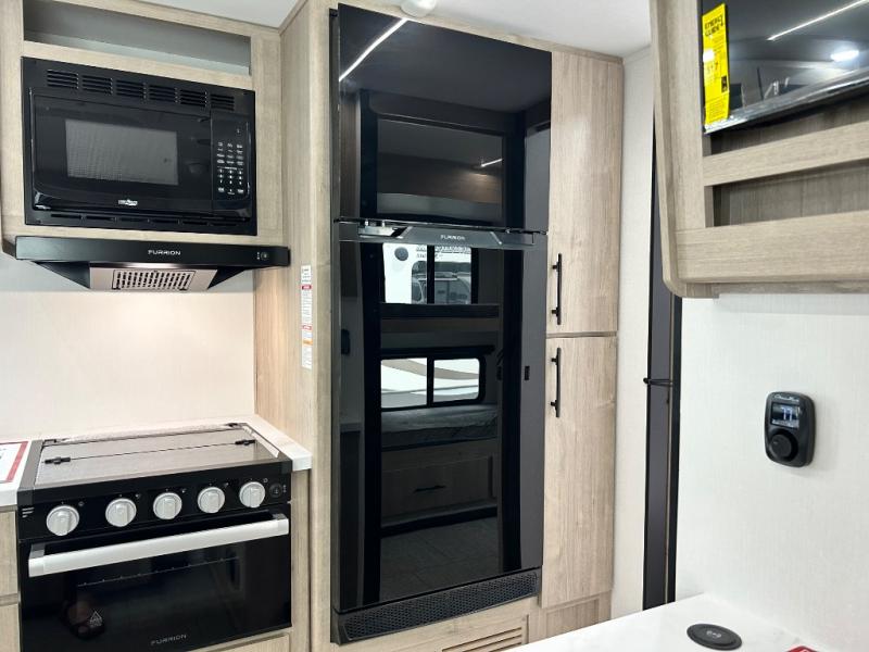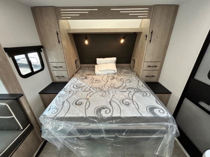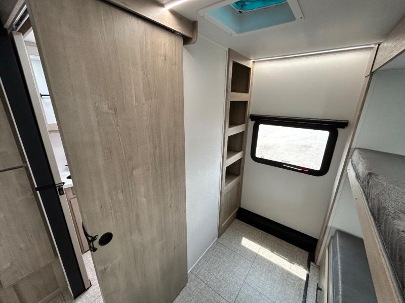 Your family will love camping in this spacious and versatile trailer thanks to the double slides and Murphy bed provided. During the day the Murphy bed is tucked away to provide more space and seating, and at night when folded down, there is a curtain for some privacy as you sleep. The booth dinette slides out to provide even more space and features windows on three sides so you can look out at your surroundings while you enjoy breakfast. The 30" flip top and bottom bunks each have some privacy with the sliding door, and the bunks are right next to the full bathroom for easy access in the middle of the night. The kitchen features everything you need to create meals and snacks as you travel, and you can have some more prep space by using the flip-up countertop extension.