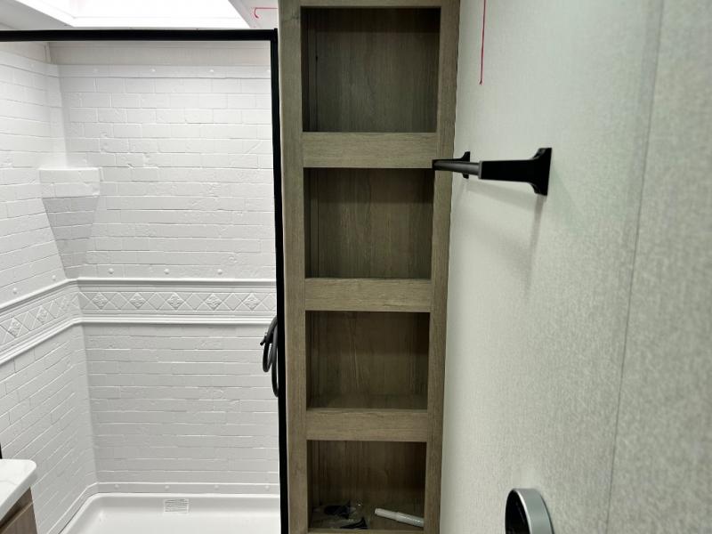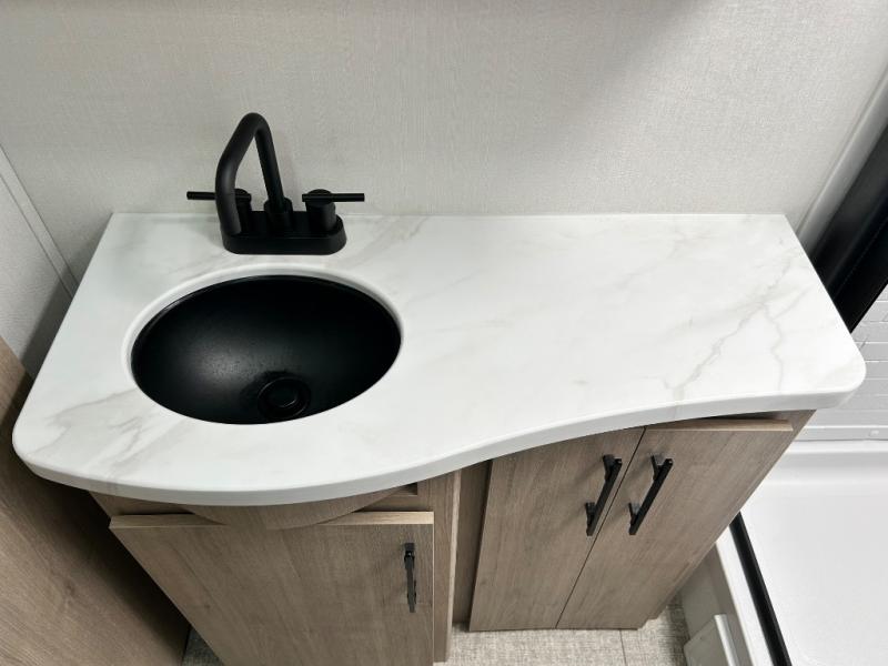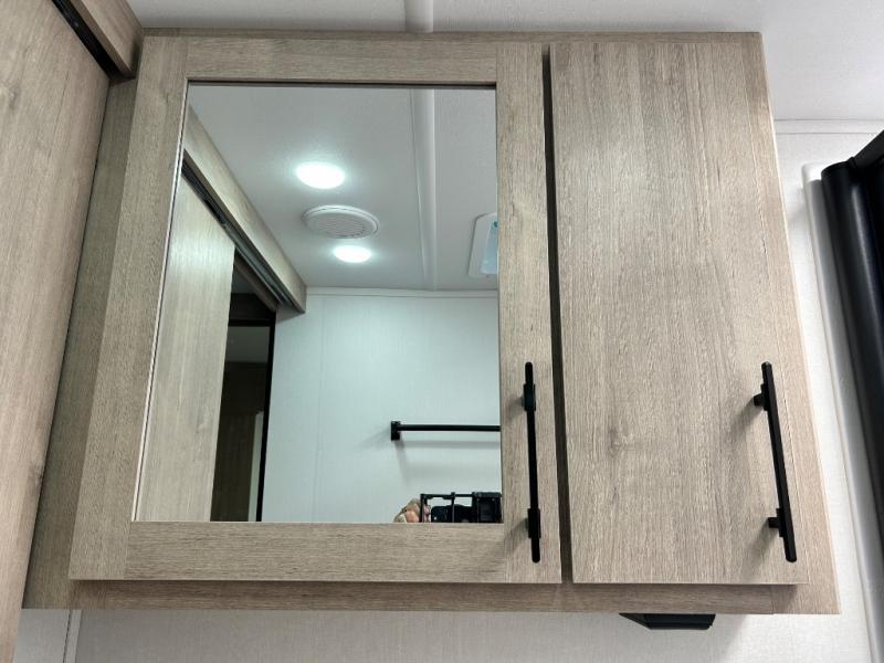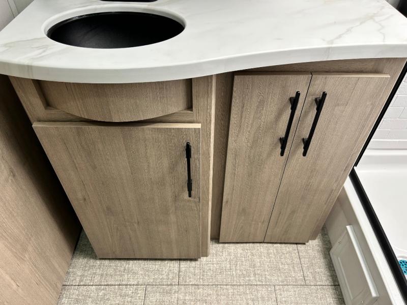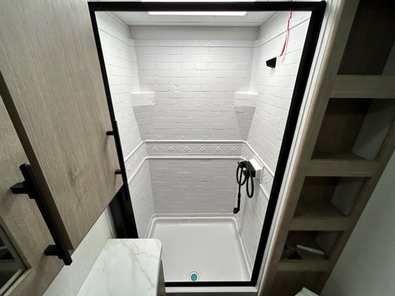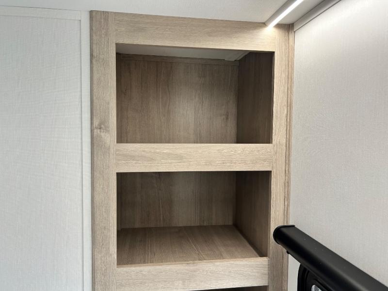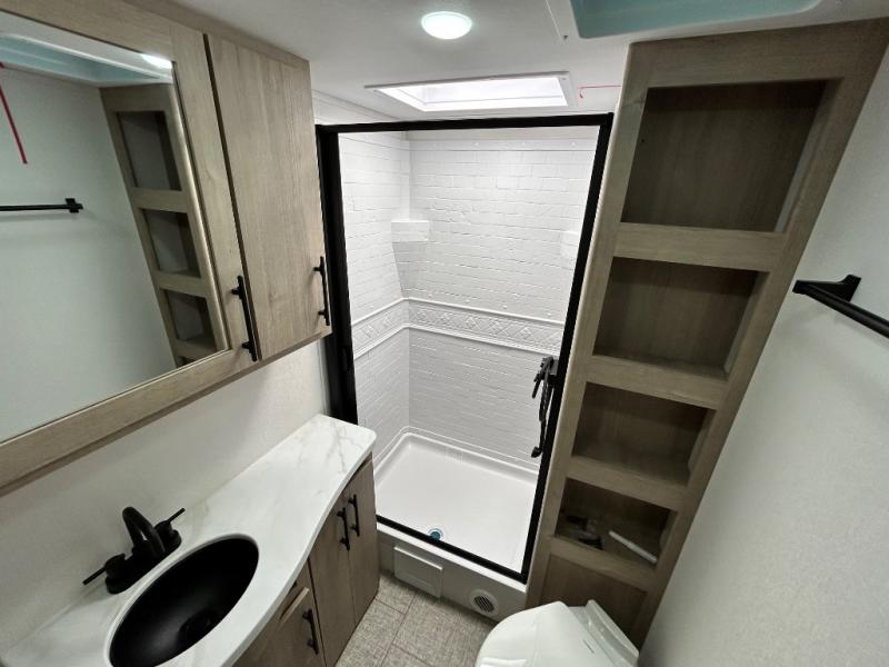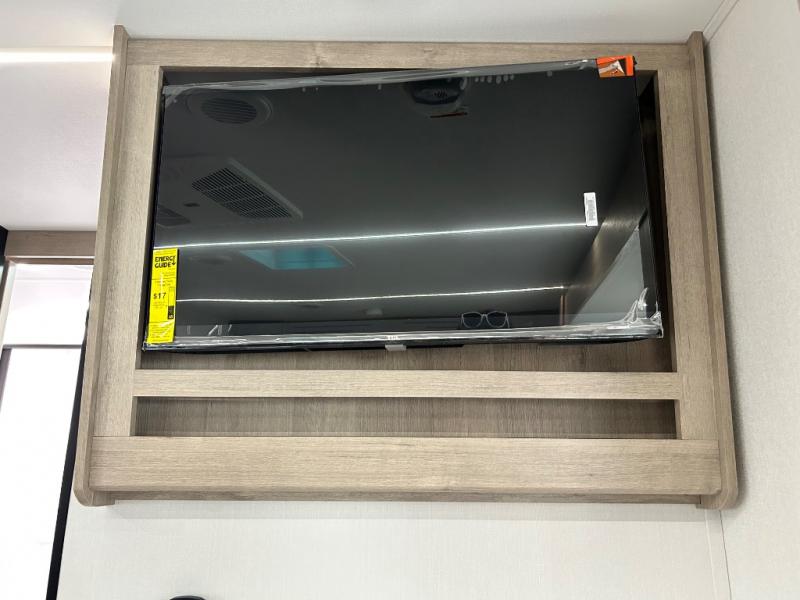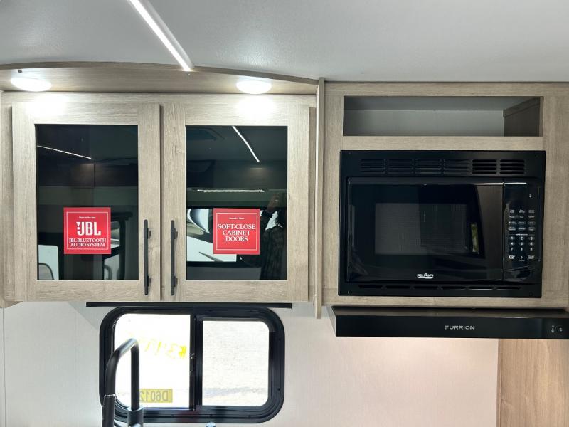 Your family will love camping in this spacious and versatile trailer thanks to the double slides and Murphy bed provided. During the day the Murphy bed is tucked away to provide more space and seating, and at night when folded down, there is a curtain for some privacy as you sleep. The booth dinette slides out to provide even more space and features windows on three sides so you can look out at your surroundings while you enjoy breakfast. The 30" flip top and bottom bunks each have some privacy with the sliding door, and the bunks are right next to the full bathroom for easy access in the middle of the night. The kitchen features everything you need to create meals and snacks as you travel, and you can have some more prep space by using the flip-up countertop extension.