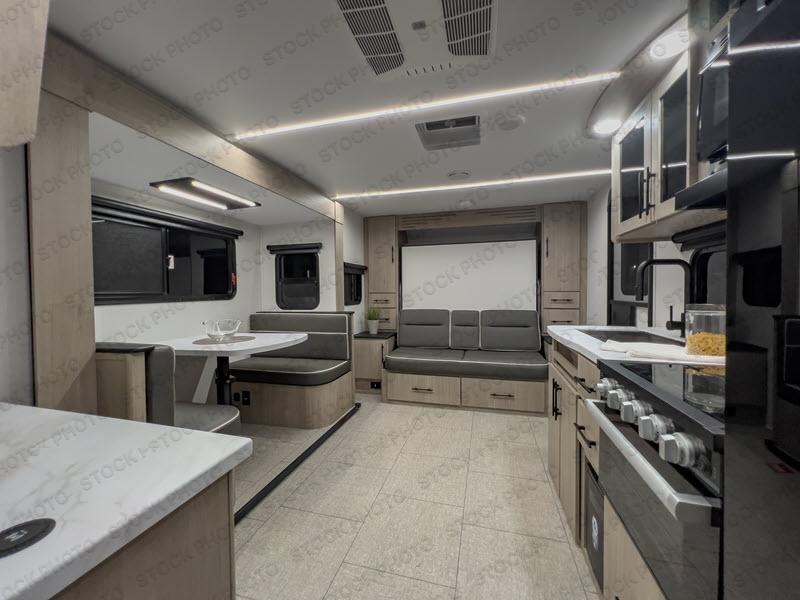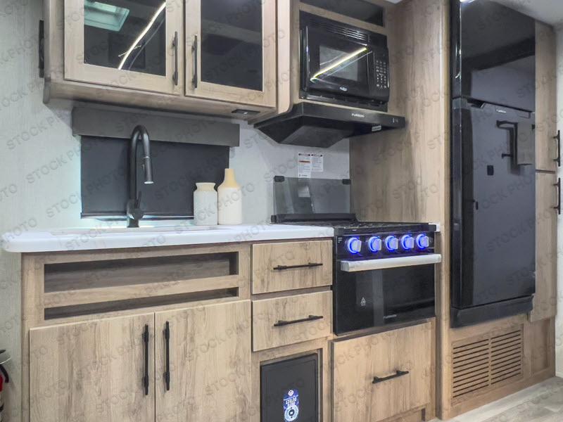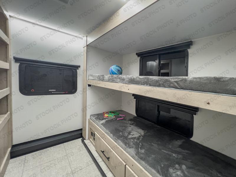 Your family will love camping in this spacious and versatile trailer thanks to the double slides and Murphy bed provided. During the day the Murphy bed is tucked away to provide more space and seating, and at night when folded down, there is a curtain for some privacy as you sleep. The booth dinette slides out to provide even more space and features windows on three sides so you can look out at your surroundings while you enjoy breakfast. The 30" flip top and bottom bunks each have some privacy with the sliding door, and the bunks are right next to the full bathroom for easy access in the middle of the night. The kitchen features everything you need to create meals and snacks as you travel, and you can have some more prep space by using the flip-up countertop extension.