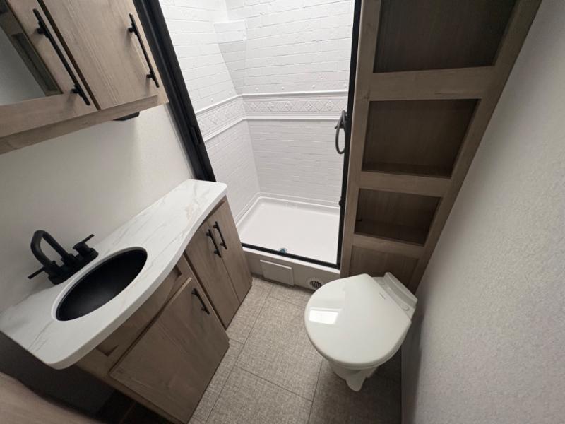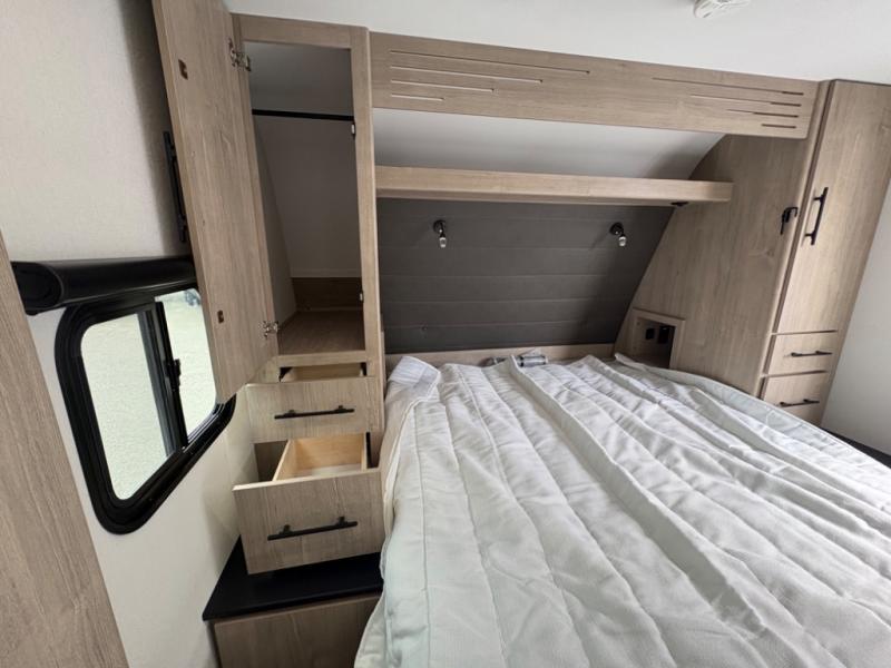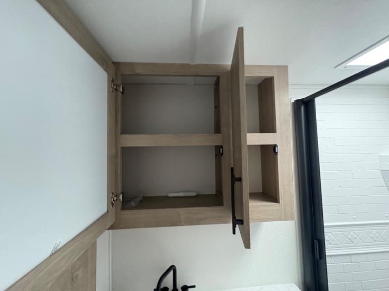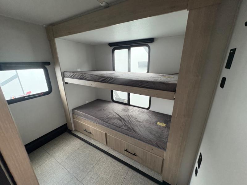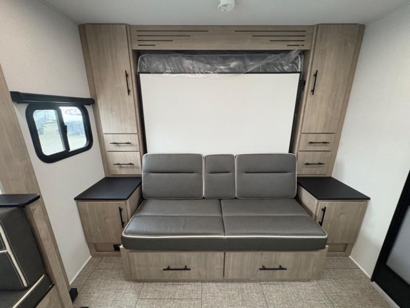 Your family will love camping in this spacious and versatile trailer thanks to the double slides and Murphy bed provided. During the day the Murphy bed is tucked away to provide more space and seating, and at night when folded down, there is a curtain for some privacy as you sleep. The booth dinette slides out to provide even more space and features windows on three sides so you can look out at your surroundings while you enjoy breakfast. The 30" flip top and bottom bunks each have some privacy with the sliding door, and the bunks are right next to the full bathroom for easy access in the middle of the night. The kitchen features everything you need to create meals and snacks as you travel, and you can have some more prep space by using the flip-up countertop extension.