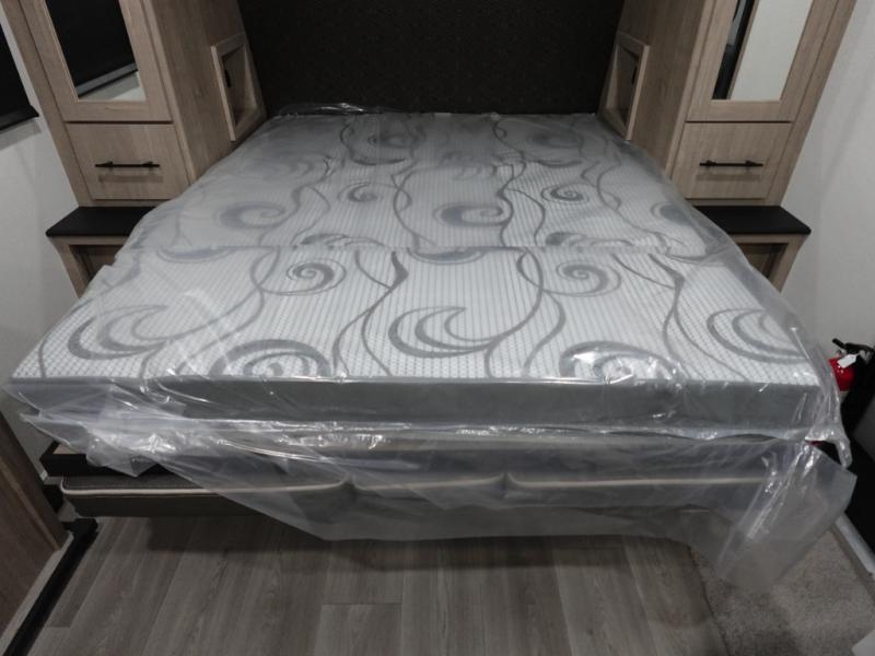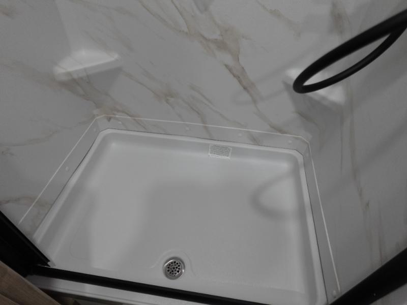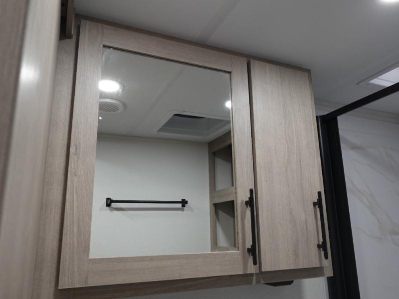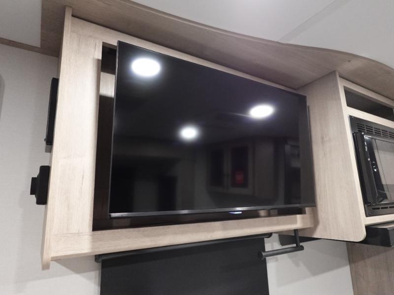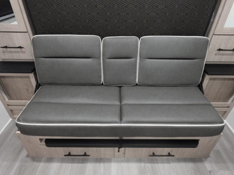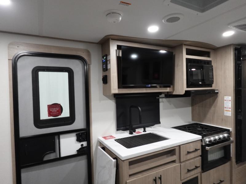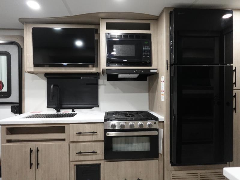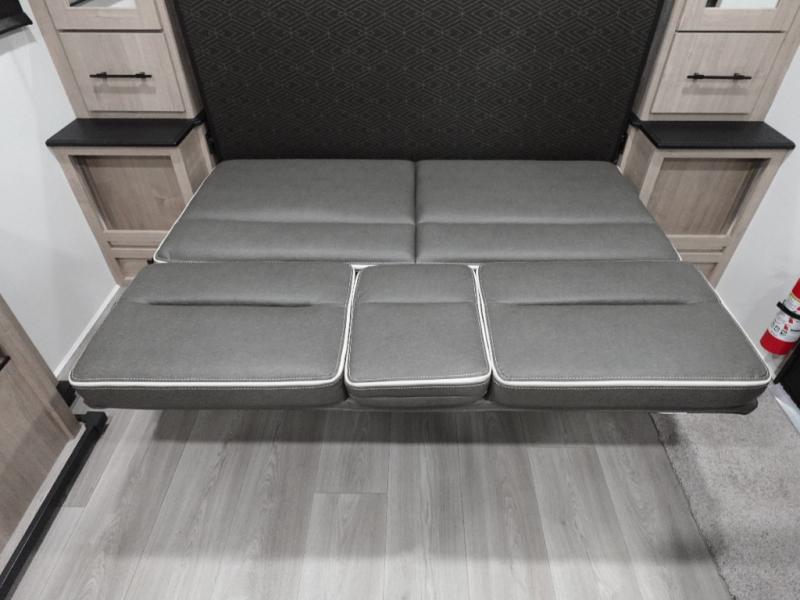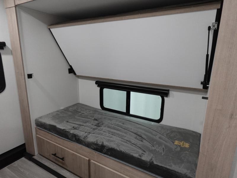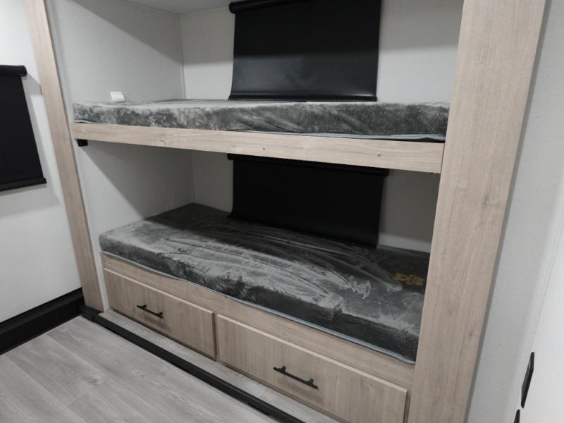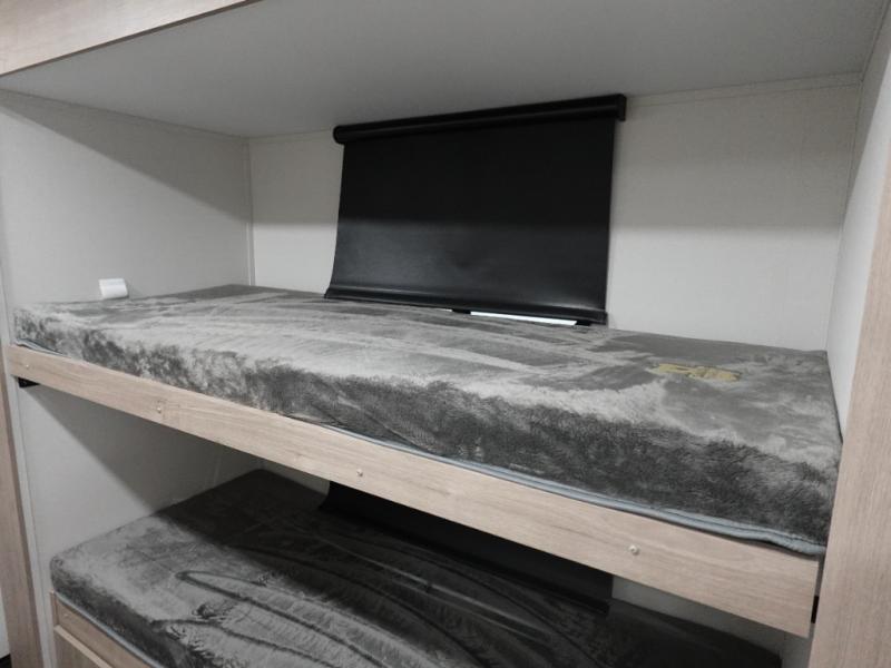 Your family will love camping in this spacious and versatile trailer thanks to the double slides and Murphy bed provided. During the day the Murphy bed is tucked away to provide more space and seating, and at night when folded down, there is a curtain for some privacy as you sleep. The booth dinette slides out to provide even more space and features windows on three sides so you can look out at your surroundings while you enjoy breakfast. The 30" flip top and bottom bunks each have some privacy with the sliding door, and the bunks are right next to the full bathroom for easy access in the middle of the night. The kitchen features everything you need to create meals and snacks as you travel, and you can have some more prep space by using the flip-up countertop extension.