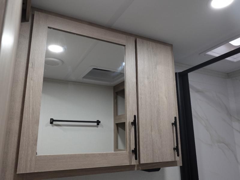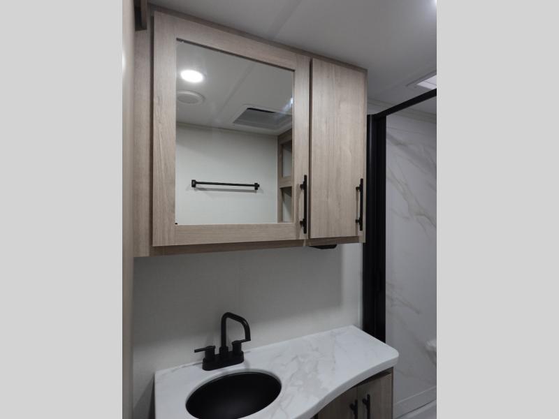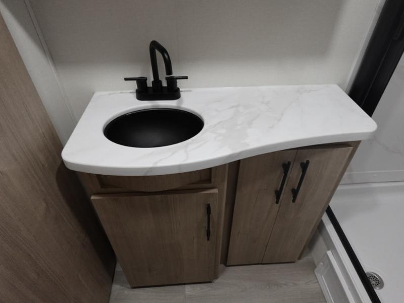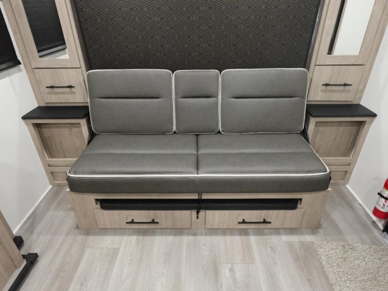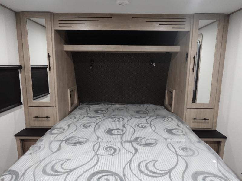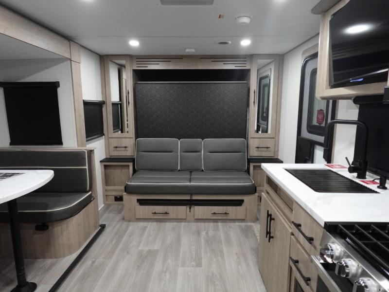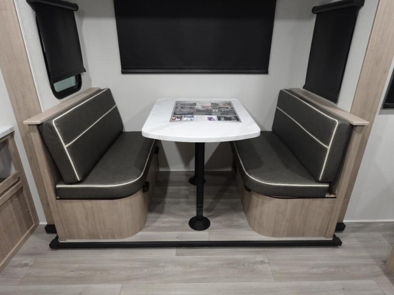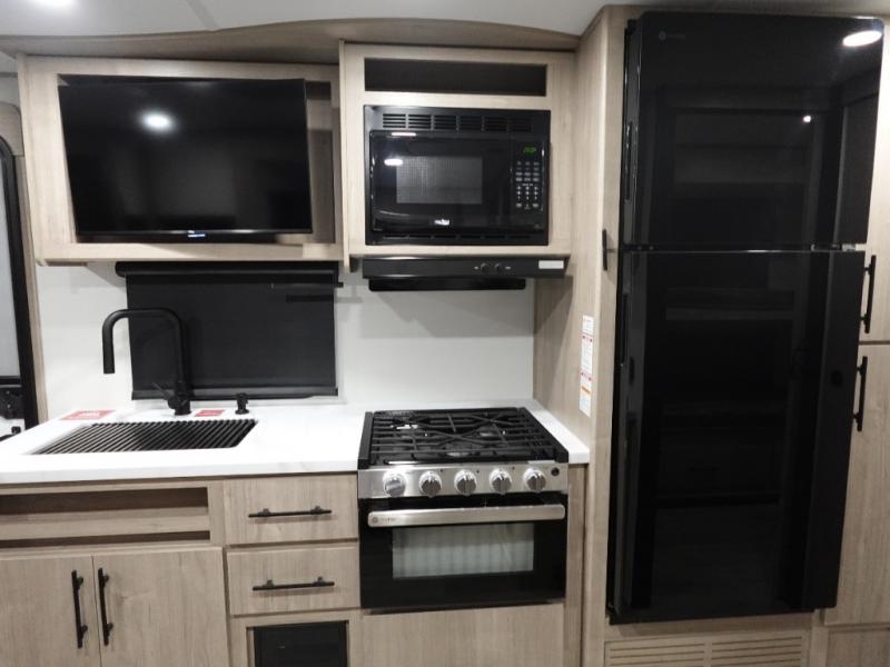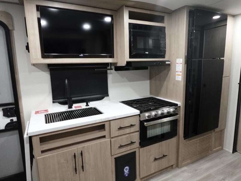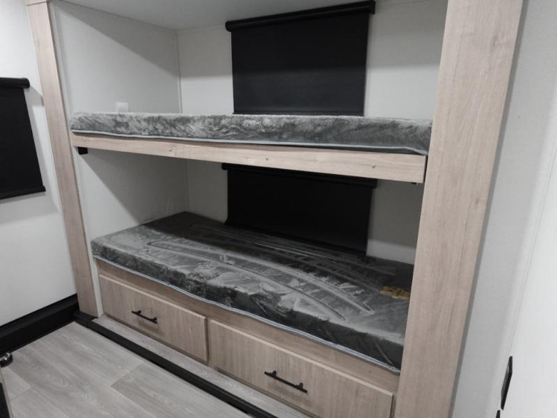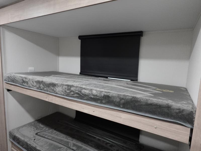 Your family will love camping in this spacious and versatile trailer thanks to the double slides and Murphy bed provided. During the day the Murphy bed is tucked away to provide more space and seating, and at night when folded down, there is a curtain for some privacy as you sleep. The booth dinette slides out to provide even more space and features windows on three sides so you can look out at your surroundings while you enjoy breakfast. The 30" flip top and bottom bunks each have some privacy with the sliding door, and the bunks are right next to the full bathroom for easy access in the middle of the night. The kitchen features everything you need to create meals and snacks as you travel, and you can have some more prep space by using the flip-up countertop extension.
