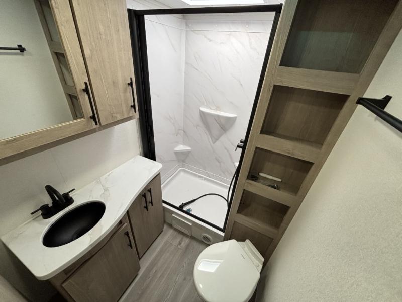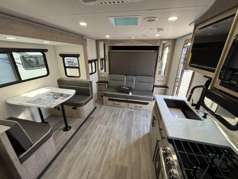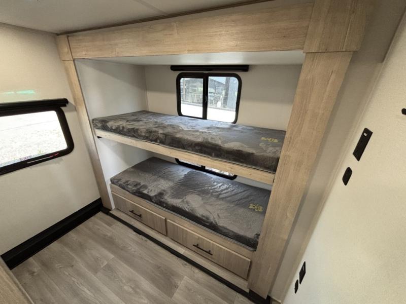Your family will love camping in this spacious and versatile trailer thanks to the double slides and Murphy bed provided. During the day the Murphy bed is tucked away to provide more space and seating, and at night when folded down, there is a curtain for some privacy as you sleep. The booth dinette slides out to provide even more space and features windows on three sides so you can look out at your surroundings while you enjoy breakfast. The 30" flip top and bottom bunks each have some privacy with the sliding door, and the bunks are right next to the full bathroom for easy access in the middle of the night. The kitchen features everything you need to create meals and snacks as you travel, and you can have some more prep space by using the flip-up countertop extension.