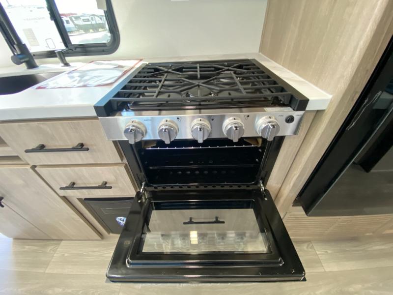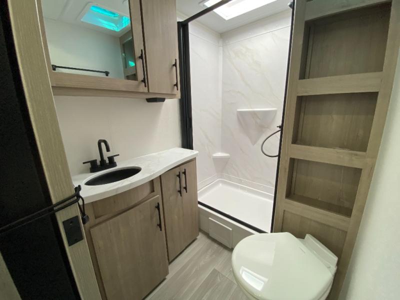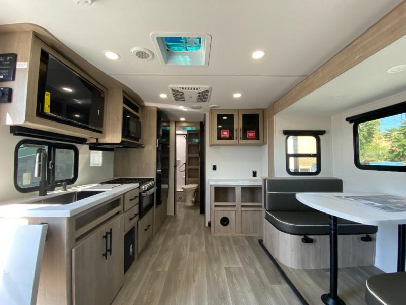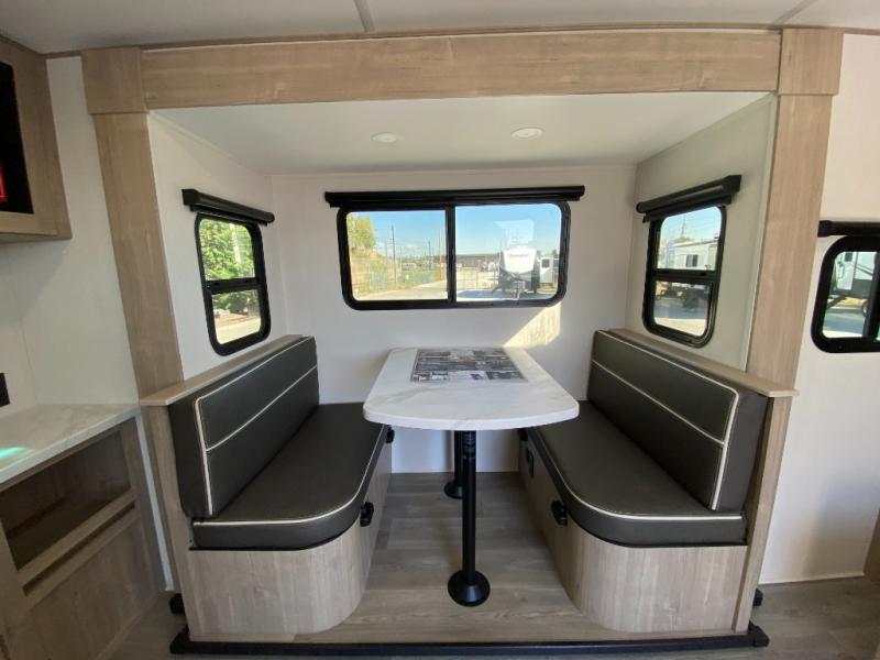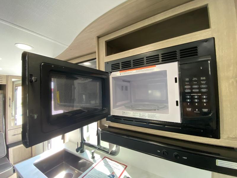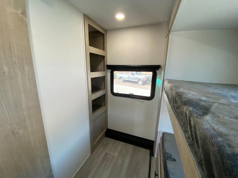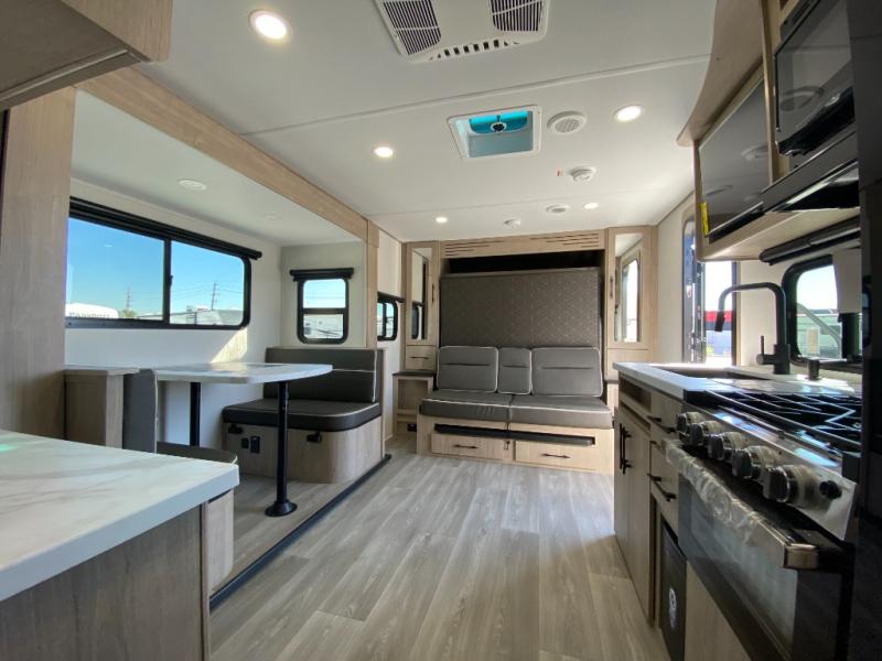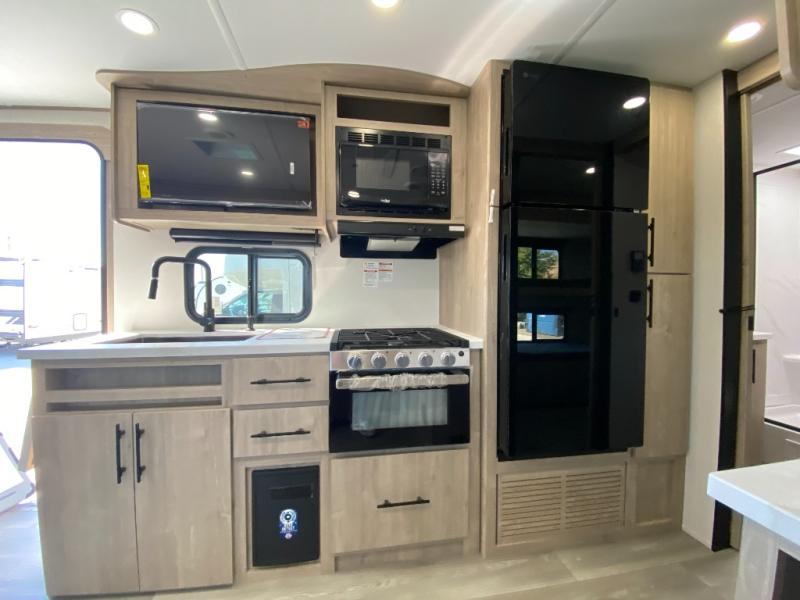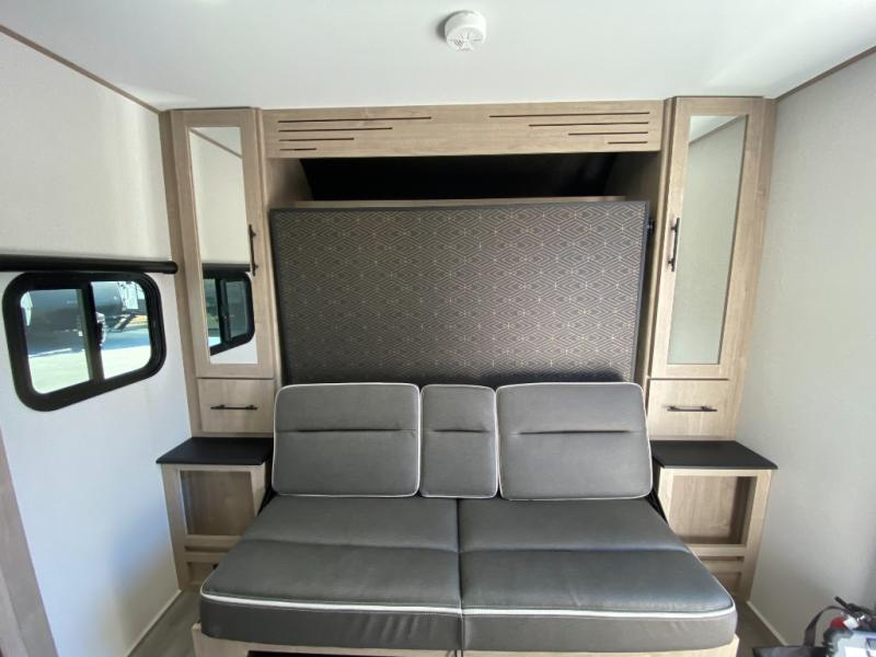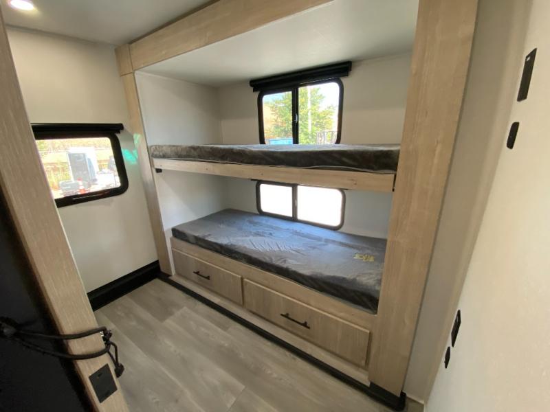 Your family will love camping in this spacious and versatile trailer thanks to the double slides and Murphy bed provided. During the day the Murphy bed is tucked away to provide more space and seating, and at night when folded down, there is a curtain for some privacy as you sleep. The booth dinette slides out to provide even more space and features windows on three sides so you can look out at your surroundings while you enjoy breakfast. The 30" flip top and bottom bunks each have some privacy with the sliding door, and the bunks are right next to the full bathroom for easy access in the middle of the night. The kitchen features everything you need to create meals and snacks as you travel, and you can have some more prep space by using the flip-up countertop extension.