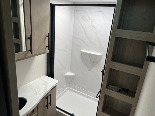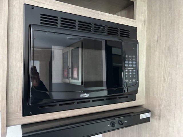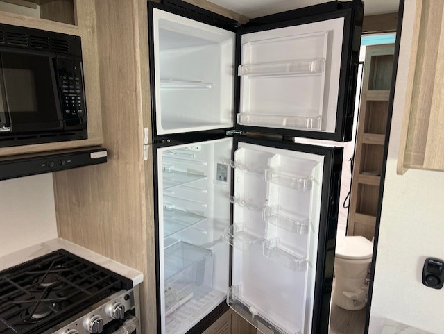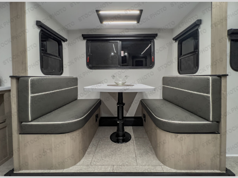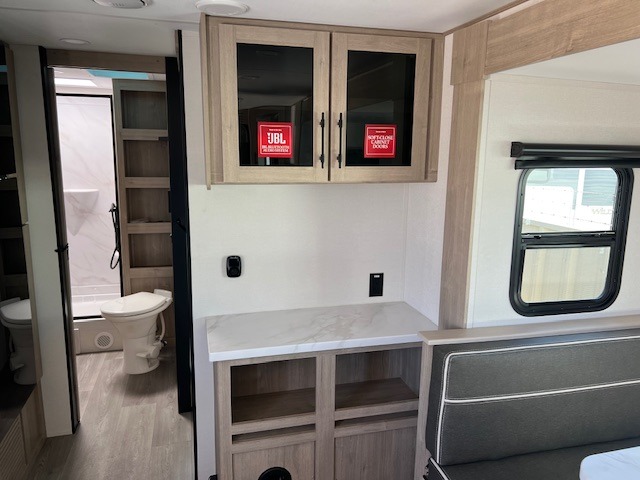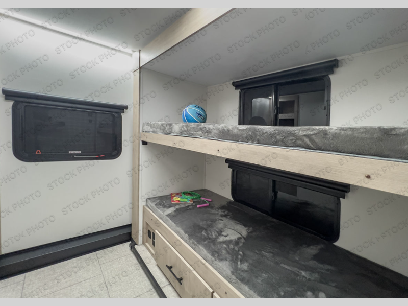 Your family will love camping in this spacious and versatile trailer thanks to the double slides and Murphy bed provided. During the day the Murphy bed is tucked away to provide more space and seating, and at night when folded down, there is a curtain for some privacy as you sleep. The booth dinette slides out to provide even more space and features windows on three sides so you can look out at your surroundings while you enjoy breakfast. The 30" flip top and bottom bunks each have some privacy with the sliding door, and the bunks are right next to the full bathroom for easy access in the middle of the night. The kitchen features everything you need to create meals and snacks as you travel, and you can have some more prep space by using the flip-up countertop extension.