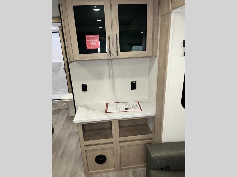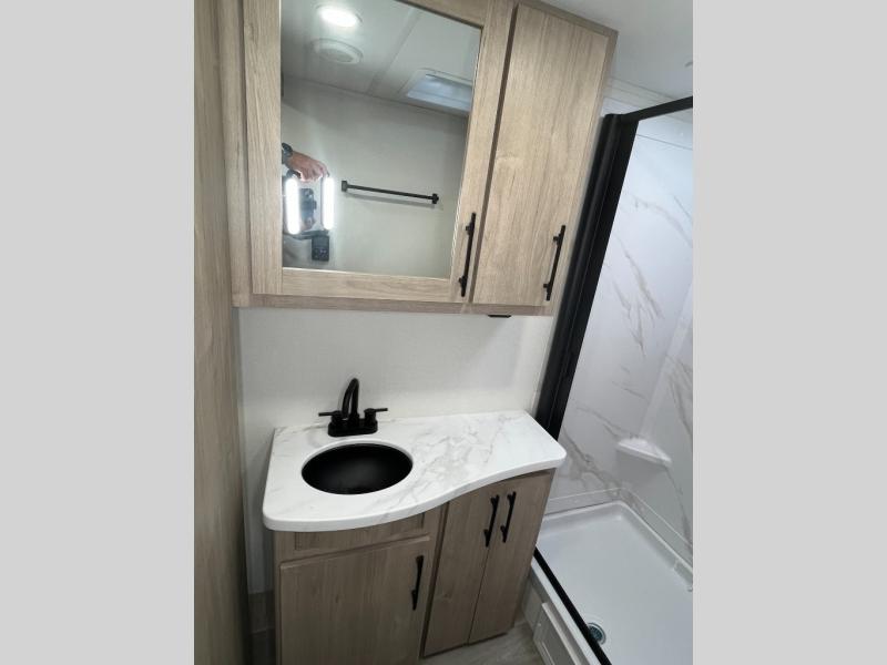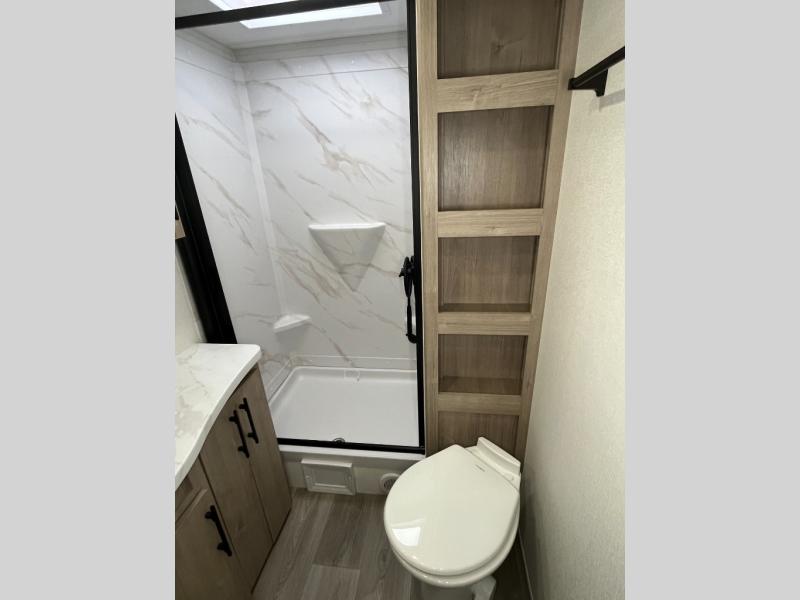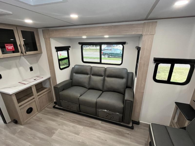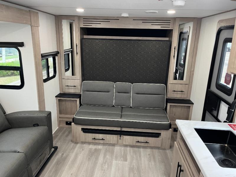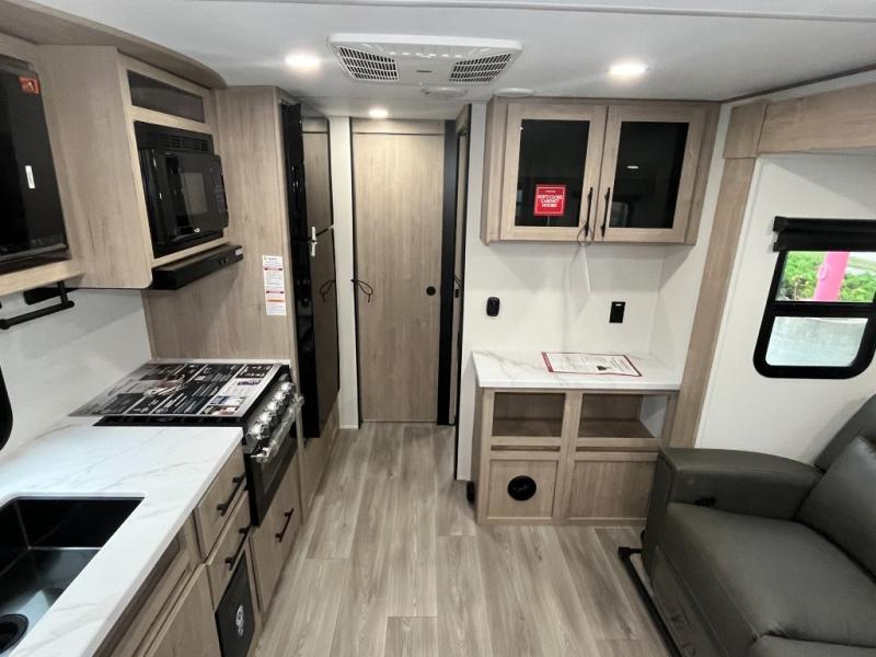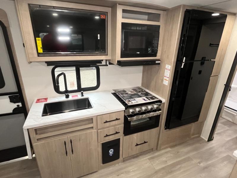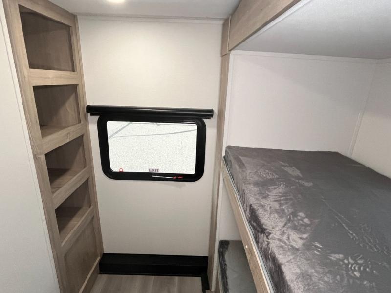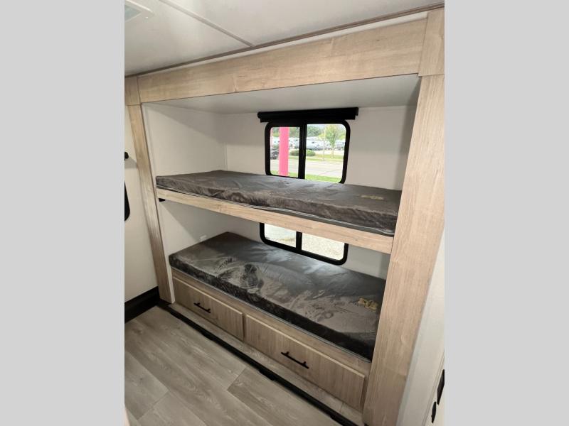 Your family will love camping in this spacious and versatile trailer thanks to the double slides and Murphy bed provided. During the day the Murphy bed is tucked away to provide more space and seating, and at night when folded down, there is a curtain for some privacy as you sleep. The theater dinette slides out to provide even more space and features windows on three sides so you can look out at your surroundings while you enjoy breakfast. The 30" flip top and bottom bunks each have some privacy with the sliding door, and the bunks are right next to the full bathroom for easy access in the middle of the night. The kitchen features everything you need to create meals and snacks as you travel, and you can have some more prep space by using the flip-up countertop extension.