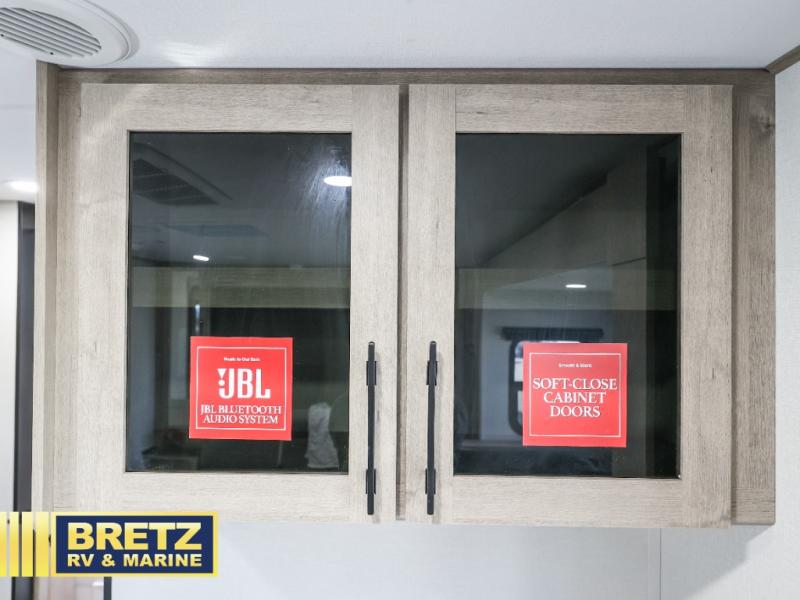 Your family will love camping in this spacious and versatile trailer thanks to the double slides and Murphy bed provided. During the day the Murphy bed is tucked away to provide more space and seating, and at night when folded down, there is a curtain for some privacy as you sleep. The booth dinette slides out to provide even more space and features windows on three sides so you can look out at your surroundings while you enjoy breakfast. The 30" flip top and bottom bunks each have some privacy with the sliding door, and the bunks are right next to the full bathroom for easy access in the middle of the night. The kitchen features everything you need to create meals and snacks as you travel, and you can have some more prep space by using the flip-up countertop extension.