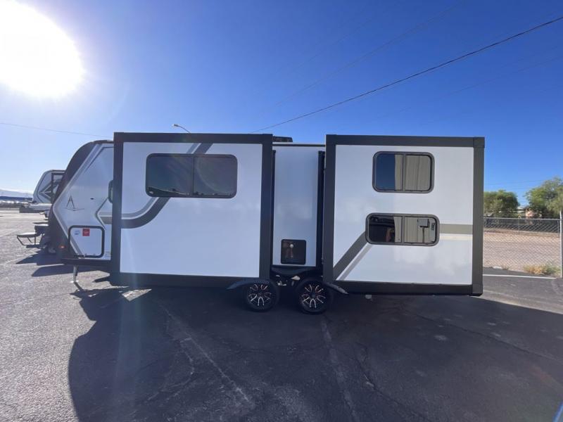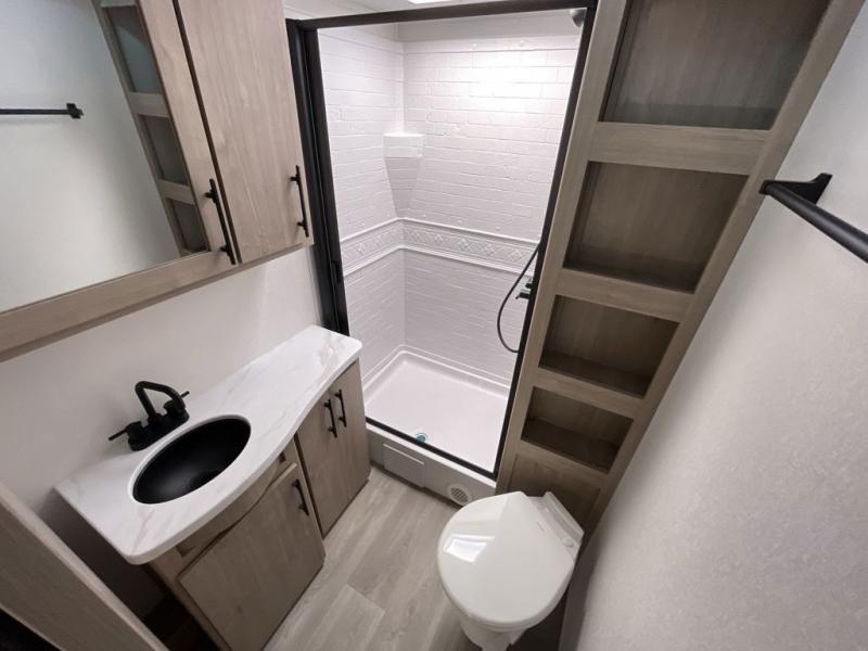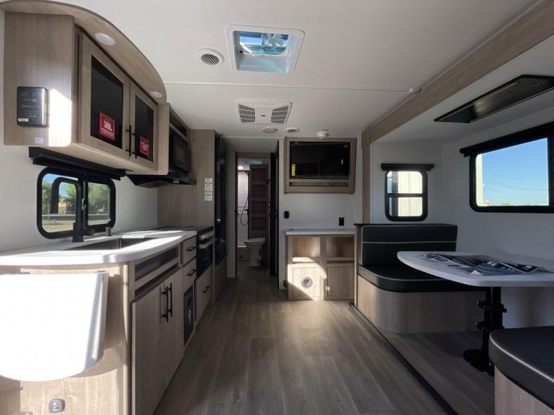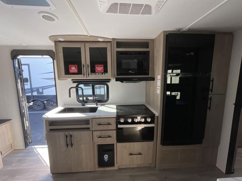 Your family will love camping in this spacious and versatile trailer thanks to the double slides and Murphy bed provided. During the day the Murphy bed is tucked away to provide more space and seating, and at night when folded down, there is a curtain for some privacy as you sleep. The booth dinette slides out to provide even more space and features windows on three sides so you can look out at your surroundings while you enjoy breakfast. The 30" flip top and bottom bunks each have some privacy with the sliding door, and the bunks are right next to the full bathroom for easy access in the middle of the night. The kitchen features everything you need to create meals and snacks as you travel, and you can have some more prep space by using the flip-up countertop extension.