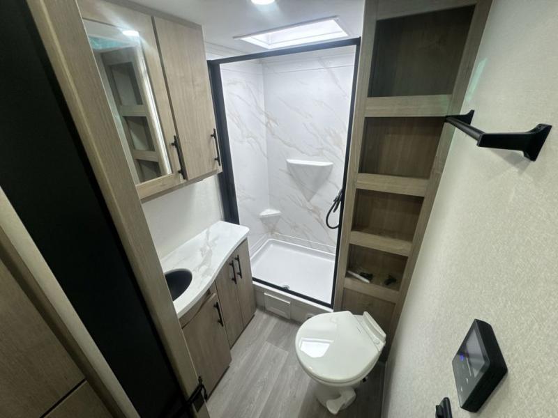 Your family will love camping in this spacious and versatile trailer thanks to the double slides and Murphy bed provided. During the day the Murphy bed is tucked away to provide more space and seating, and at night when folded down, there is a curtain for some privacy as you sleep. The booth dinette slides out to provide even more space and features windows on three sides so you can look out at your surroundings while you enjoy breakfast. The 30" flip top and bottom bunks each have some privacy with the sliding door, and the bunks are right next to the full bathroom for easy access in the middle of the night. The kitchen features everything you need to create meals and snacks as you travel, and you can have some more prep space by using the flip-up countertop extension.