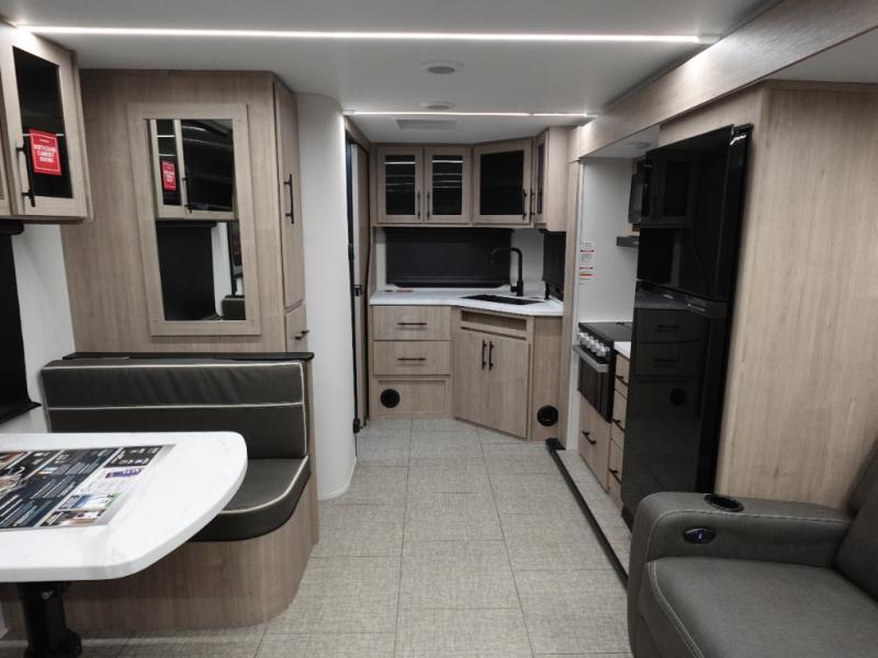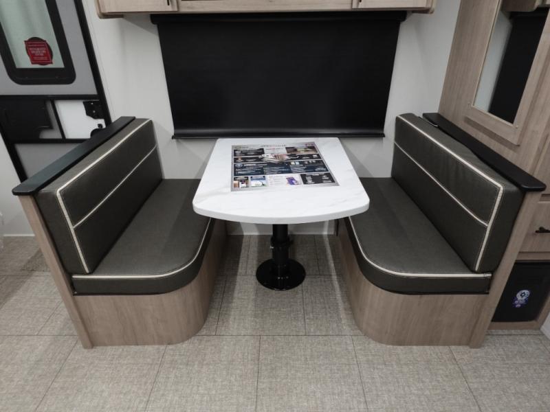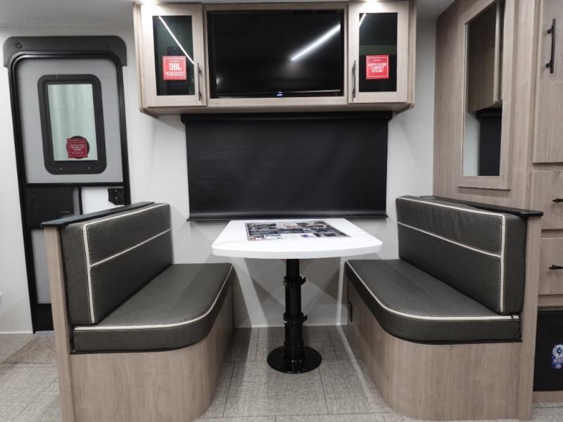 This Imagine XLS travel trailer has theater seating and a booth dinette that you can use any time you need a little break from the outdoors. If you want to come in and grab a coffee, put together a puzzle, or work on your itinerary for the week, just put up your feet and relax. You could even switch on the LED HDTV if you want a little entertainment. The front queen-size bed has a privacy curtain that you can draw to create a semi-private bedroom, and in the back of the trailer you will find the rest of your amenities, like the kitchen and the bathroom. The large slide makes it easy to enjoy spending your time indoors, but if you do want to get back outside, you can sit underneath the 18' electric awning for some shade.