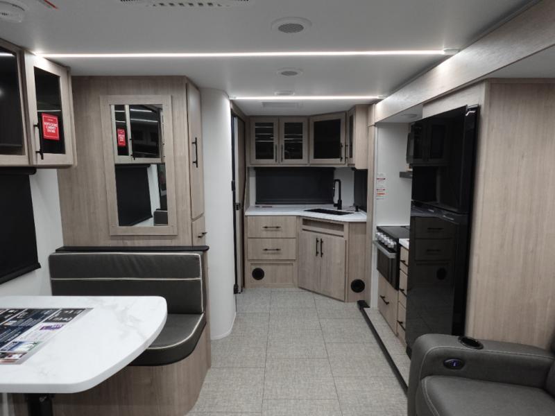 This Imagine XLS travel trailer has theater seating and a booth dinette that you can use any time you need a little break from the outdoors. If you want to come in and grab a coffee, put together a puzzle, or work on your itinerary for the week, just put up your feet and relax. You could even switch on the LED HDTV if you want a little entertainment. The front queen-size bed has a privacy curtain that you can draw to create a semi-private bedroom, and in the back of the trailer you will find the rest of your amenities, like the kitchen and the bathroom. The large slide makes it easy to enjoy spending your time indoors, but if you do want to get back outside, you can sit underneath the 18' electric awning for some shade.