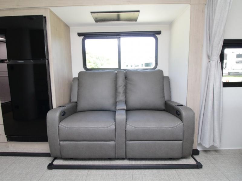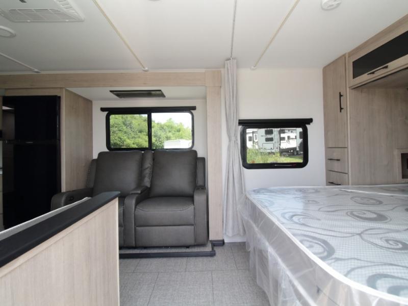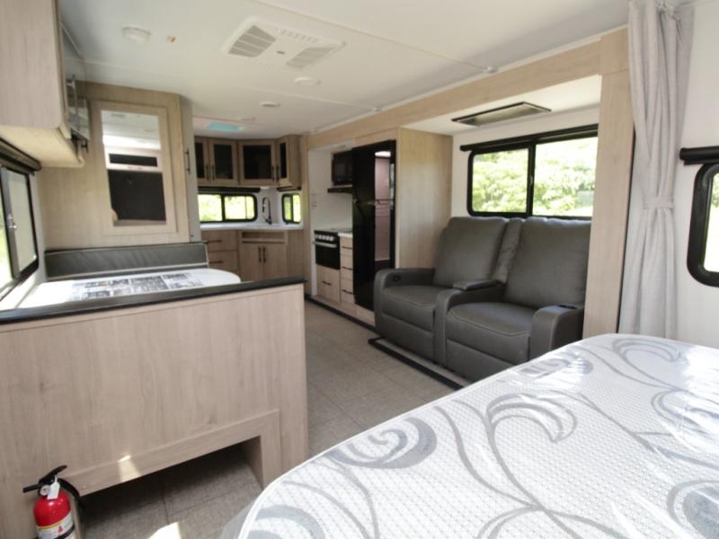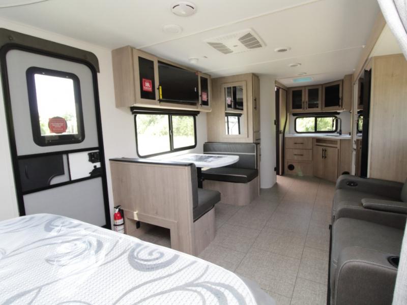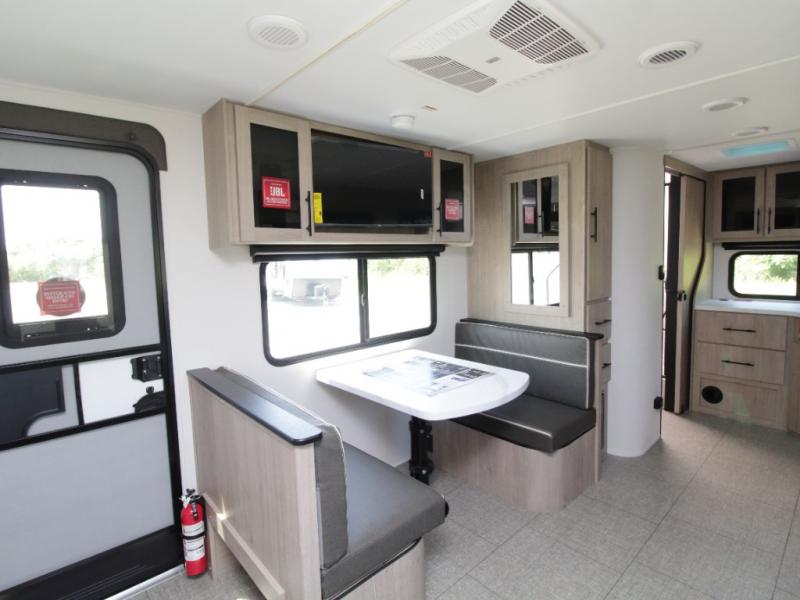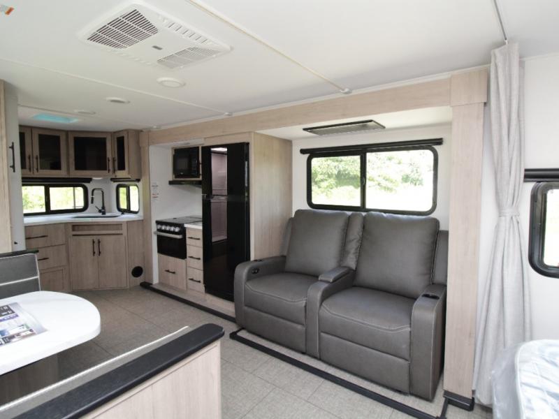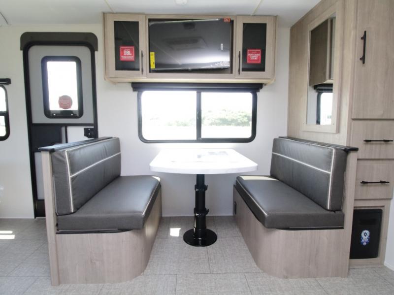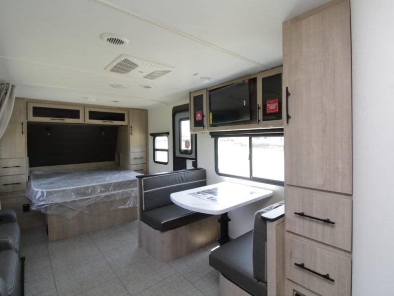 Relax indoors with cozy theatre seating and a booth dinette—ideal for sipping your morning coffee, planning your next destination, or enjoying a quiet evening in front of the LED HDTV. The queen-size bed at the front of the trailer includes a privacy curtain to create a comfortable, semi-private sleeping area.