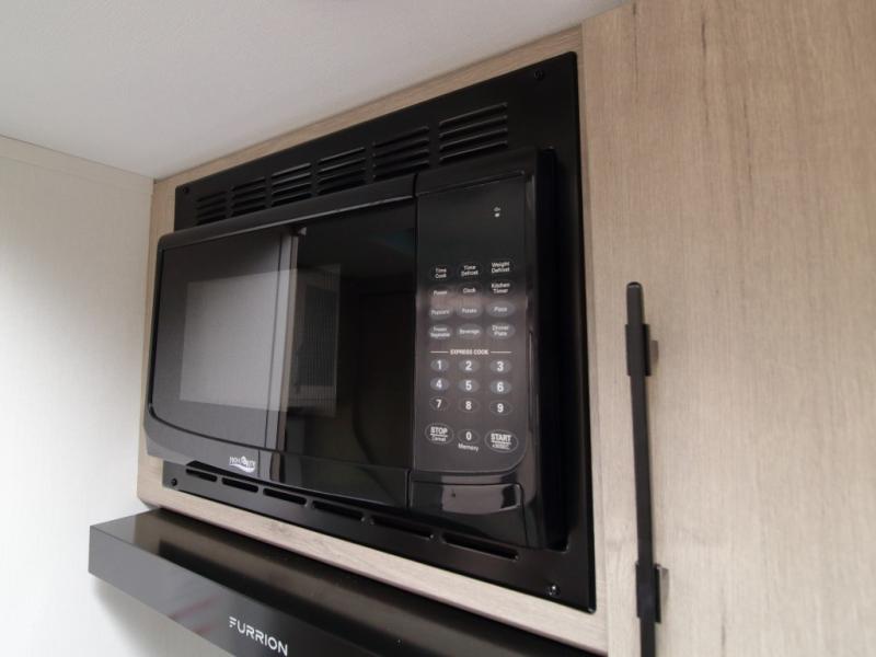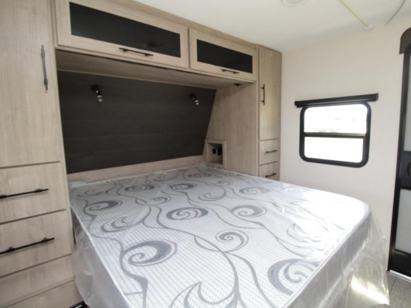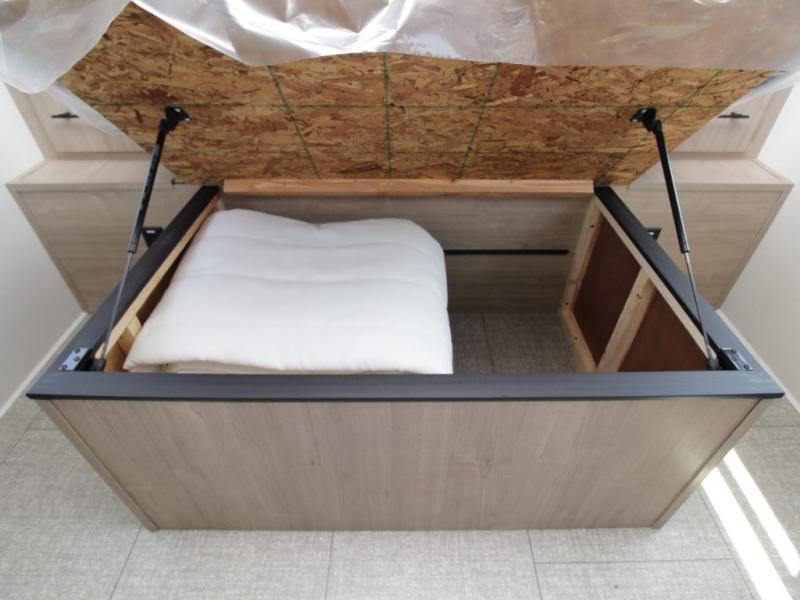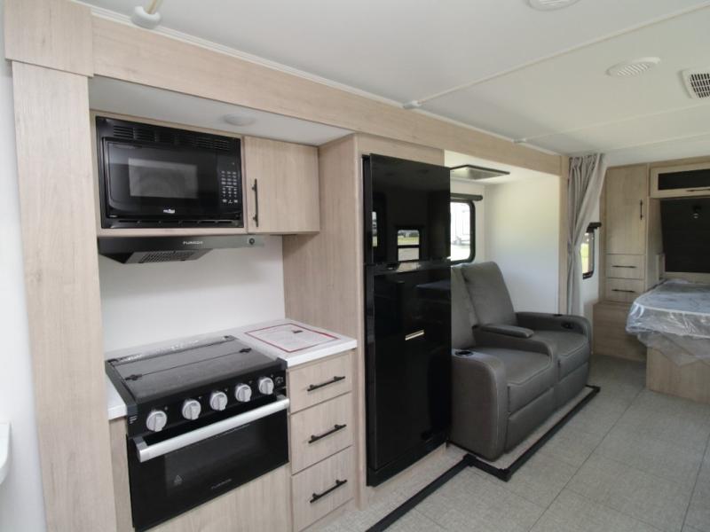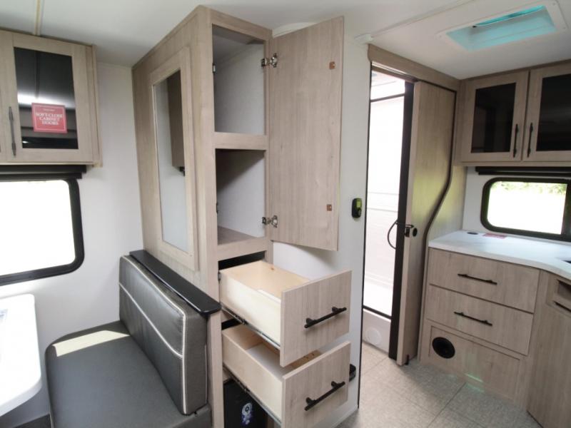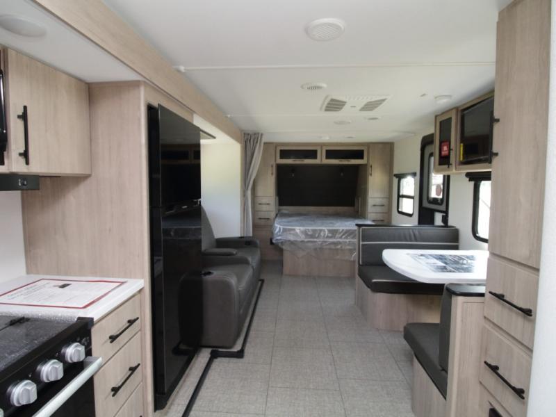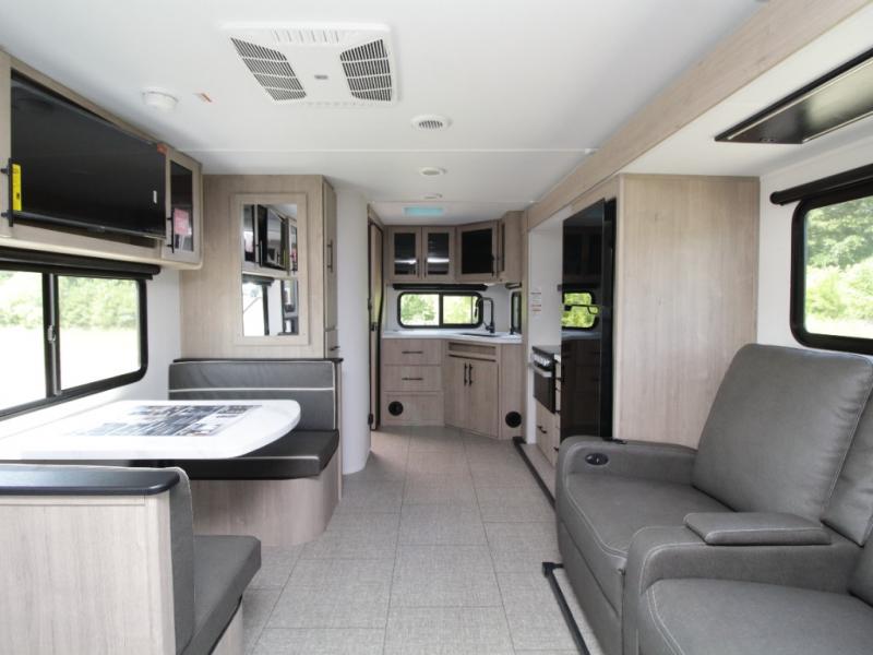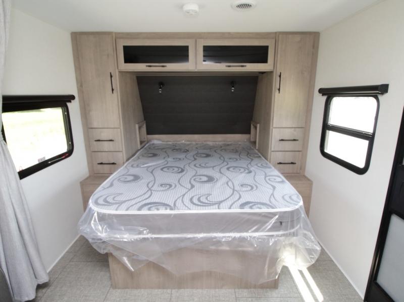 Relax indoors with cozy theatre seating and a booth dinette—ideal for sipping your morning coffee, planning your next destination, or enjoying a quiet evening in front of the LED HDTV. The queen-size bed at the front of the trailer includes a privacy curtain to create a comfortable, semi-private sleeping area.