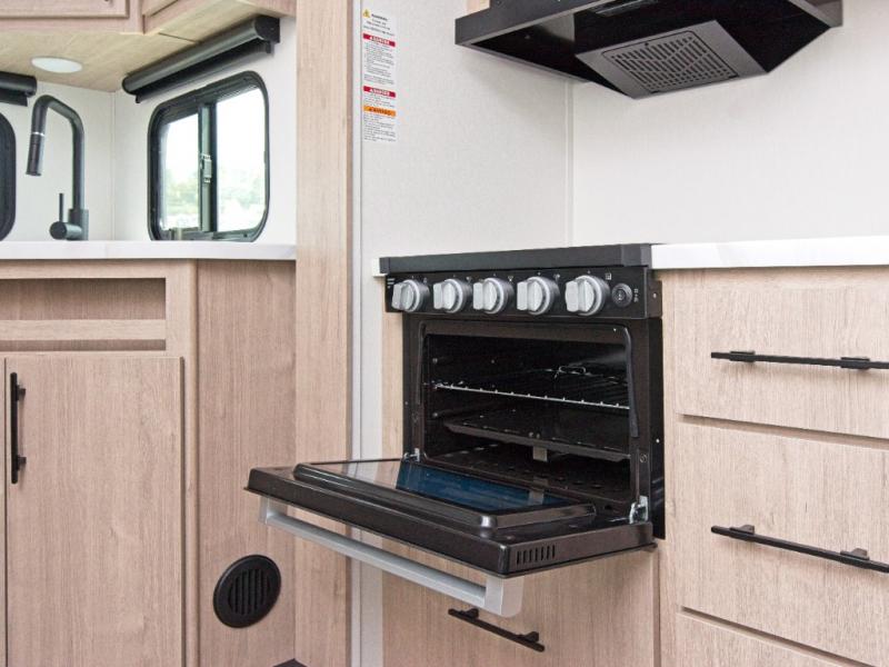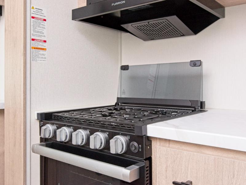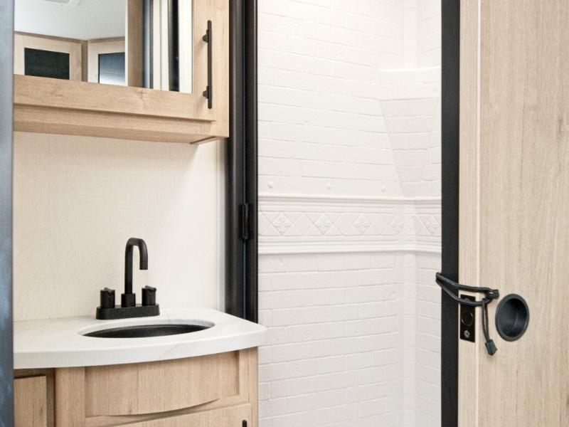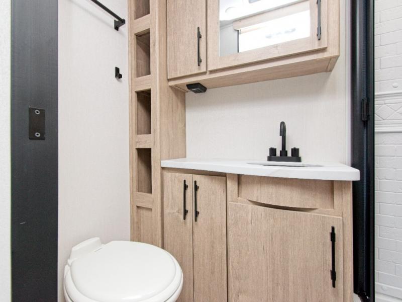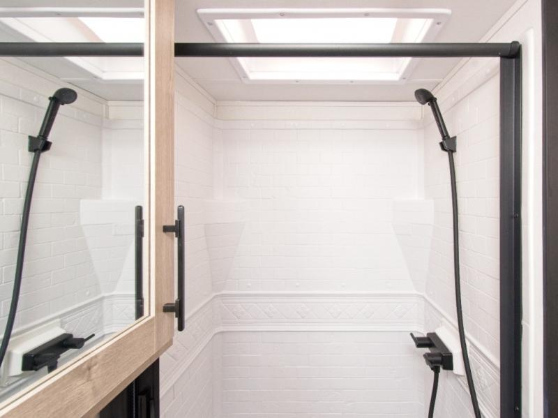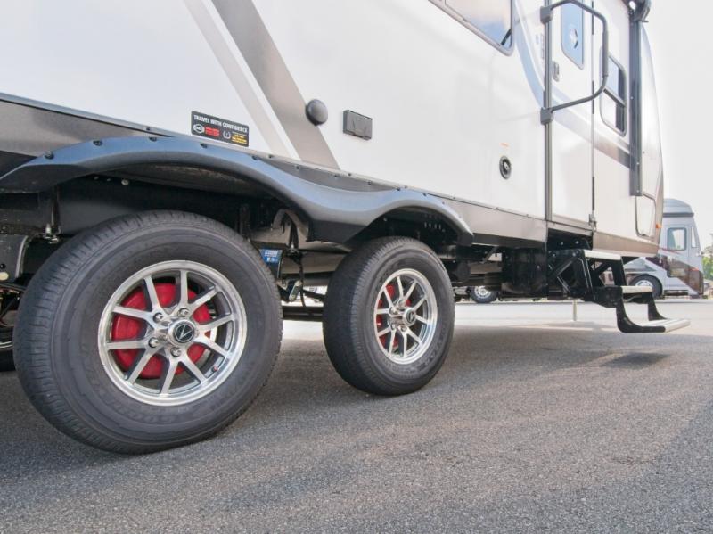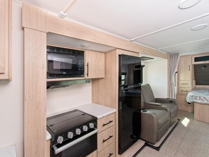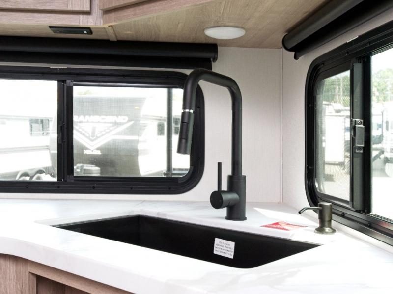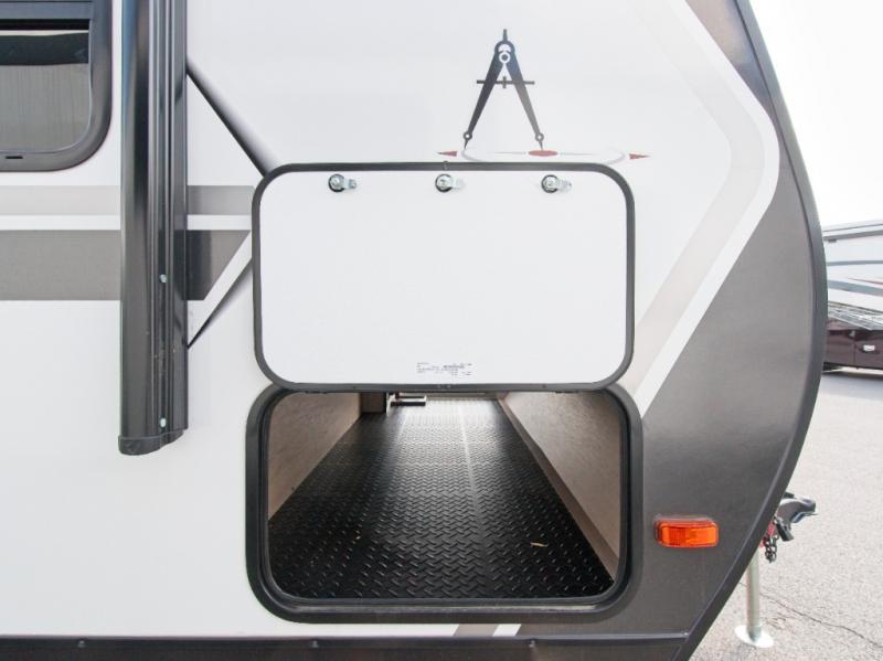 The rear kitchen and bathroom layout maximizes interior space, and the large slide-out opens up the living area for a roomy, residential feel. Step outside and enjoy the shade under the 18-foot electric awning, or access your gear easily with the unobstructed pass-through storage.