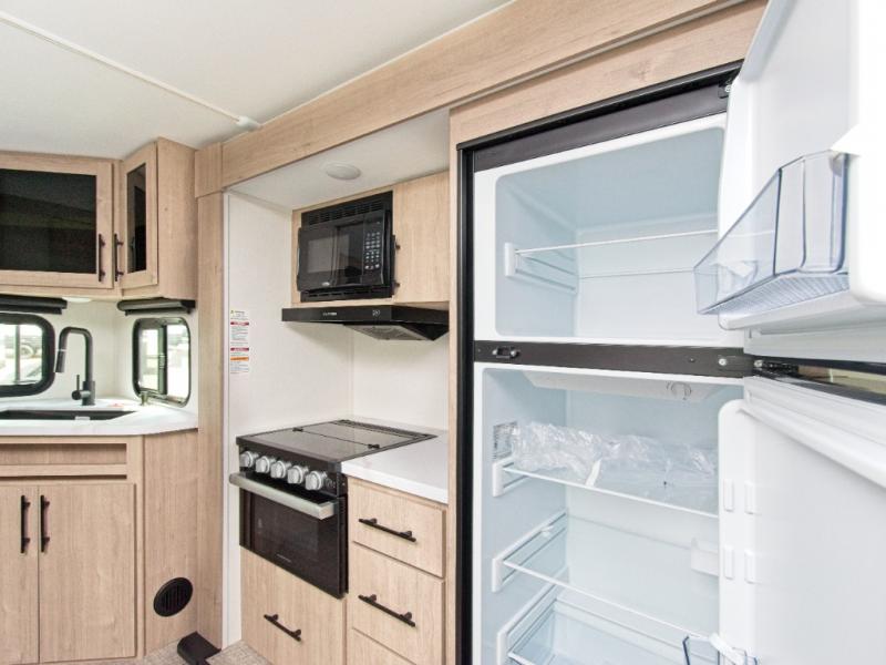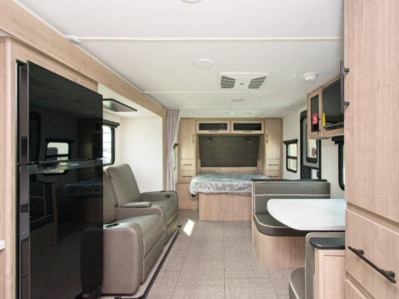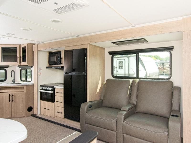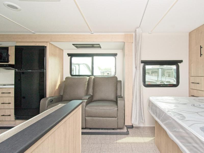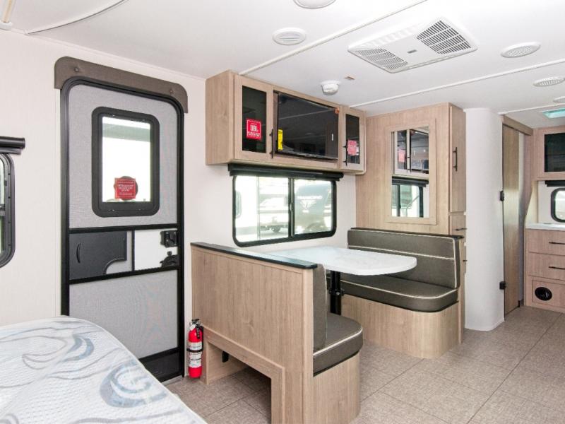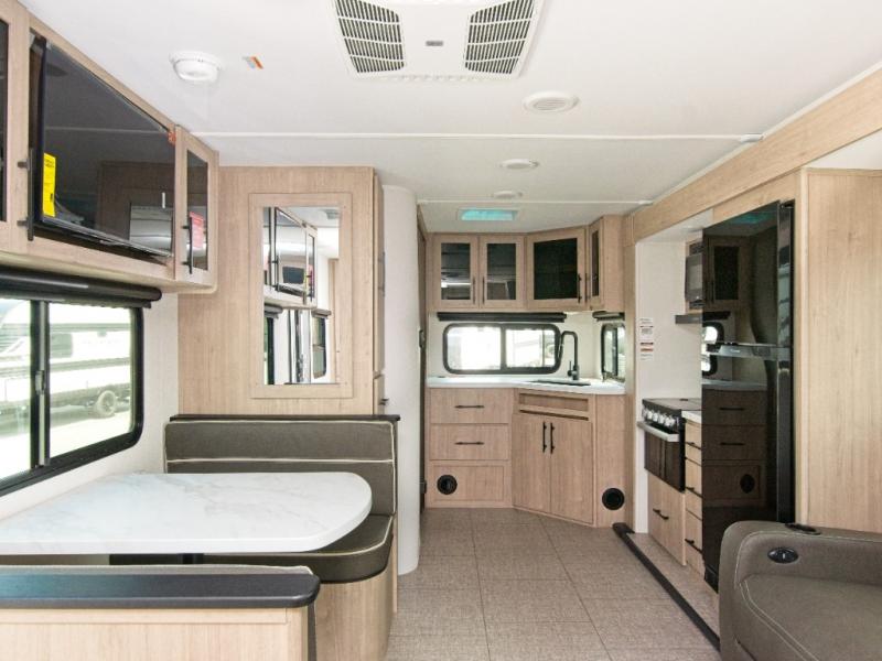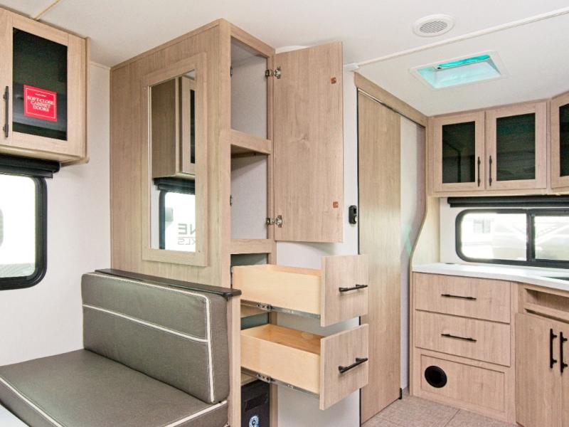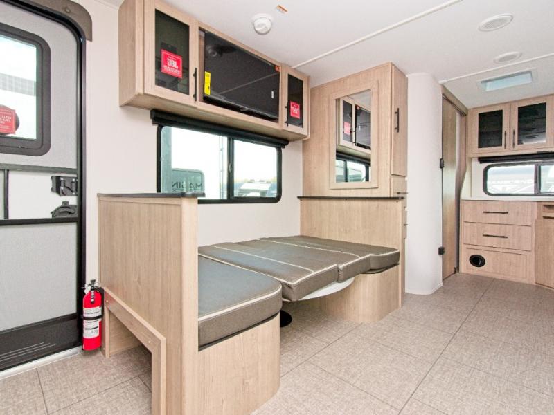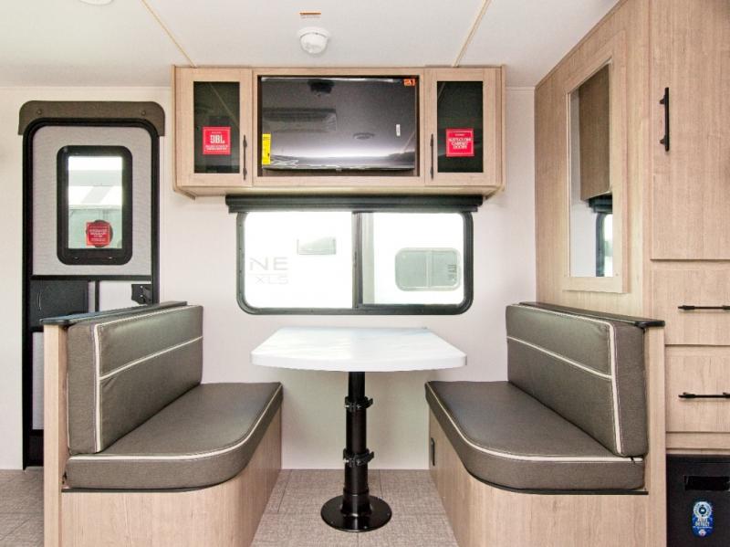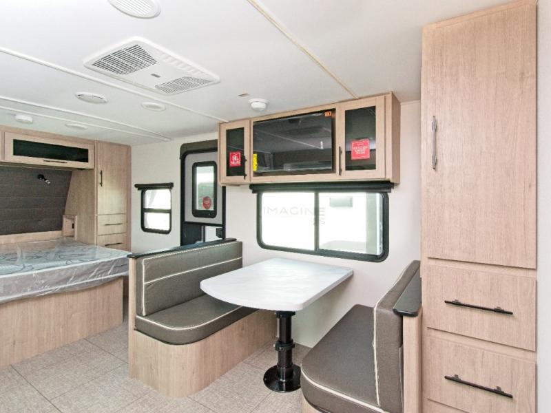 Whether you're sipping your morning coffee, planning your next destination, or winding down with a movie on the LED HDTV, the Imagine XLS 22MLE offers the perfect space to relax. The theatre seating and booth dinette provide versatile lounging and dining options, while the queen-size bed with a privacy curtain ensures restful nights.