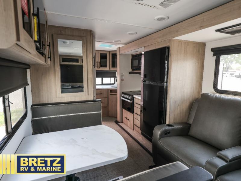 This Imagine XLS travel trailer has theater seating and a booth dinette that you can use any time you need a little break from the outdoors. If you want to come in and grab a coffee, put together a puzzle, or work on your itinerary for the week, just put up your feet and relax. You could even switch on the LED HDTV if you want a little entertainment. The front queen-size bed has a privacy curtain that you can draw to create a semi-private bedroom, and in the back of the trailer you will find the rest of your amenities, like the kitchen and the bathroom. The large slide makes it easy to enjoy spending your time indoors, but if you do want to get back outside, you can sit underneath the 18' electric awning for some shade.