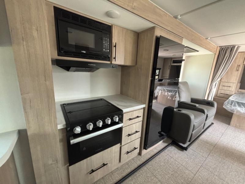 This Imagine XLS travel trailer has theater seating and a booth dinette that you can use any time you need a little break from the outdoors. If you want to come in and grab a coffee, put together a puzzle, or work on your itinerary for the week, just put up your feet and relax. You could even switch on the LED HDTV if you want a little entertainment. The front queen-size bed has a privacy curtain that you can draw to create a semi-private bedroom, and in the back of the trailer you will find the rest of your amenities, like the kitchen and the bathroom. The large slide makes it easy to enjoy spending your time indoors, but if you do want to get back outside, you can sit underneath the 18' electric awning for some shade.