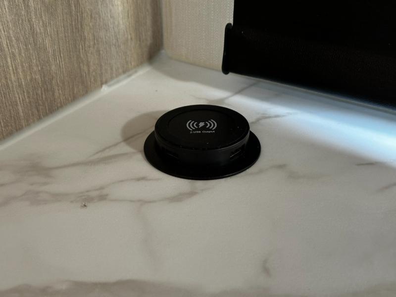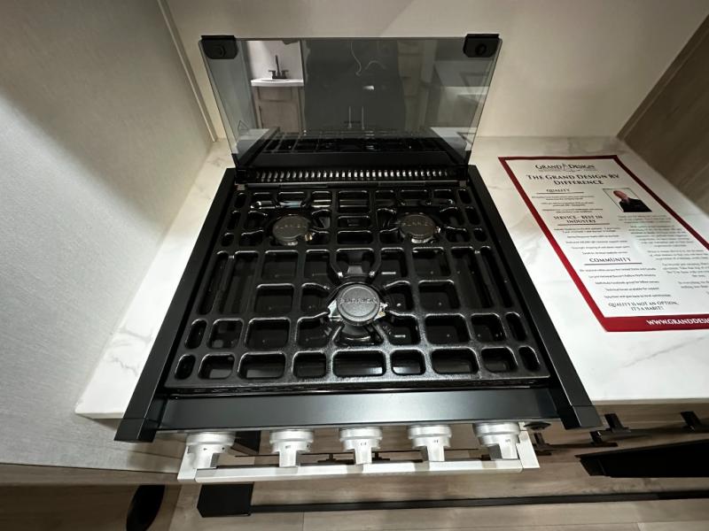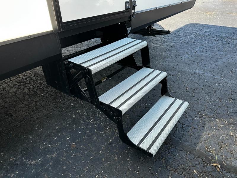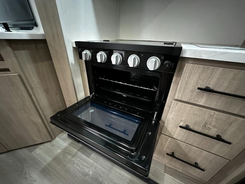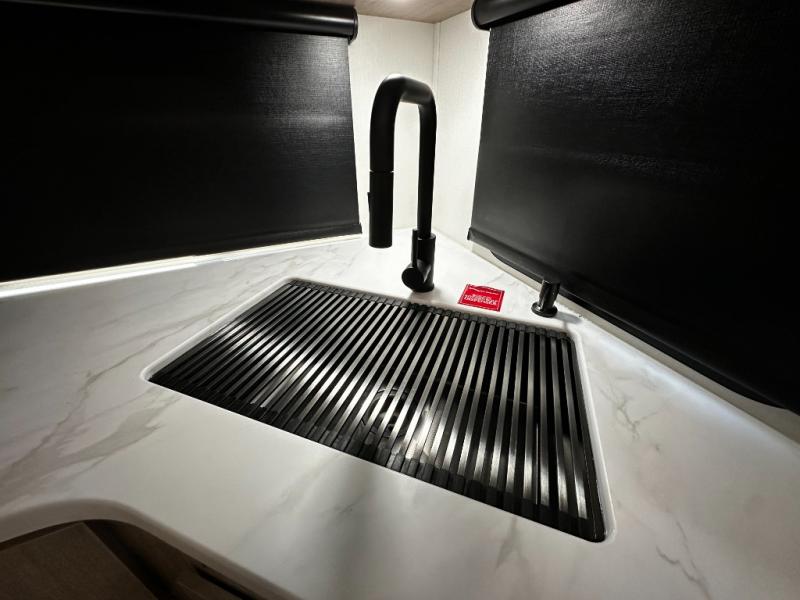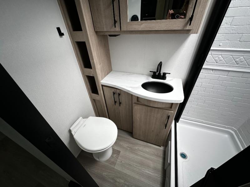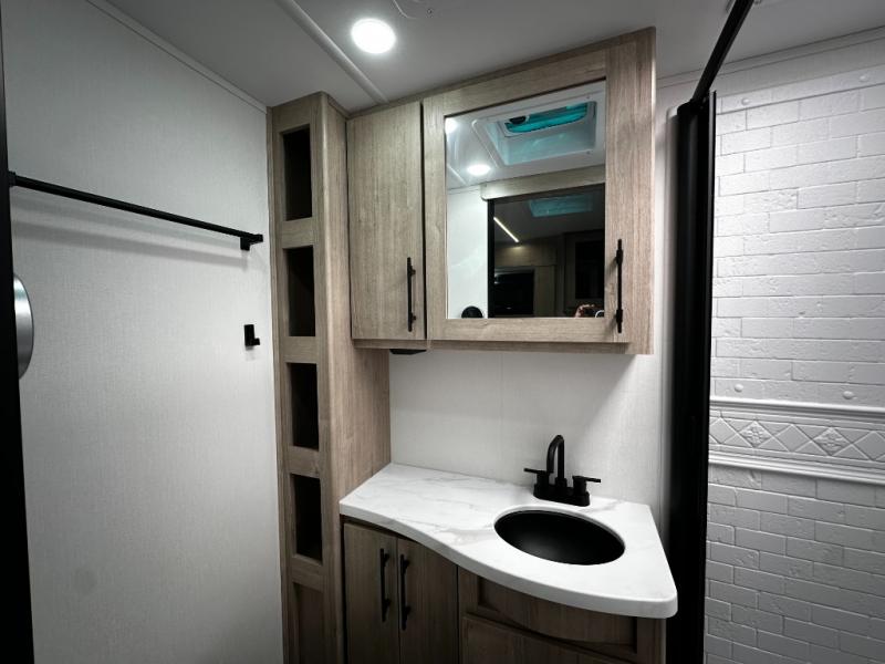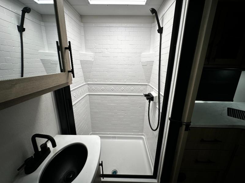 The rear corner bathroom includes a wide shower, vanity, and thoughtful storage. Designed with everyday usability in mind, it gives you the comfort and privacy you need on extended trips.