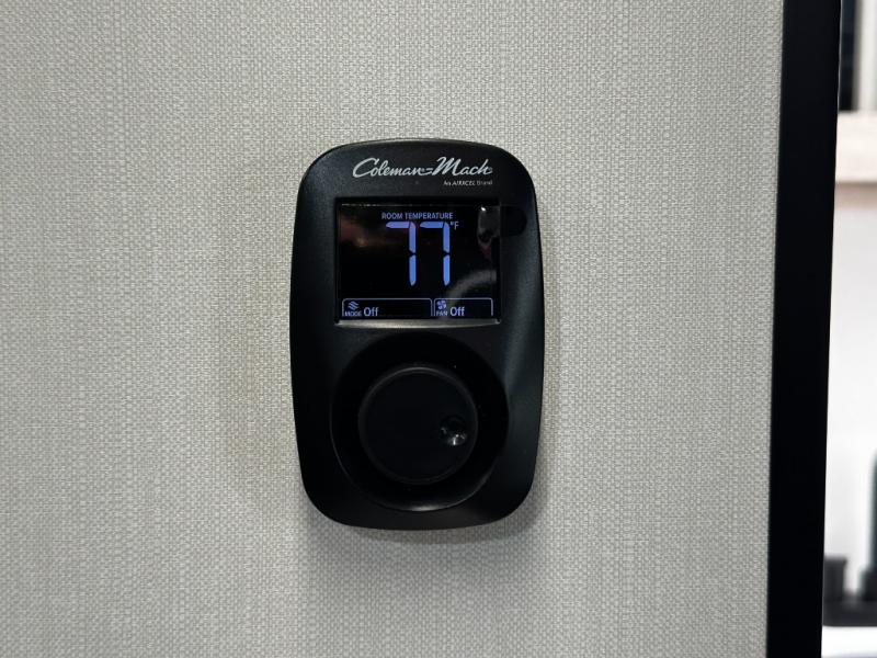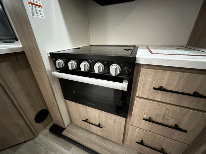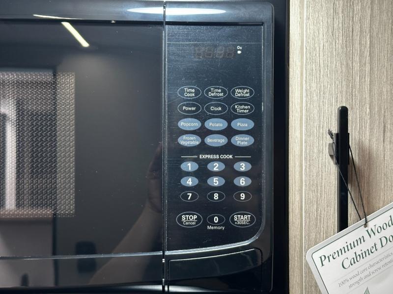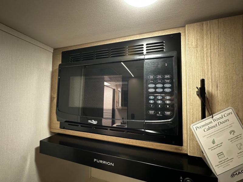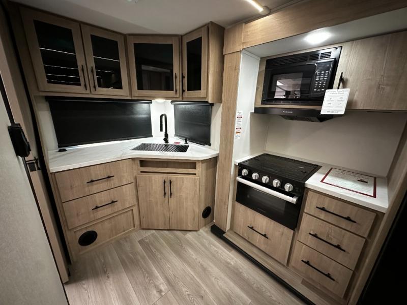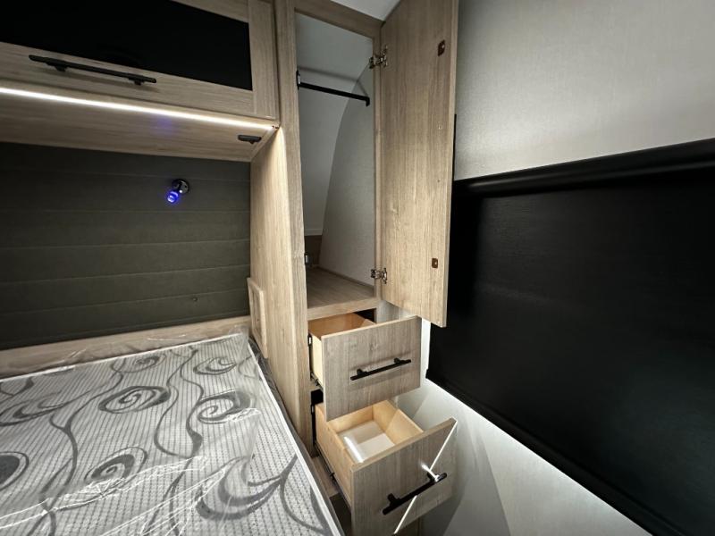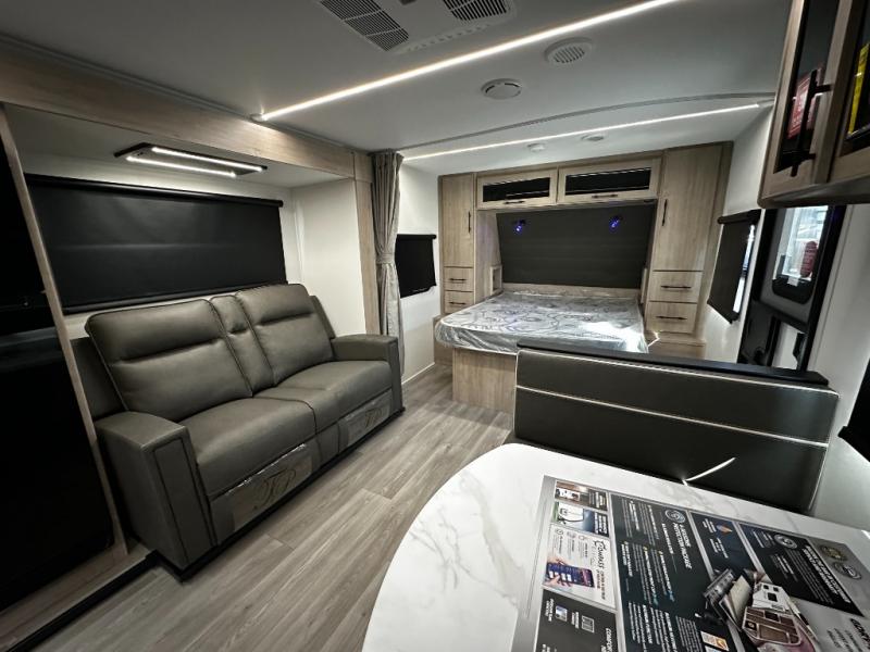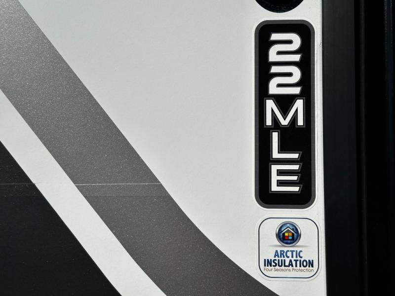 A standout feature of the 22MLE is its front walk-around queen bed, complete with overhead cabinets, bedside wardrobes, and privacy curtains. This dedicated sleeping space offers a peaceful retreat without compromising the trailer's compact footprint.
