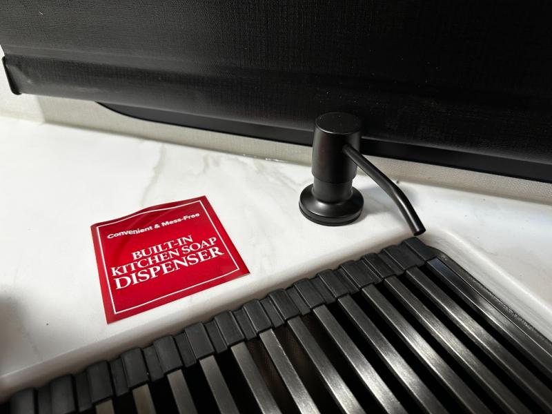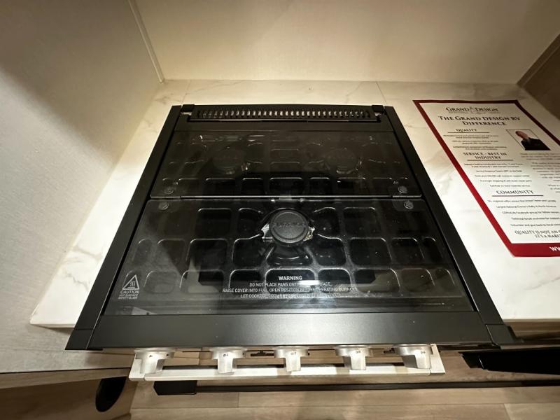 The kitchen is designed with ample countertop space, a deep stainless-steel sink, a residential microwave, spacious cabinetry, and a two-door refrigerator that makes meal prep simple and enjoyable. Whether you're cooking breakfast before hitting the trails or preparing dinner after a long day, everything you need is thoughtfully laid out for maximum convenience.