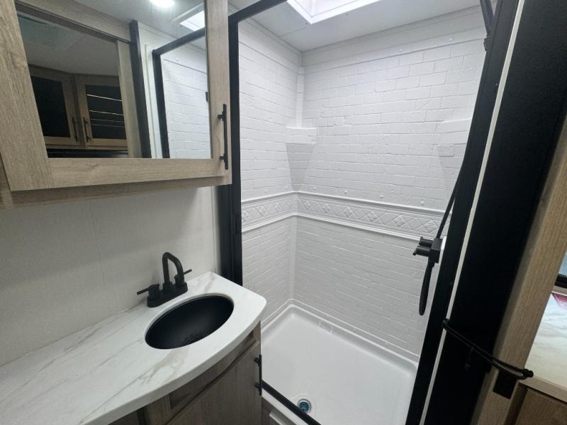 Full Rear Bathroom – Refresh in comfort with a residential-style shower, vanity, and linen storage.