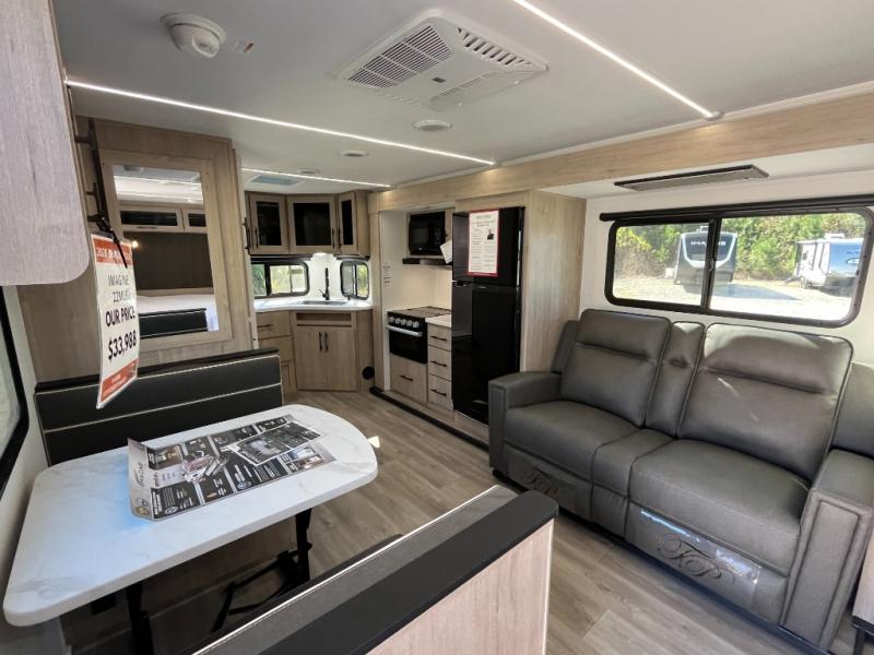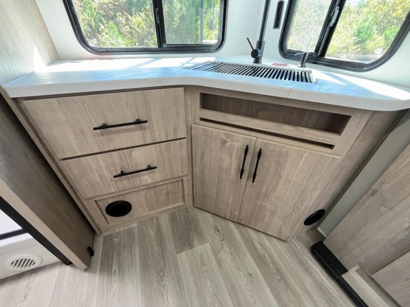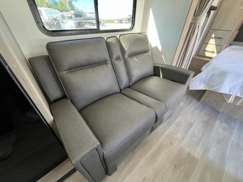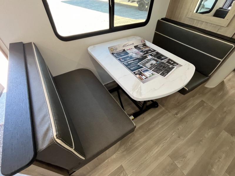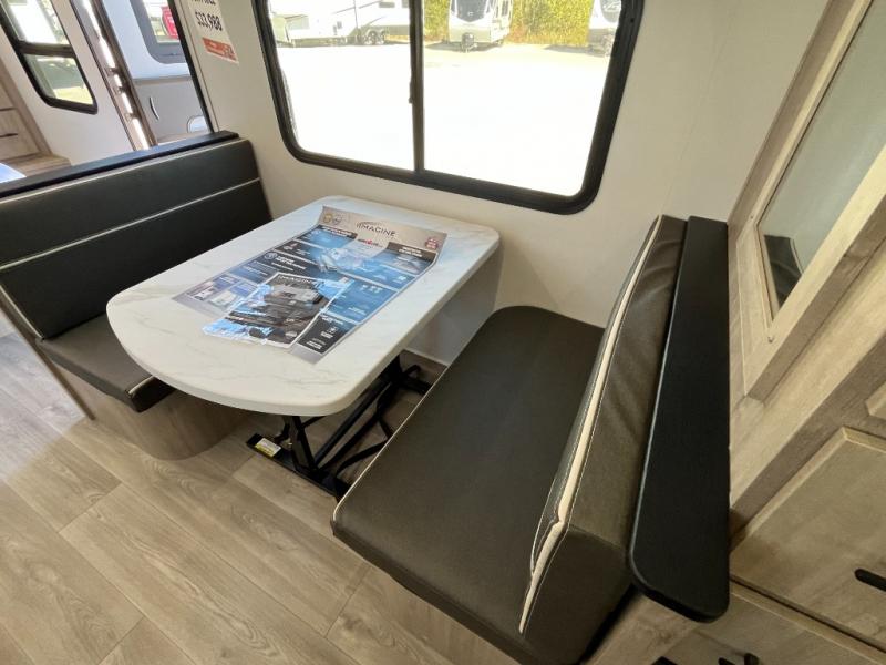 This Imagine XLS travel trailer has theater seating and a booth dinette that you can use any time you need a little break from the outdoors. If you want to come in and grab a coffee, put together a puzzle, or work on your itinerary for the week, just put up your feet and relax. You could even switch on the LED HDTV if you want a little entertainment. The front queen-size bed has a privacy curtain that you can draw to create a semi-private bedroom, and in the back of the trailer you will find the rest of your amenities, like the kitchen and the bathroom. The large slide makes it easy to enjoy spending your time indoors, but if you do want to get back outside, you can sit underneath the 18' electric awning for some shade.