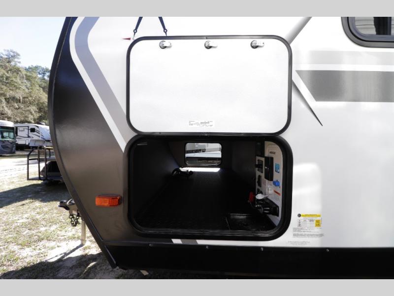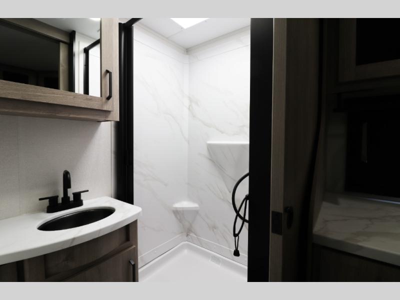 • Full Bath Comfort – Rear bathroom with a 27" x 36" shower adds convenience and comfort on the road.