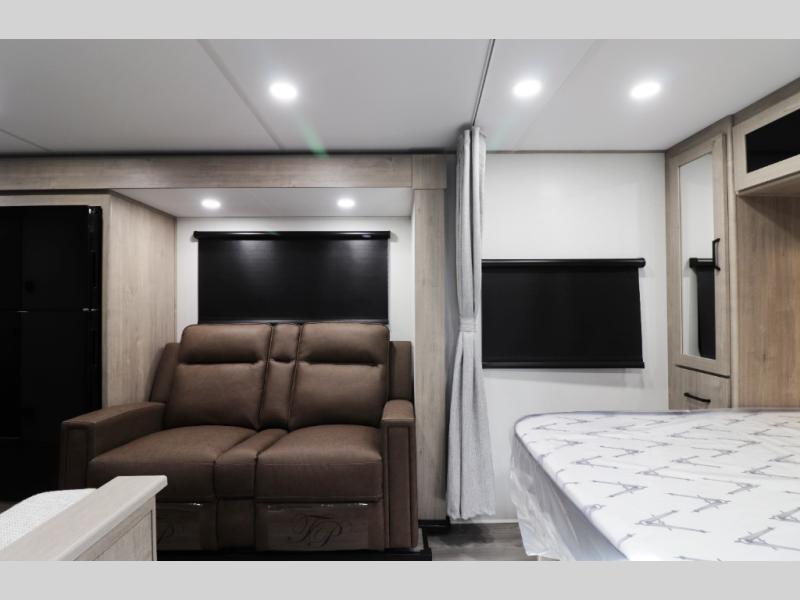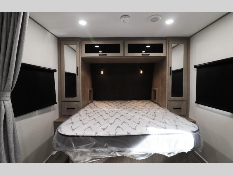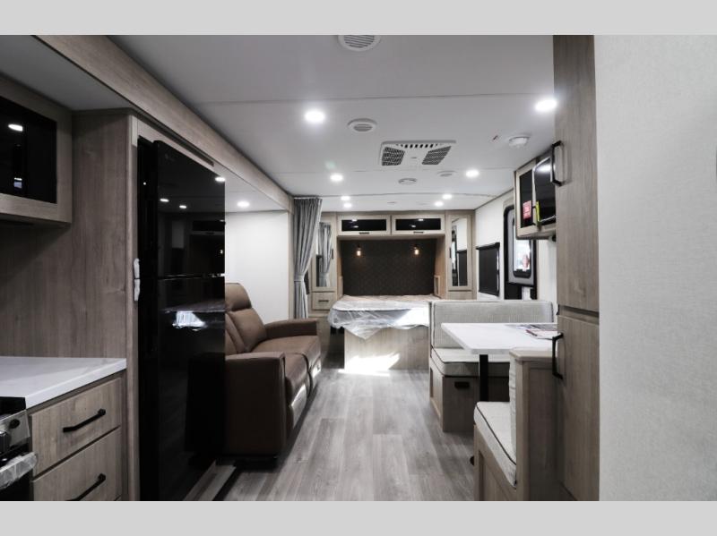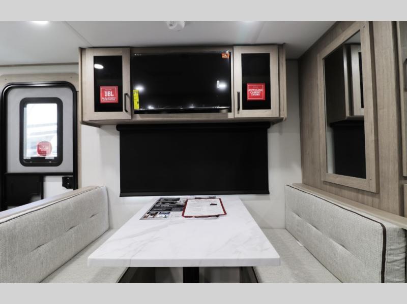 • Comfort-Focused Interior – Spacious queen bed with privacy curtain, plush theater seating, and a versatile booth dinette perfect for dining, games, or plans for tomorrow’s adventure.