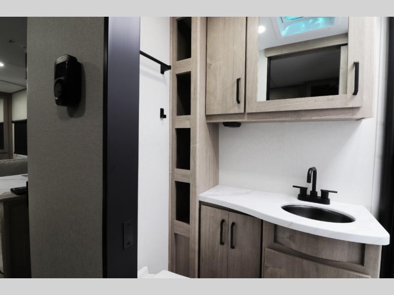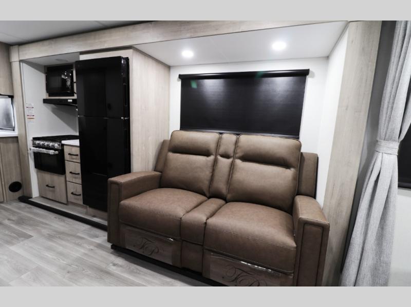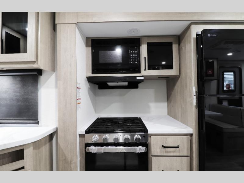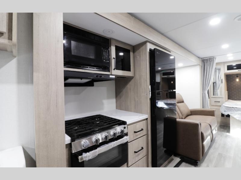 • Modern Kitchen – Well-appointed kitchen with a 3-burner cooktop, generous counter space, and a 12V 10 cu. ft. refrigerator for all your meals and snacks.