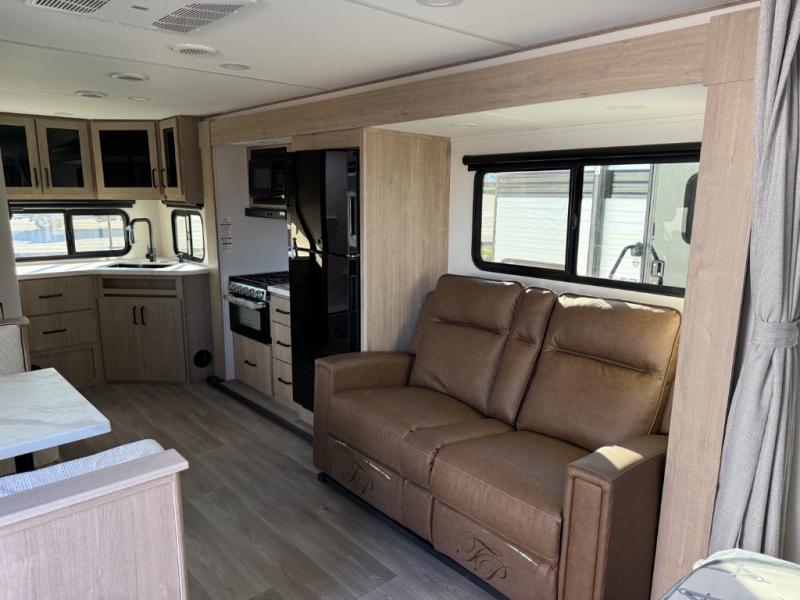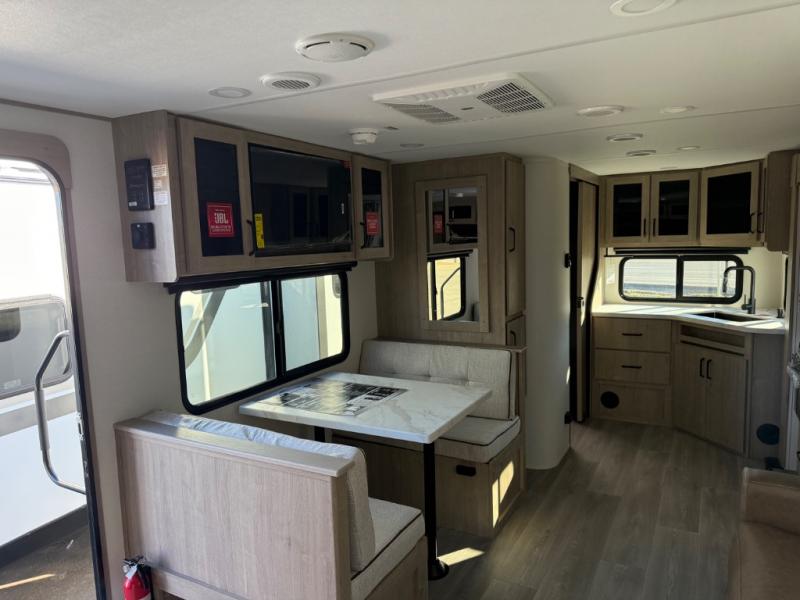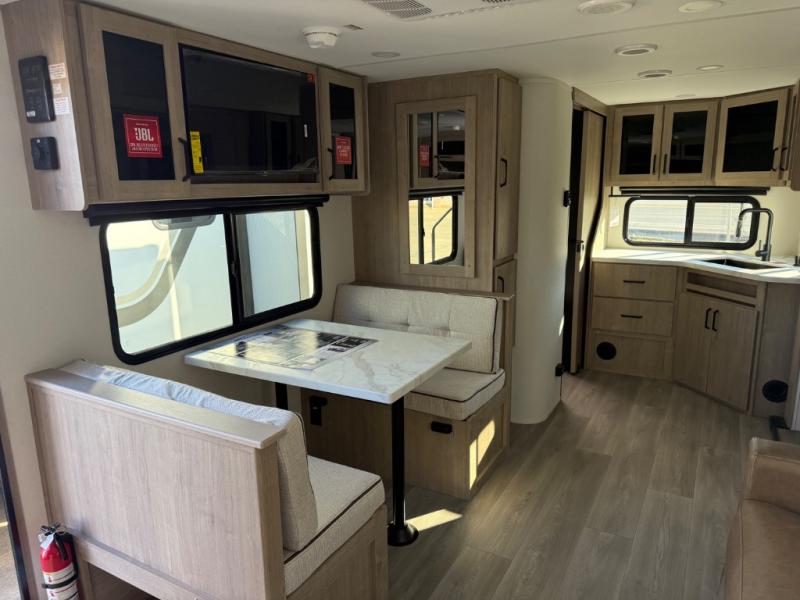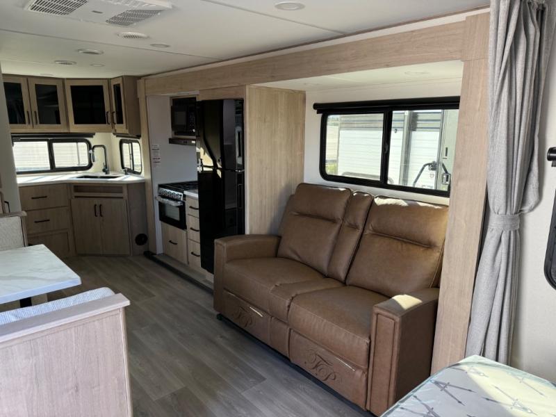 This Imagine XLS travel trailer has theater seating and a booth dinette that you can use any time you need a little break from the outdoors. If you want to come in and grab a coffee, put together a puzzle, or work on your itinerary for the week, just put up your feet and relax. You could even switch on the LED HDTV if you want a little entertainment. The front queen-size bed has a privacy curtain that you can draw to create a semi-private bedroom, and in the back of the trailer you will find the rest of your amenities, like the kitchen and the bathroom. The large slide makes it easy to enjoy spending your time indoors, but if you do want to get back outside, you can sit underneath the 18' electric awning for some shade.