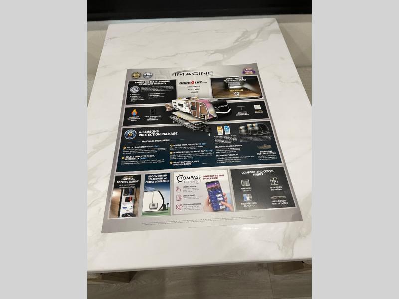 Let your imagination run wild with the possibilities that the Grand Design Imagine XLS travel trailer can provide! The Imagine XLS has been built with oversized tank capacities, an extra-large 2" fresh water drain valve, a ducted A/C system, a power tongue jack, and a heated and enclosed underbelly with suspended tanks. There is a designated heat duct to the subfloor and a residential ductless heating system throughout. For outdoor adventures, the electric awning with LED lights will enable you to stay protected, and the Tuff-Ply pass-thru flooring will withstand your adventures. You will also love the XLS Solar Package that comes with a 200W roof mounted solar panel, a 30 Amp charge controller, a 12V 10 cu. ft. refrigerator, and roof mounted quick connect plugs!