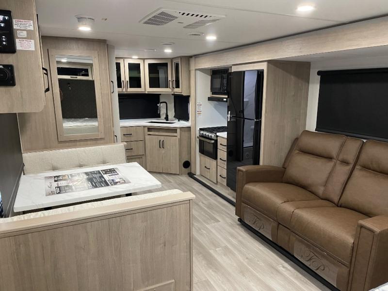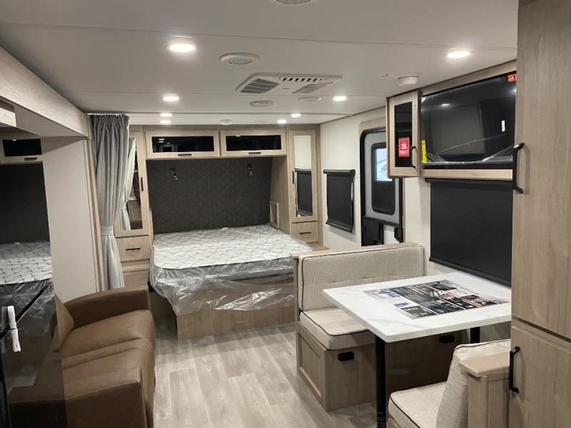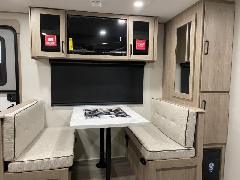This Imagine XLS travel trailer has theater seating and a booth dinette that you can use any time you need a little break from the outdoors. If you want to come in and grab a coffee, put together a puzzle, or work on your itinerary for the week, just put up your feet and relax. You could even switch on the LED HDTV if you want a little entertainment. The front queen-size bed has a privacy curtain that you can draw to create a semi-private bedroom, and in the back of the trailer you will find the rest of your amenities, like the kitchen and the bathroom. The large slide makes it easy to enjoy spending your time indoors, but if you do want to get back outside, you can sit underneath the 18' electric awning for some shade.
