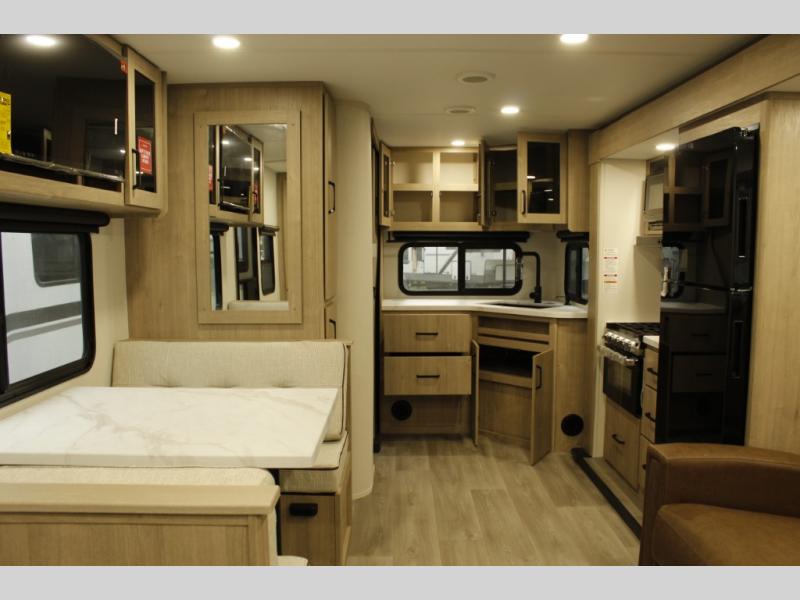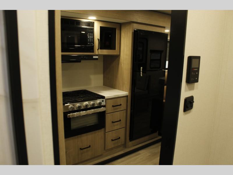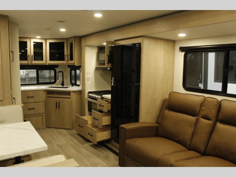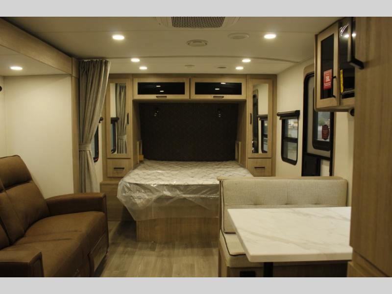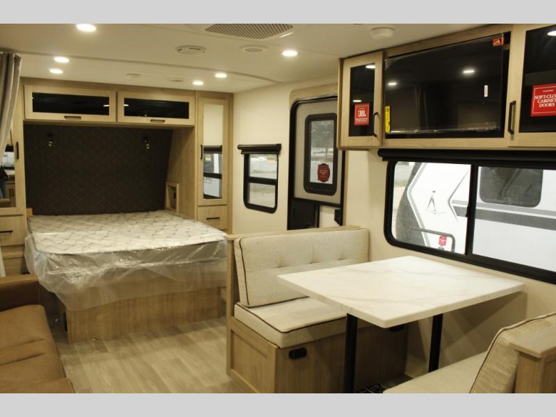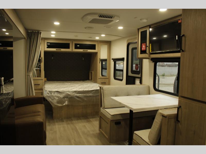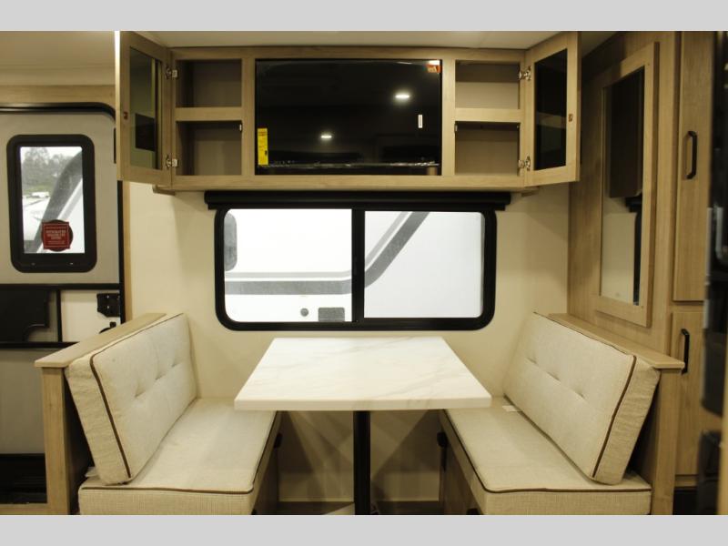 This Imagine XLS travel trailer has theater seating and a booth dinette that you can use any time you need a little break from the outdoors. If you want to come in and grab a coffee, put together a puzzle, or work on your itinerary for the week, just put up your feet and relax. You could even switch on the LED HDTV if you want a little entertainment. The front queen-size bed has a privacy curtain that you can draw to create a semi-private bedroom, and in the back of the trailer you will find the rest of your amenities, like the kitchen and the bathroom. The large slide makes it easy to enjoy spending your time indoors, but if you do want to get back outside, you can sit underneath the 18' electric awning for some shade.