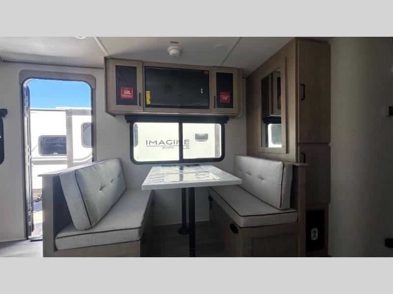 This Imagine XLS travel trailer has theater seating and a booth dinette that you can use any time you need a little break from the outdoors. If you want to come in and grab a coffee, put together a puzzle, or work on your itinerary for the week, just put up your feet and relax. You could even switch on the LED HDTV if you want a little entertainment. The front queen-size bed has a privacy curtain that you can draw to create a semi-private bedroom, and in the back of the trailer you will find the rest of your amenities, like the kitchen and the bathroom. The large slide makes it easy to enjoy spending your time indoors, but if you do want to get back outside, you can sit underneath the 18' electric awning for some shade.