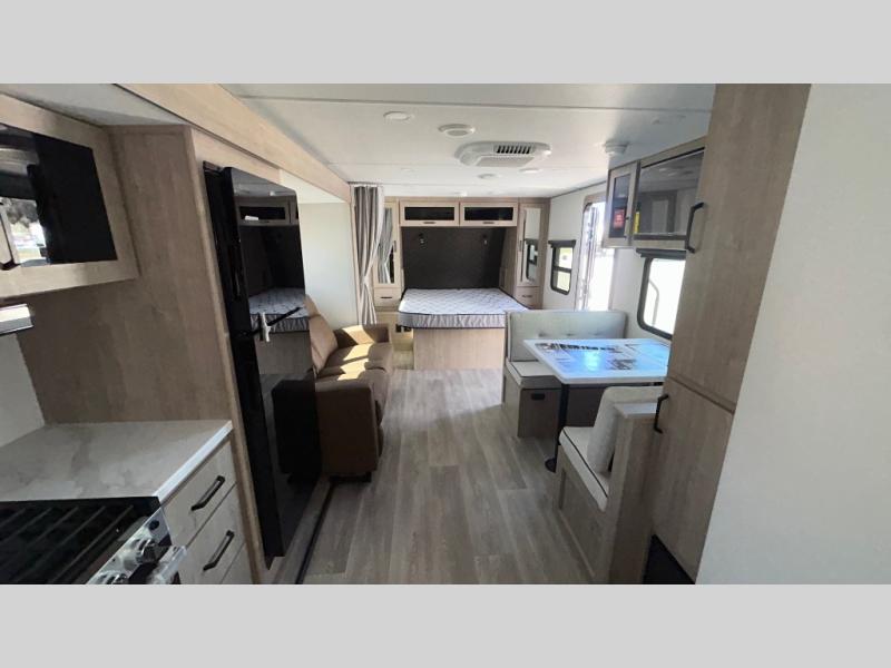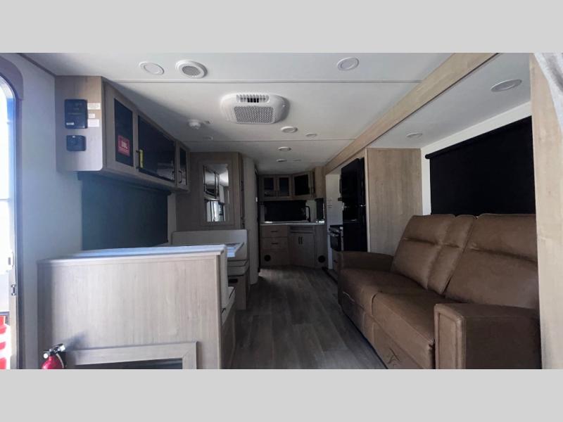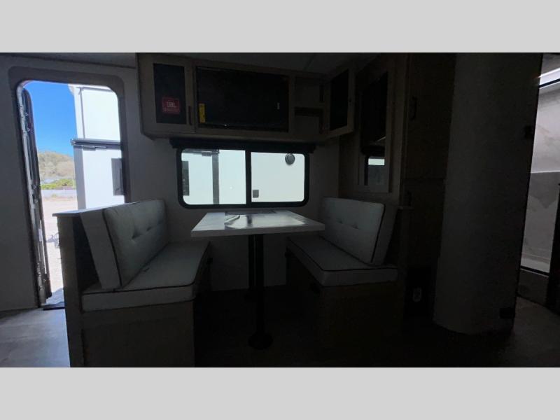 This Imagine XLS travel trailer has theater seating and a booth dinette that you can use any time you need a little break from the outdoors. If you want to come in and grab a coffee, put together a puzzle, or work on your itinerary for the week, just put up your feet and relax. You could even switch on the LED HDTV if you want a little entertainment. The front queen-size bed has a privacy curtain that you can draw to create a semi-private bedroom, and in the back of the trailer you will find the rest of your amenities, like the kitchen and the bathroom. The large slide makes it easy to enjoy spending your time indoors, but if you do want to get back outside, you can sit underneath the 18' electric awning for some shade.