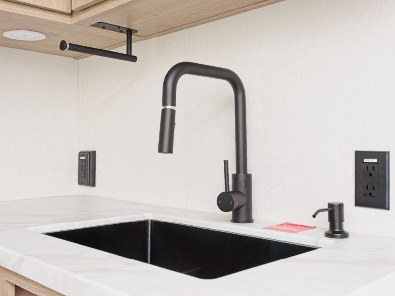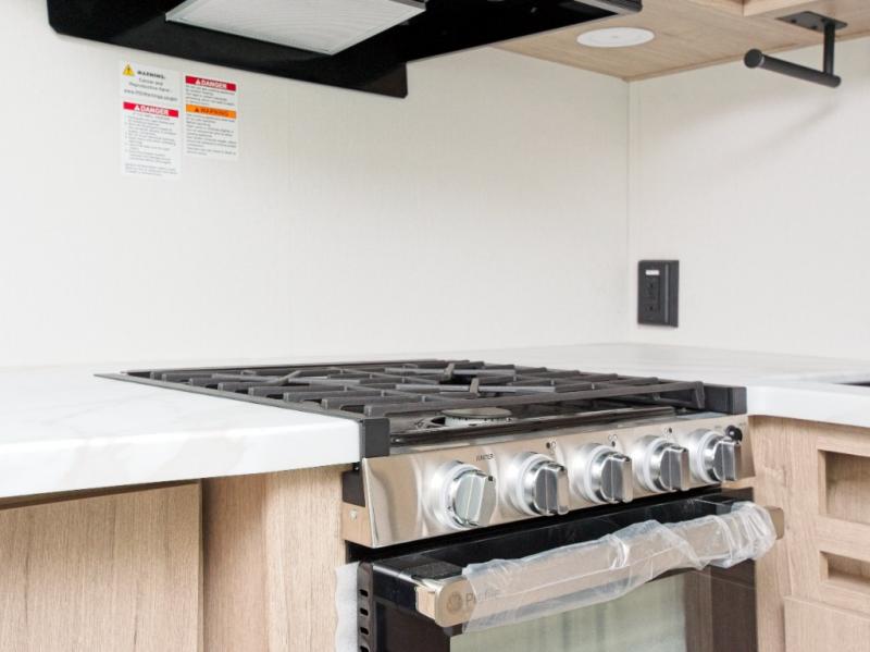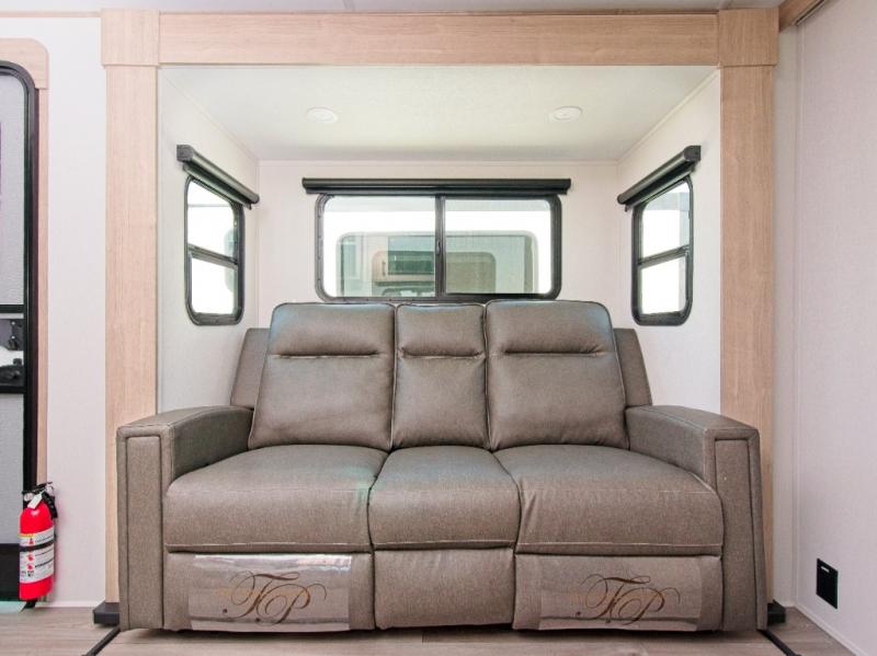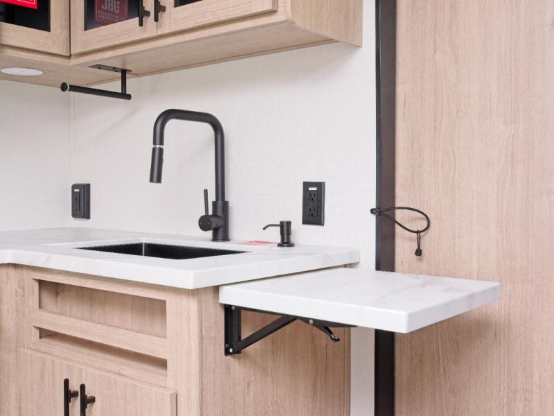The theater dinette provides a cozy spot for meals or movie nights, and the flip-up countertop extension adds extra prep space in the fully equipped kitchen. Outside, the spray port and electric awning with LED lighting make outdoor living easy and enjoyable. Plus, the unobstructed pass-through storage ensures you can bring all your gear without compromise.